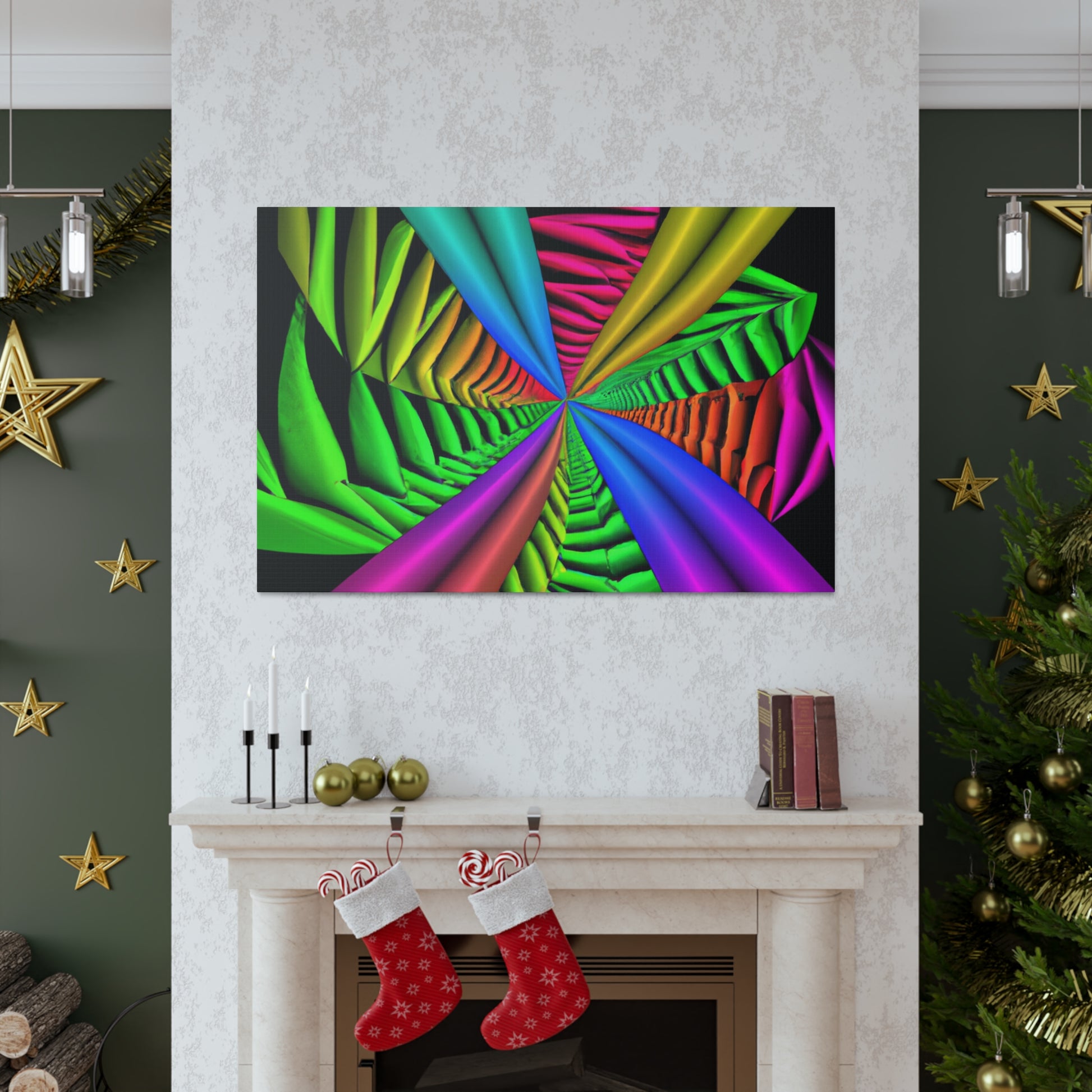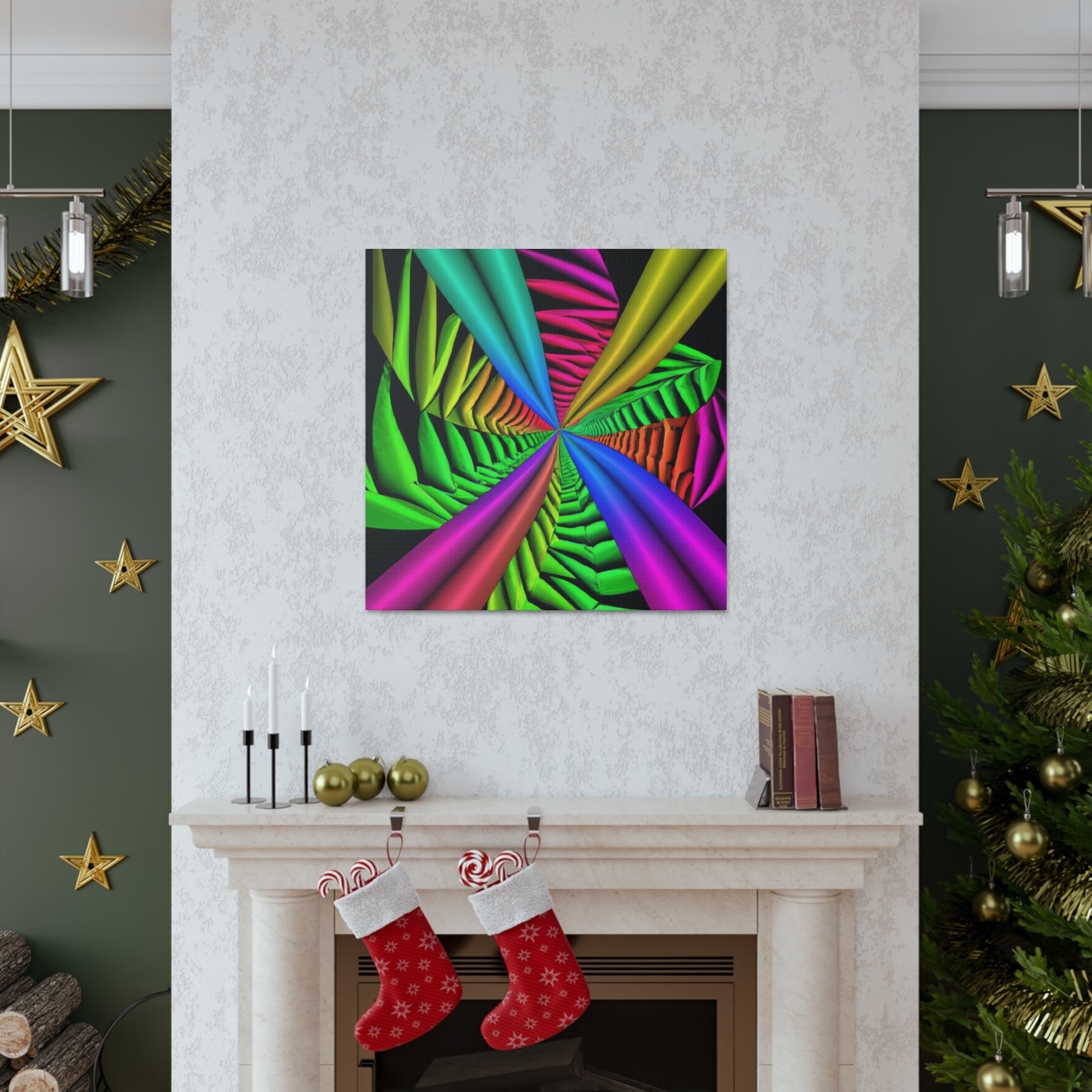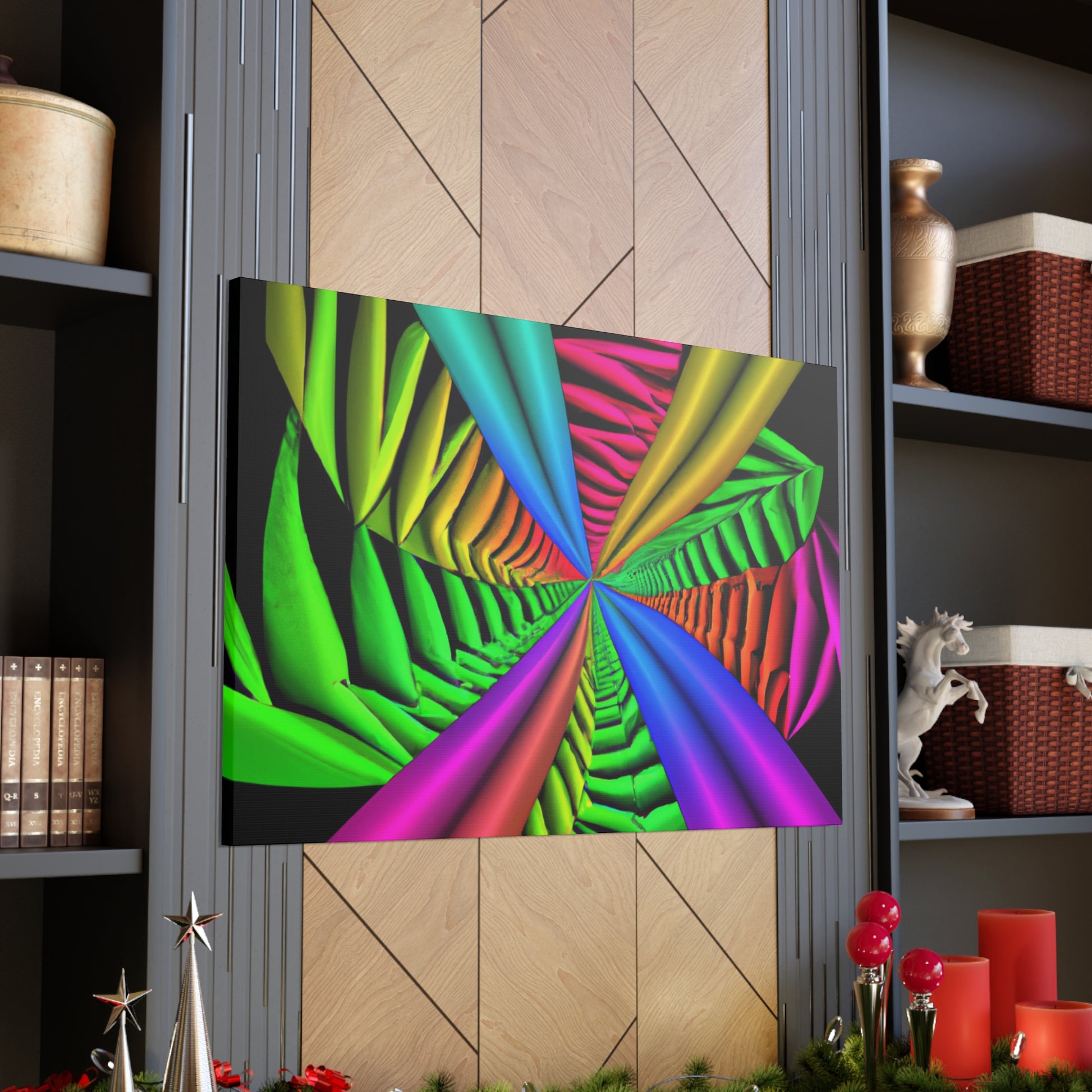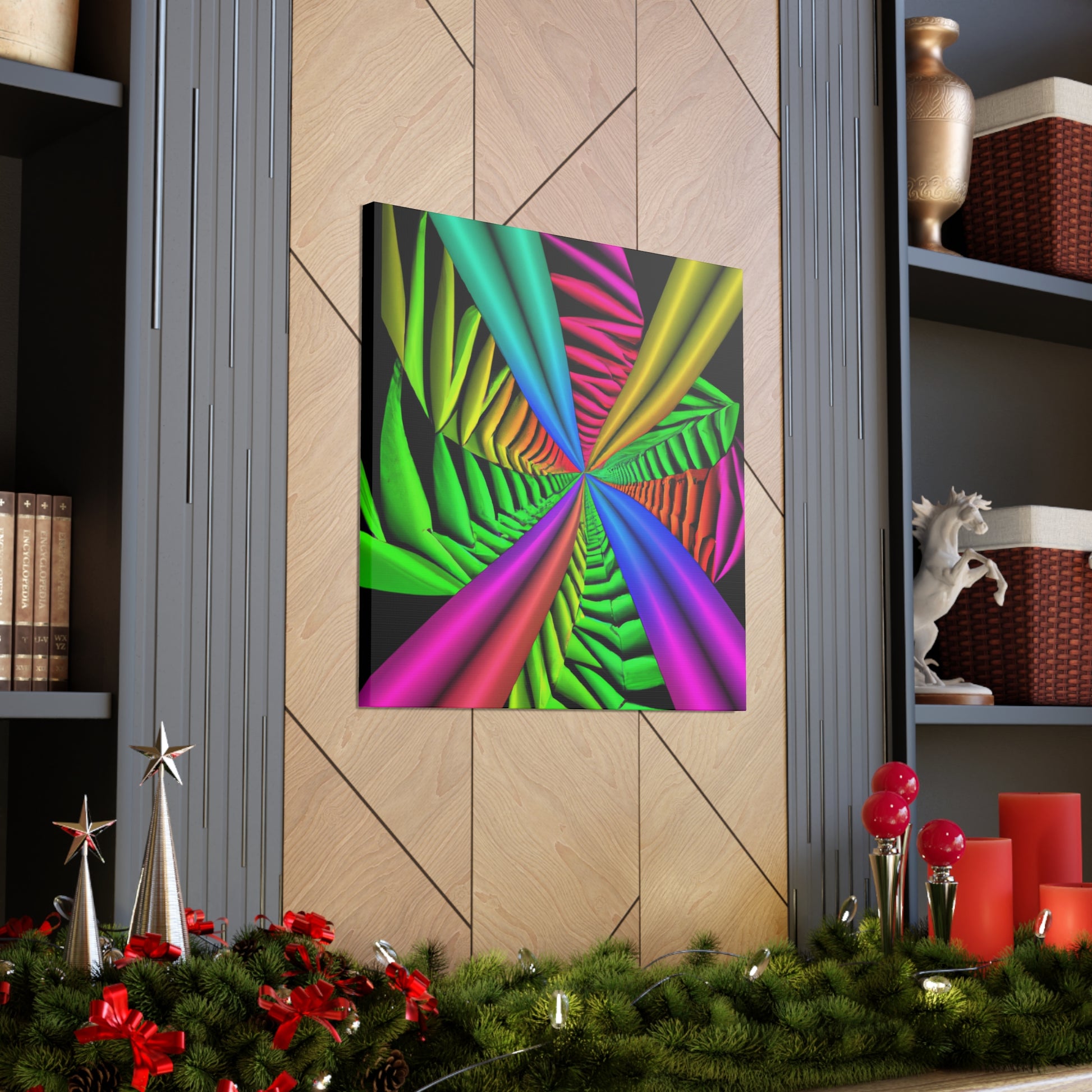 This canvas is a unique and vibrant addition to any wall. Featuring a captivating Trippy geometric palm leaves design, with kaleidoscope, abstract, digital art, vibrant colors, 3D lines, fractal, it is guaranteed to be a conversation starter. Hang this beautiful artwork to beautifully bring your room to life. #GeometricPalmLeaves #Kaleidoscope #Abstract #DigitalArt #VibrantColors #3DLines #Fractal #WallArt #CanvasArt #HomeDecor #InteriorDesign