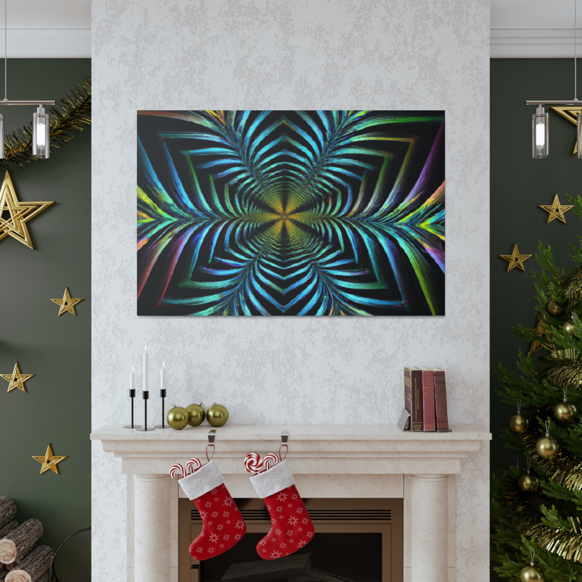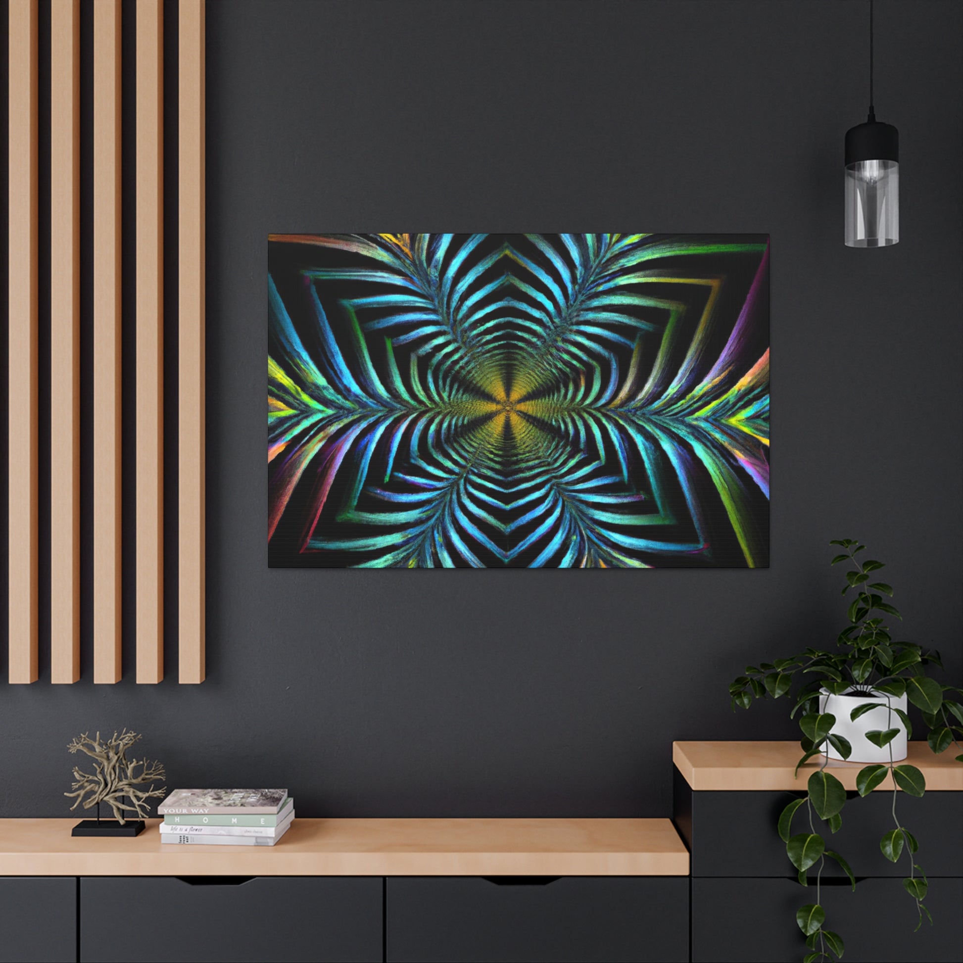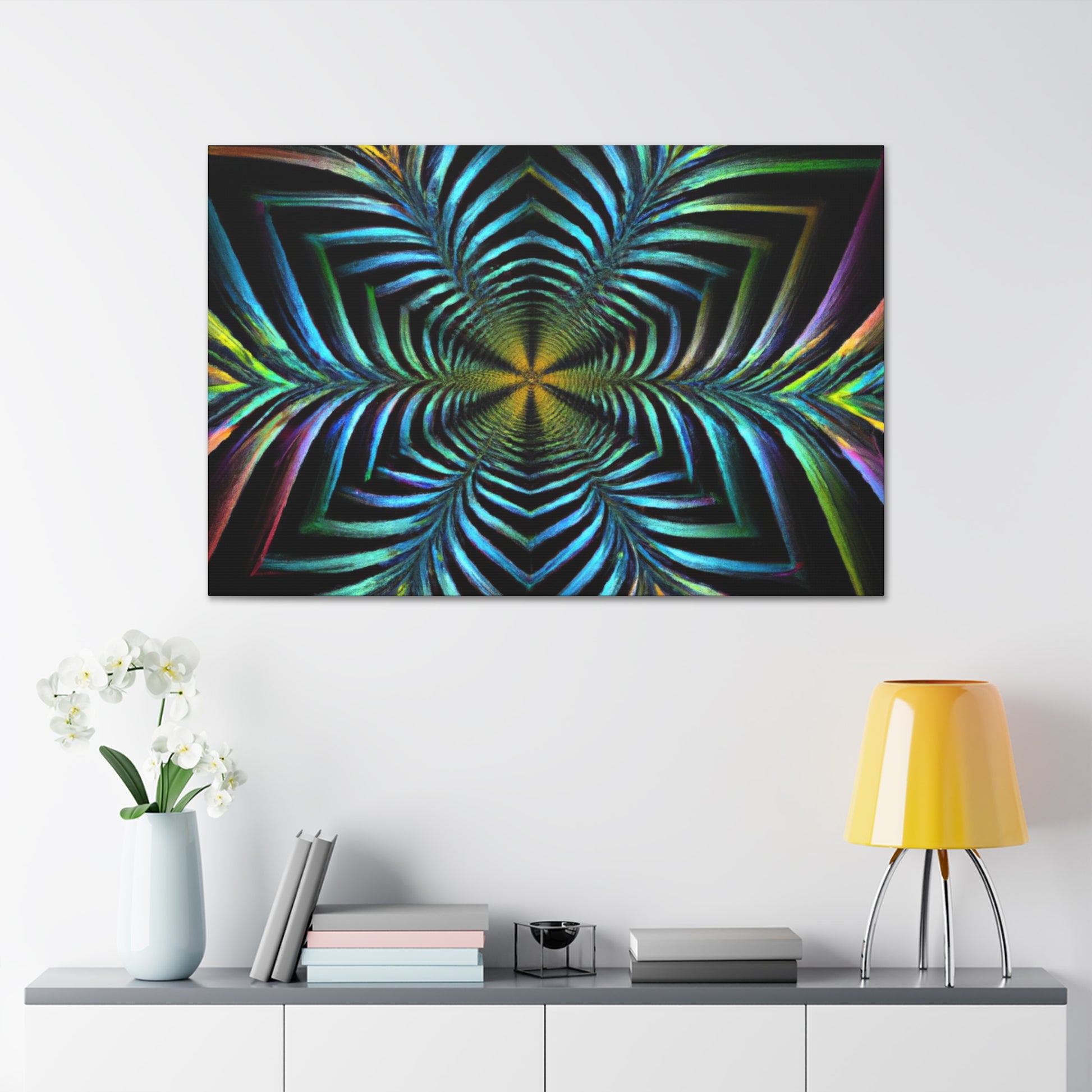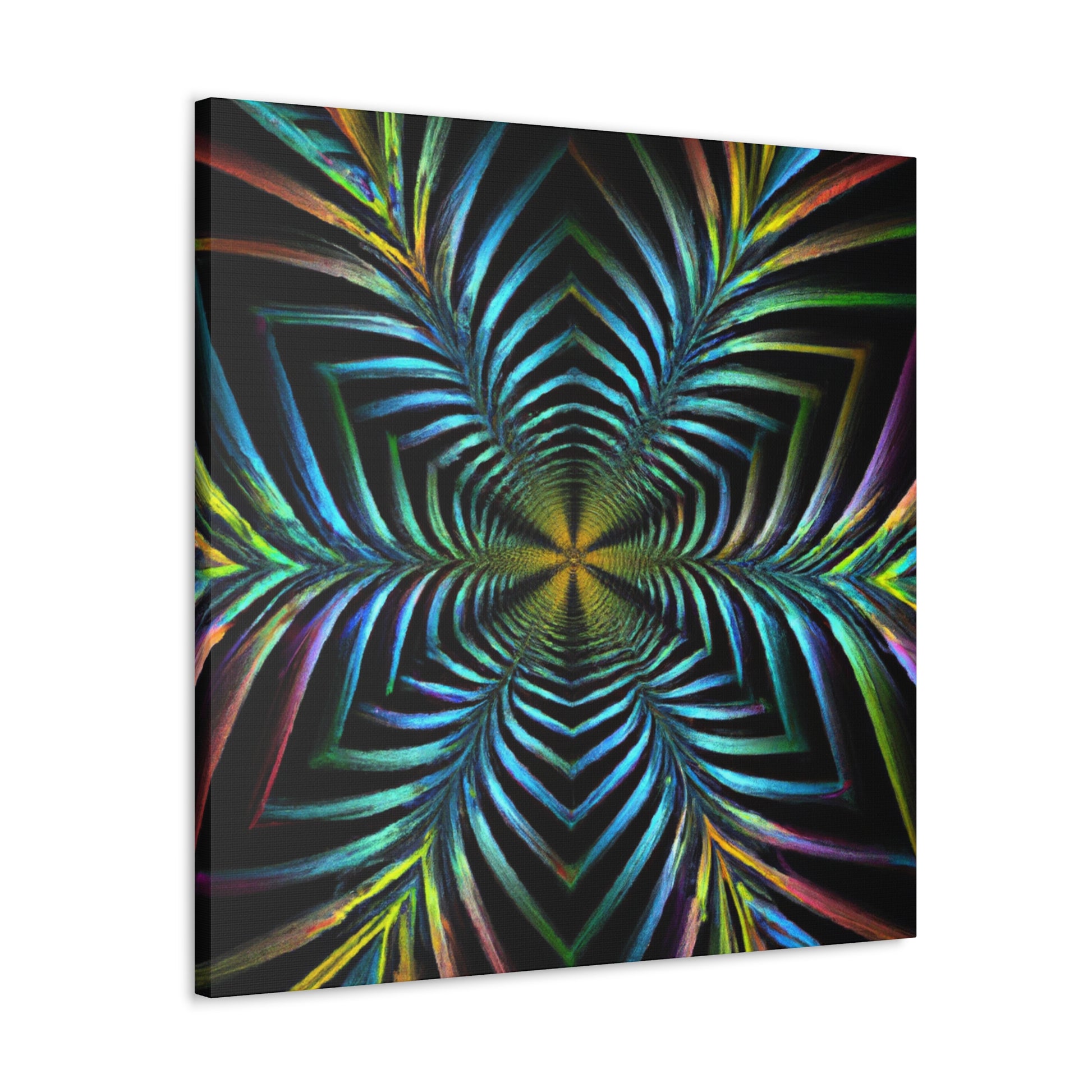 This trippy abstract canvas will take you on a journey and mesmerize any wall in your house with its 3D lines and vibrant colors. Featuring geometric palm leaves alongside kaleidoscopic fractals, it is sure to be a conversation starter! Make a statement with this gorgeous digital art and bring life to your home. #AbstractArtist #DigitalArt #GeometricPalmLeaves #Kaleidoscope #Fractals #3DLines #VibrantColors #Canvas #Décor #HomeFashion #ArtStatement