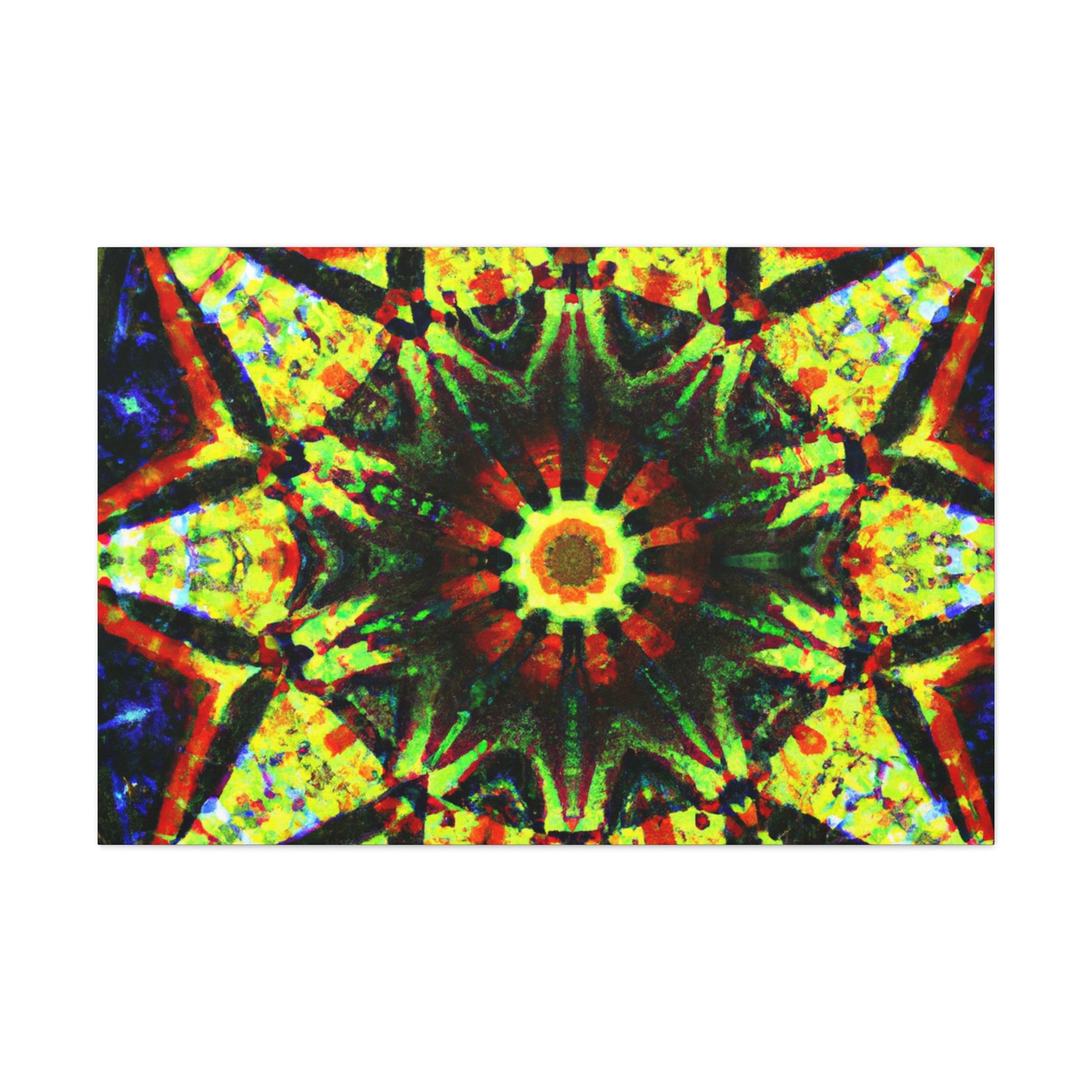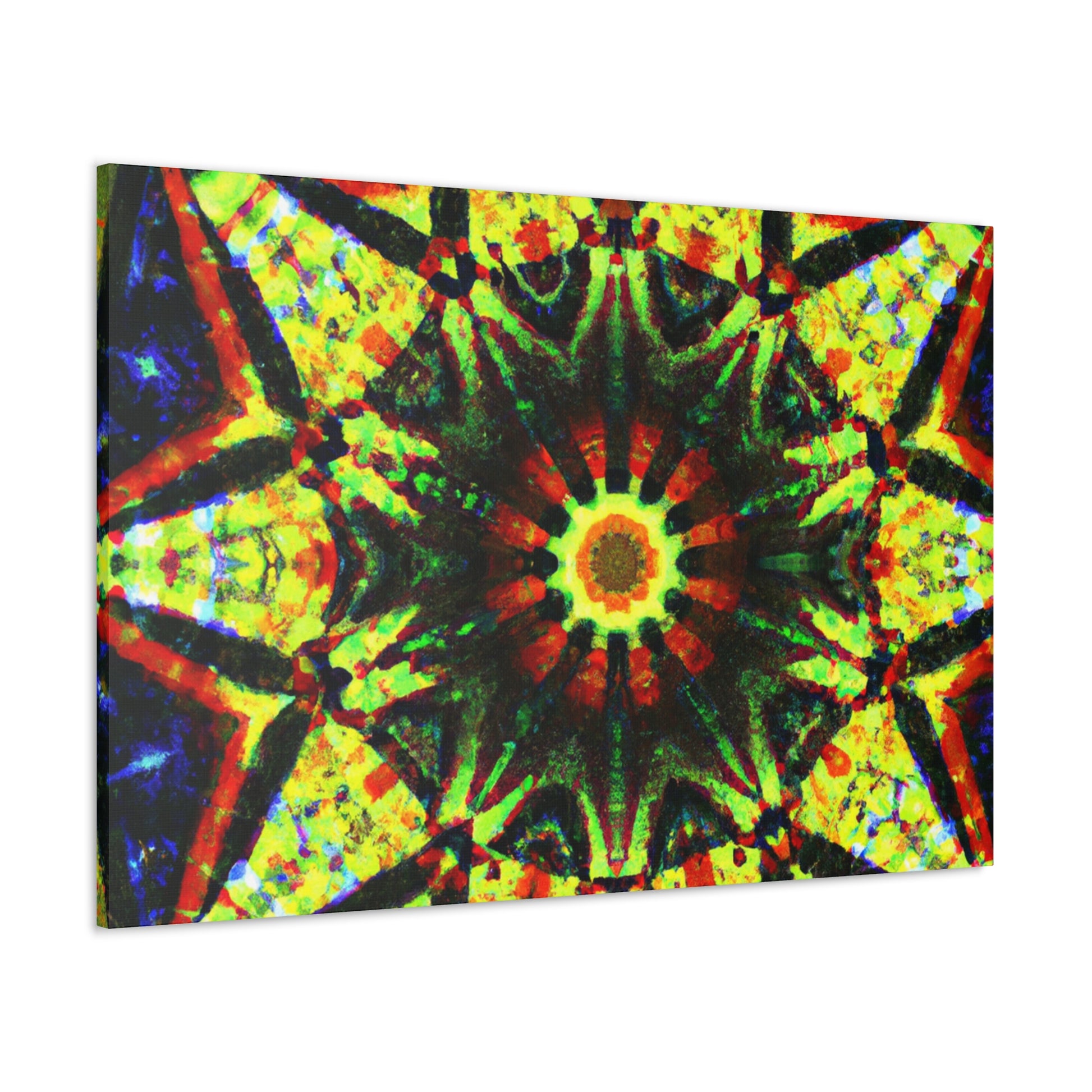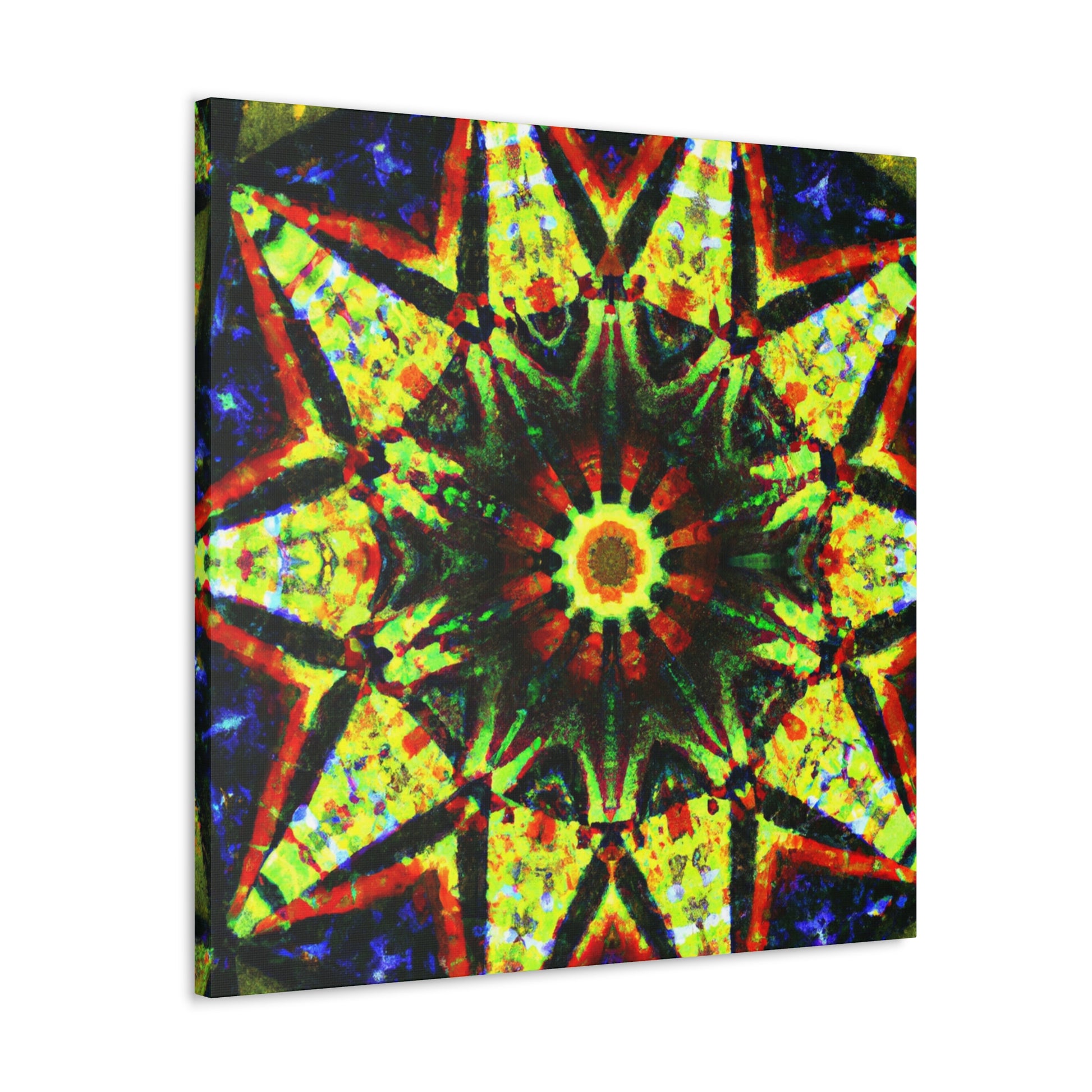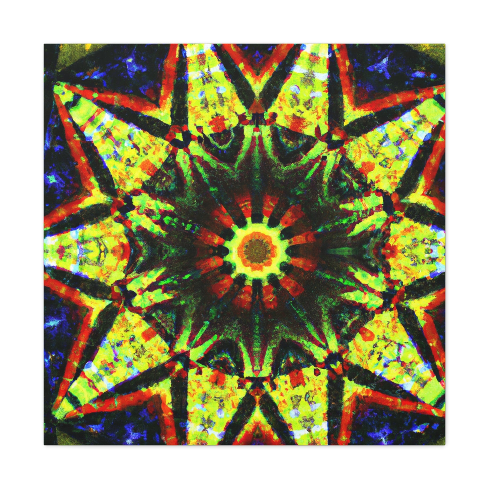 This vibrant canvas displays a dazzling digital art featuring abstract trippy stars and a dazzling kaleidoscope design! Made with high definition and saturated colors, the symmetrical artwork will be sure to liven up your space! Perfect for adding a bold statement to any wall. #canvas #digitalart #vibrant #HD #kaleidoscope #abstract #trippy #stars #symmetrical #home #statement