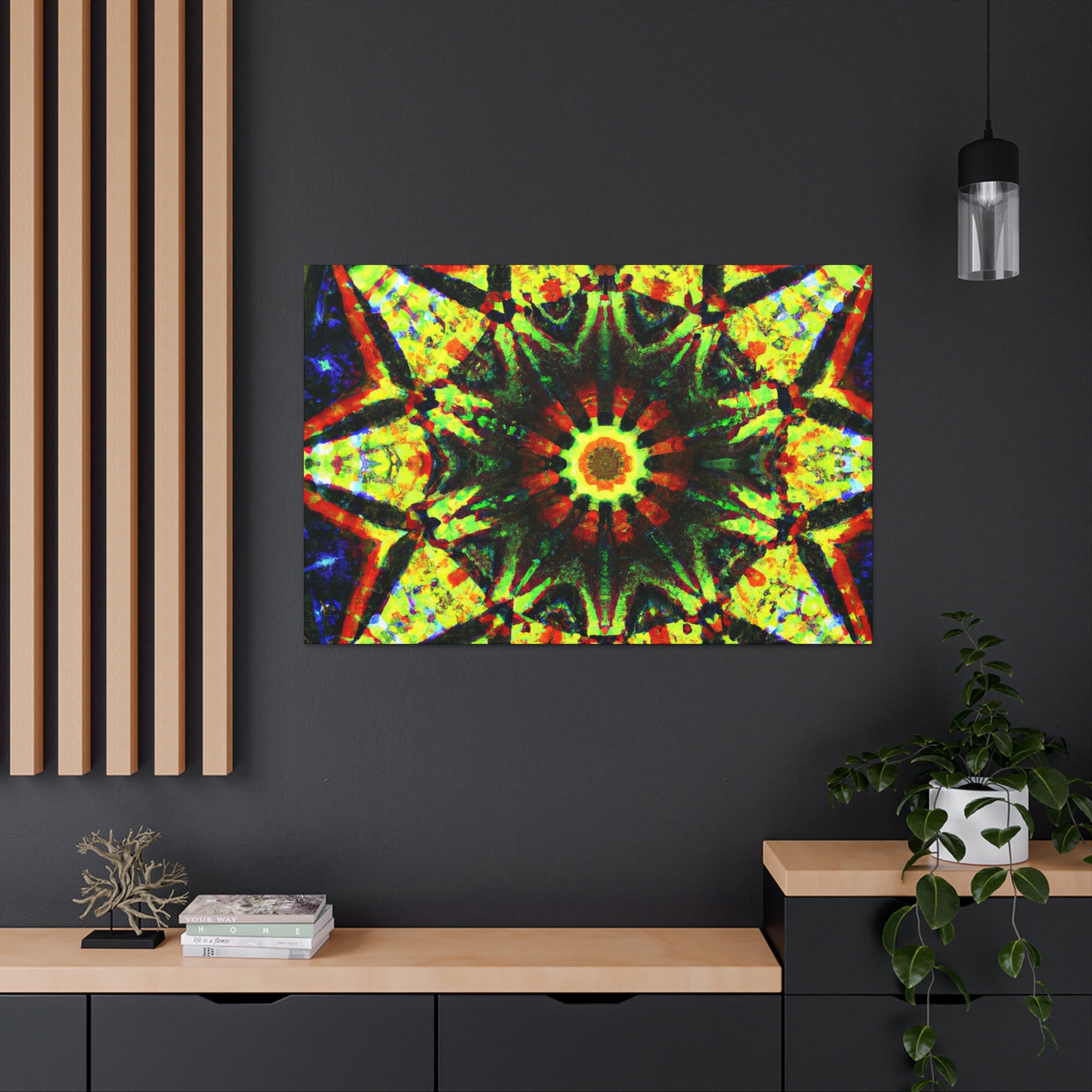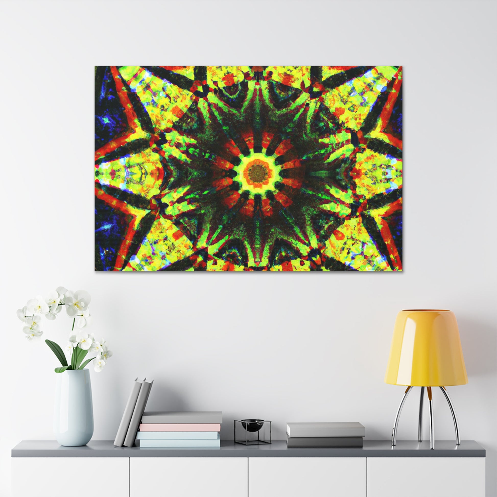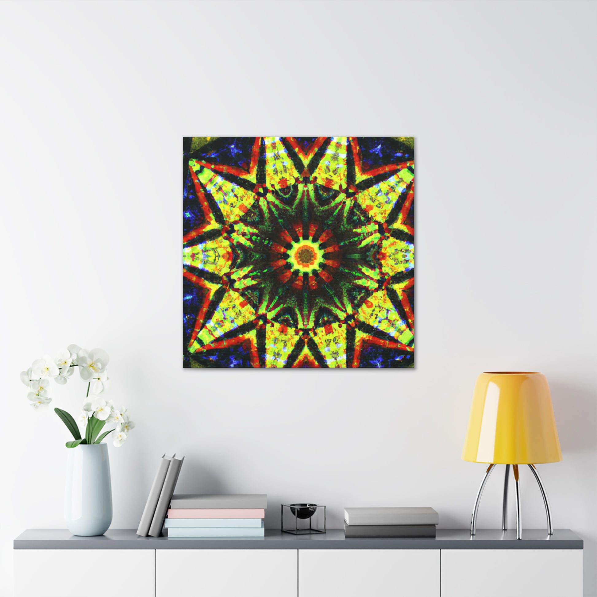 This vibrant canvas displays a dazzling digital art featuring abstract trippy stars and a dazzling kaleidoscope design! Made with high definition and saturated colors, the symmetrical artwork will be sure to liven up your space! Perfect for adding a bold statement to any wall. #canvas #digitalart #vibrant #HD #kaleidoscope #abstract #trippy #stars #symmetrical #home #statement