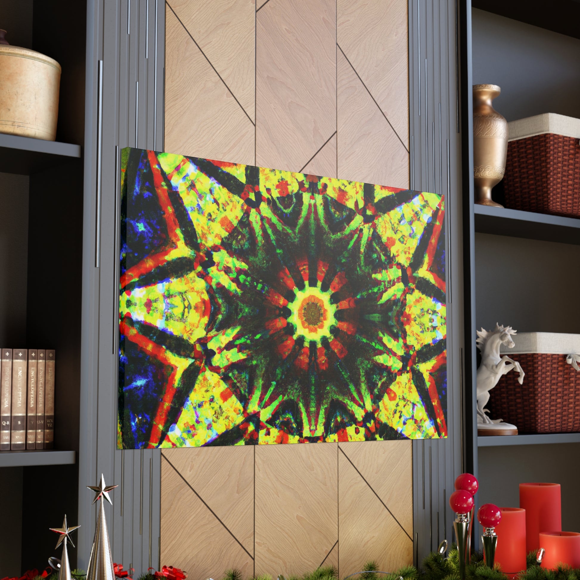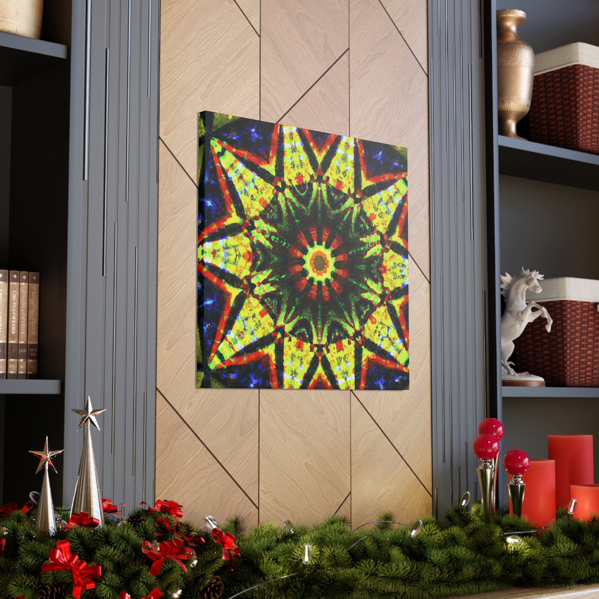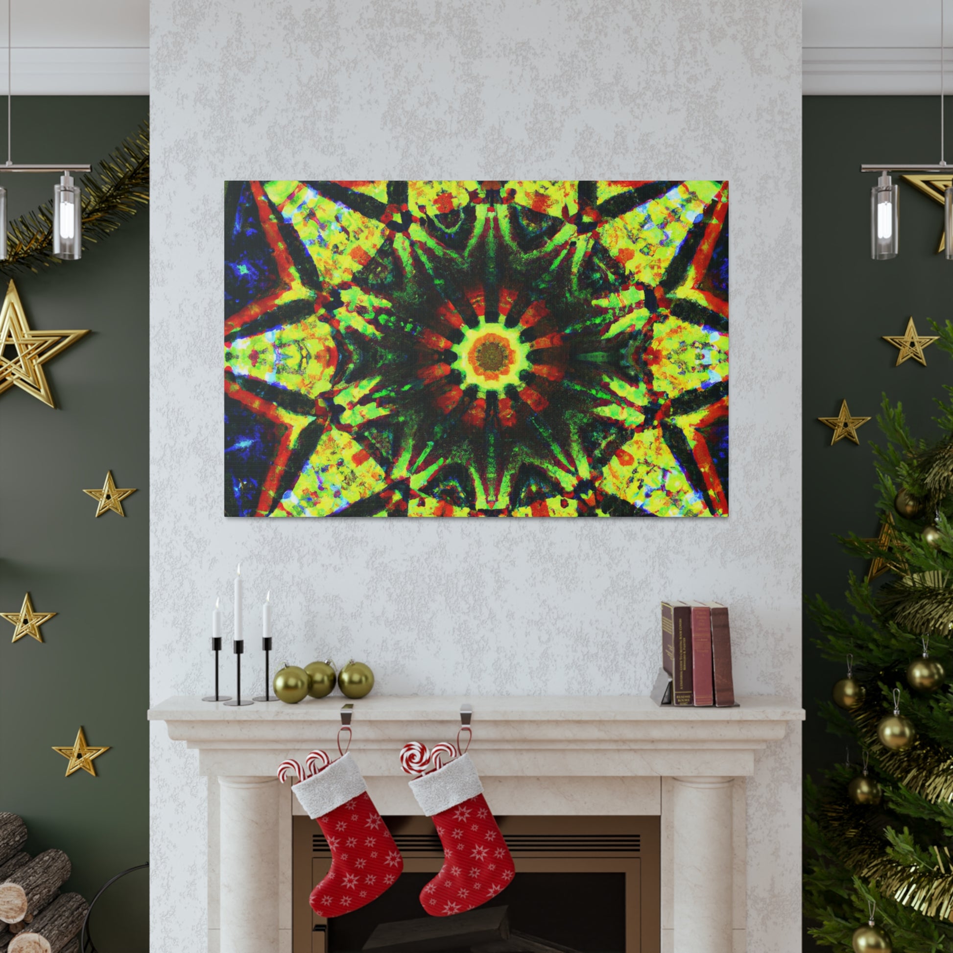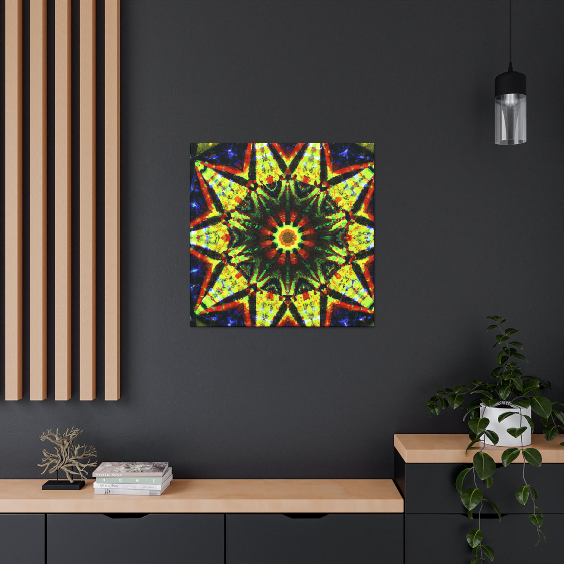 This vibrant canvas displays a dazzling digital art featuring abstract trippy stars and a dazzling kaleidoscope design! Made with high definition and saturated colors, the symmetrical artwork will be sure to liven up your space! Perfect for adding a bold statement to any wall. #canvas #digitalart #vibrant #HD #kaleidoscope #abstract #trippy #stars #symmetrical #home #statement