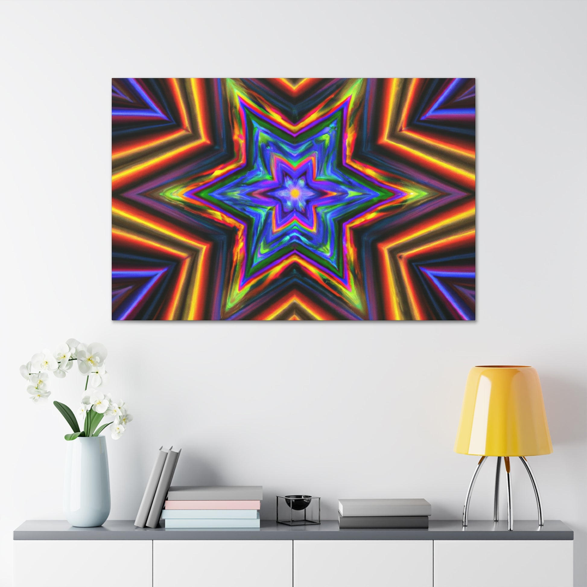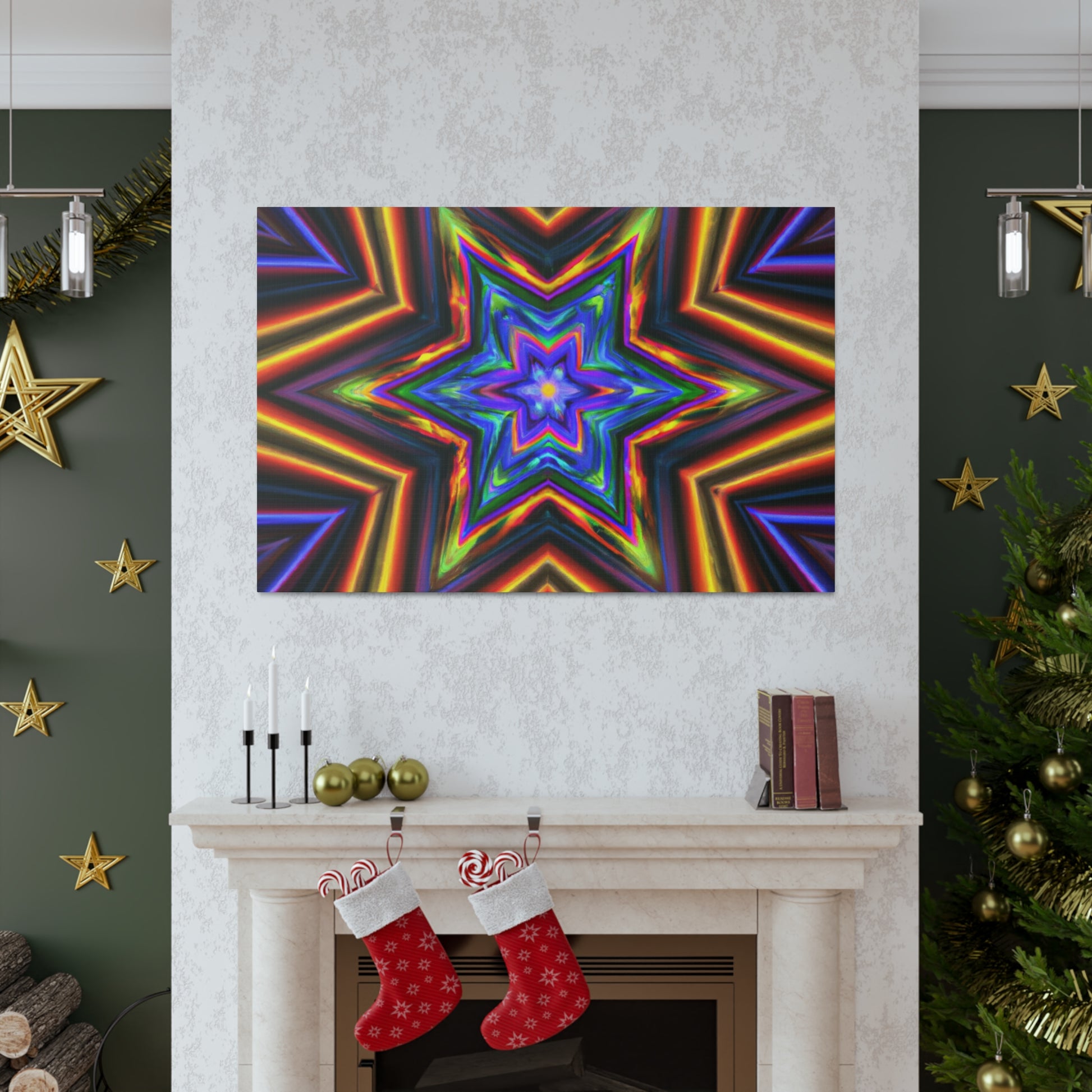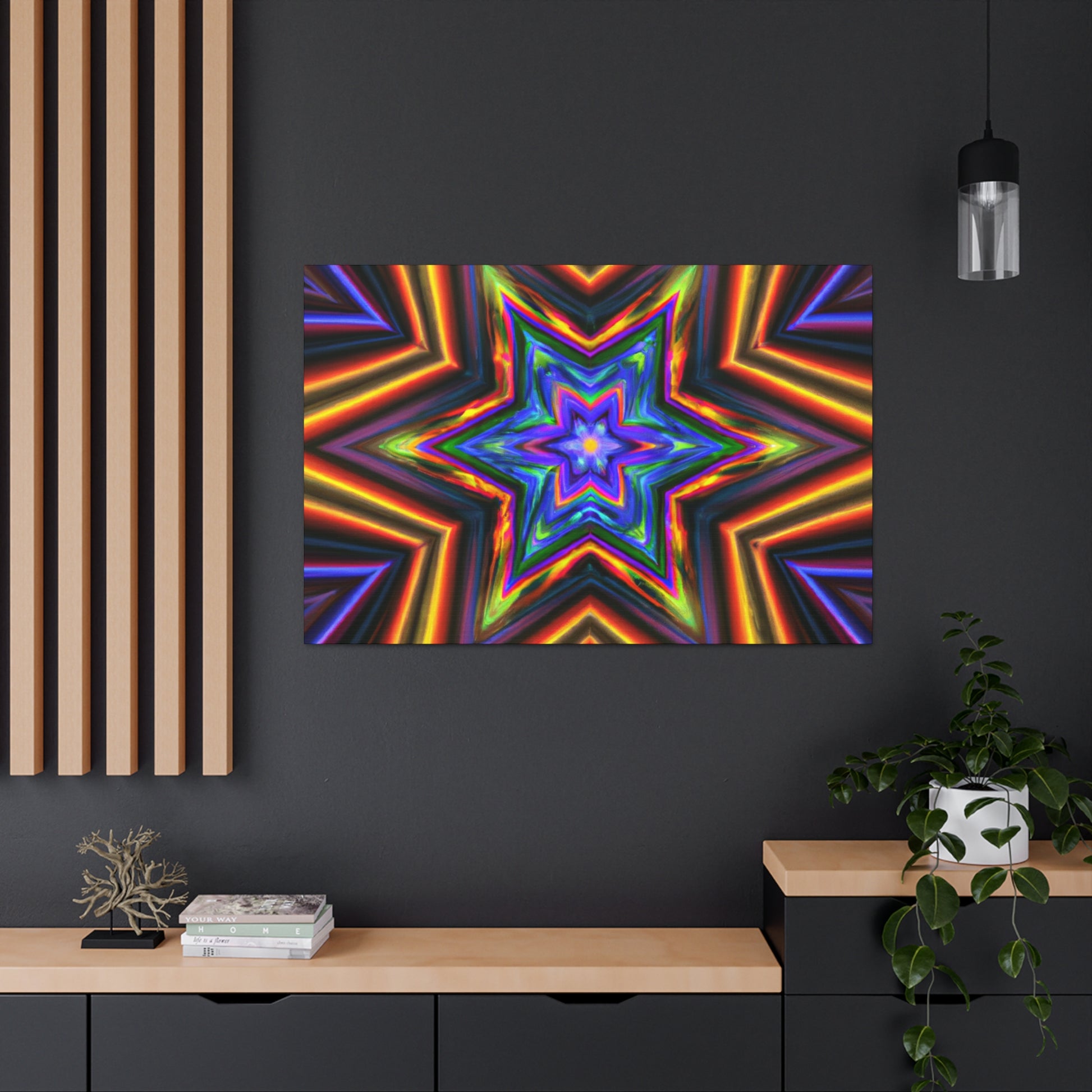 Our canvas includes a trippy star, kaleidoscope, and abstract-style design that radiates with vibrant colors and is printed in HD for maximum impact. Its symmetrical appearance ensures it will draw the eye and command attention wherever it is placed. #HD #vibrant #star #kaleidoscope #abstract #digitalart #symmetrical #canvas #artwork #wallart #style
