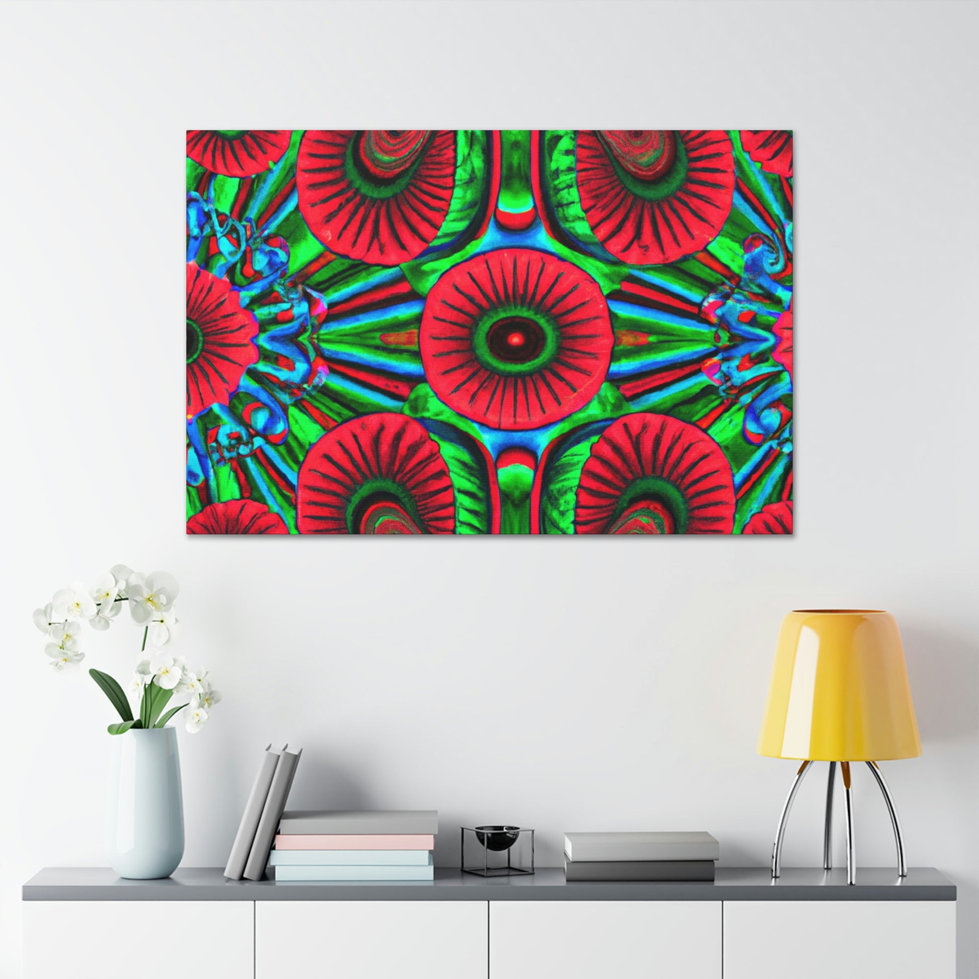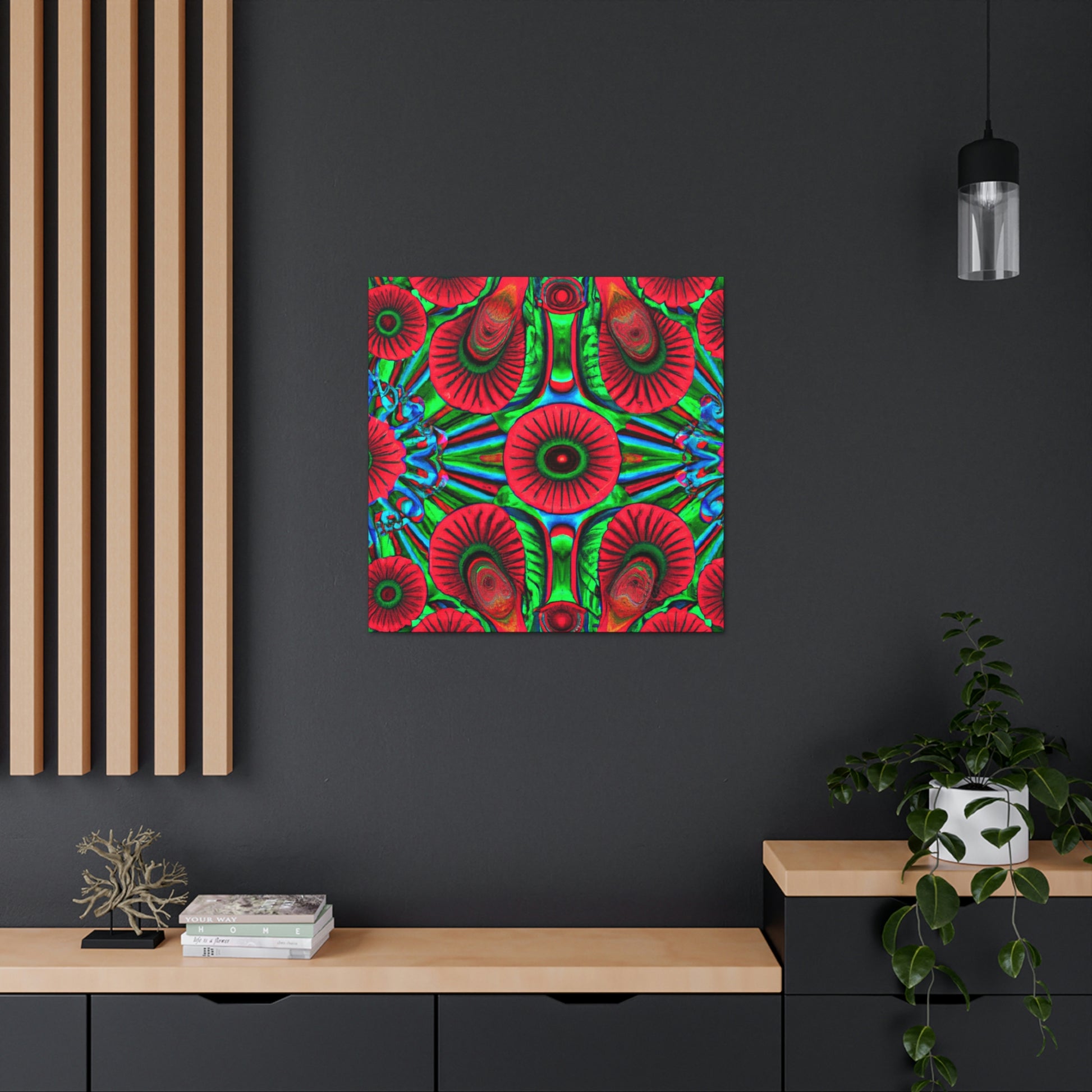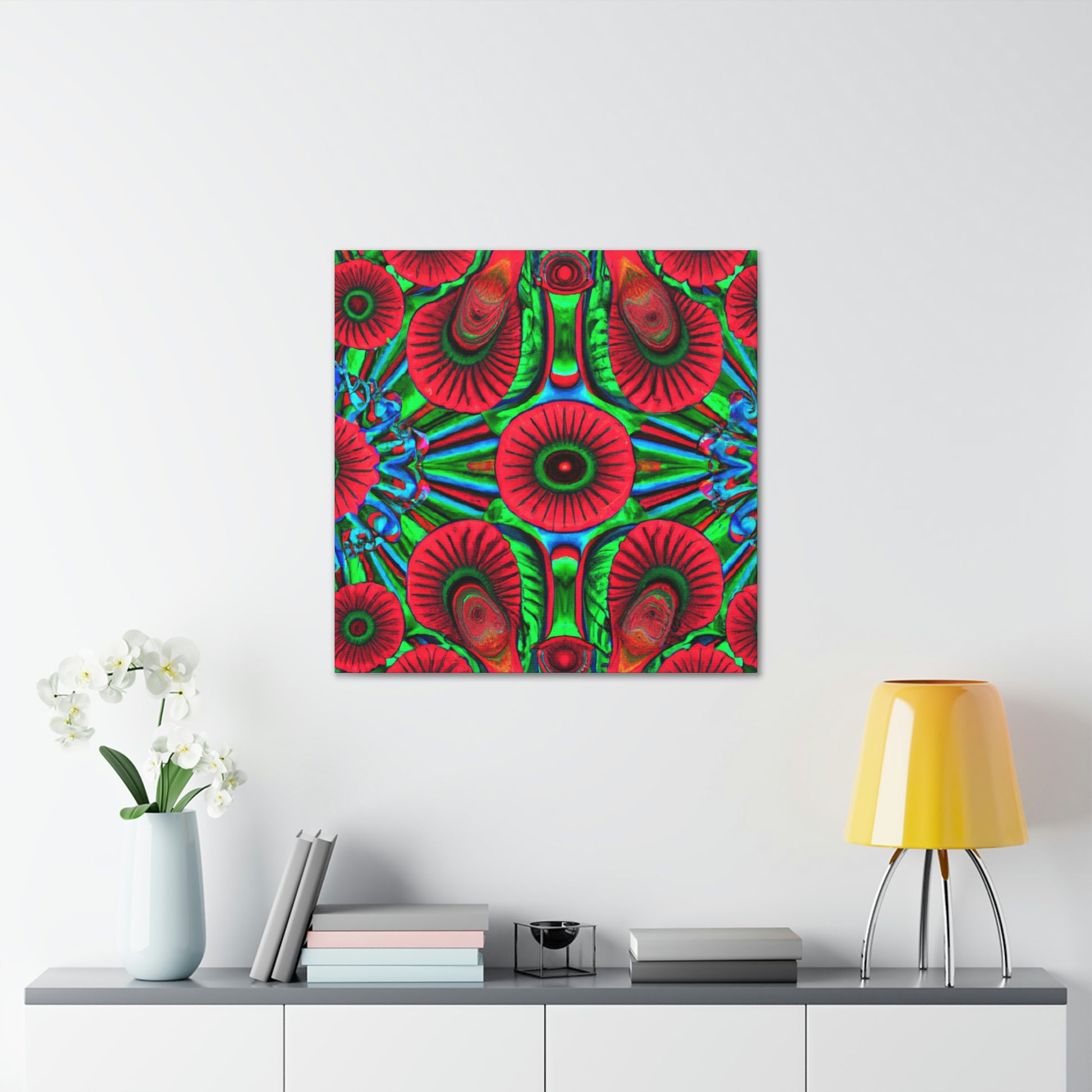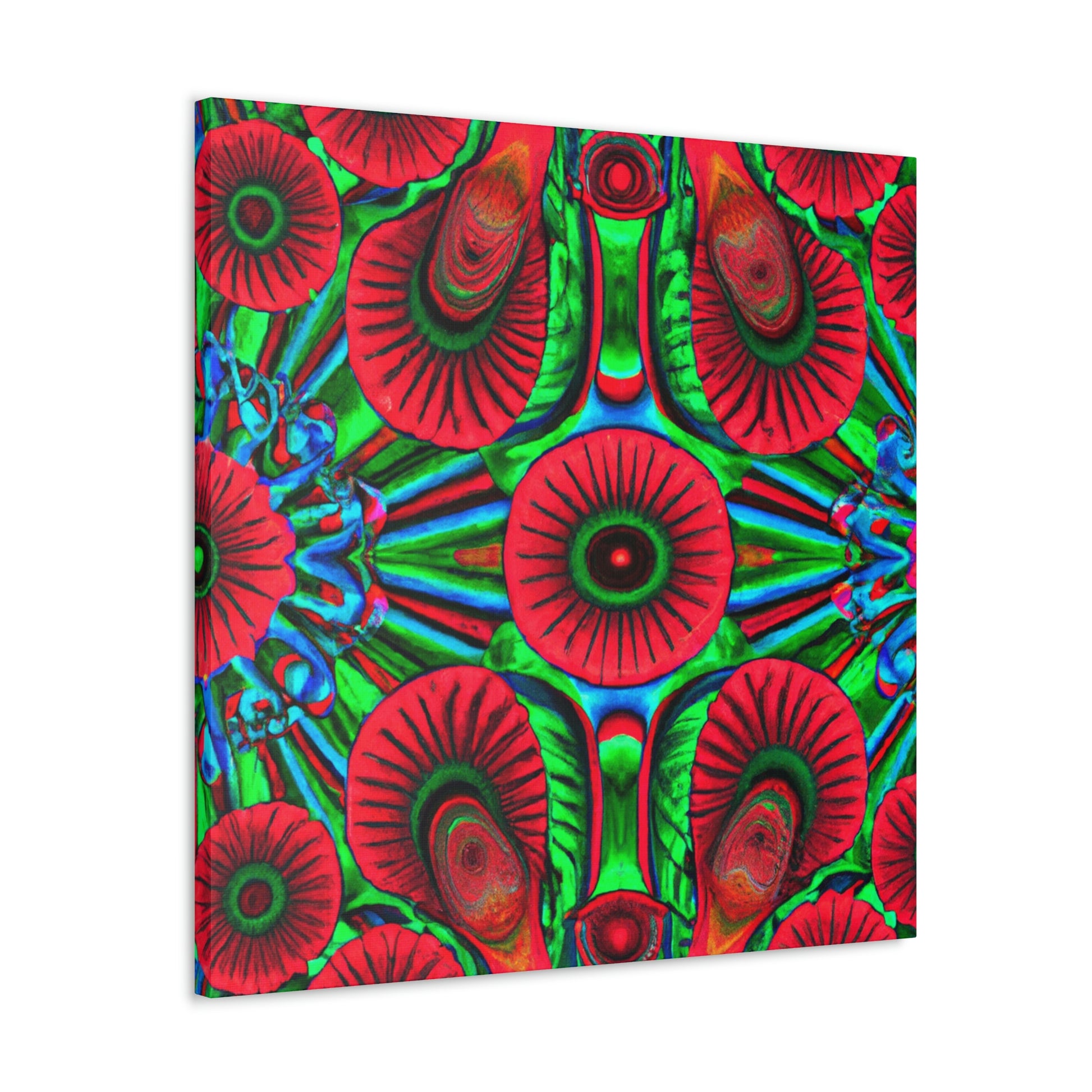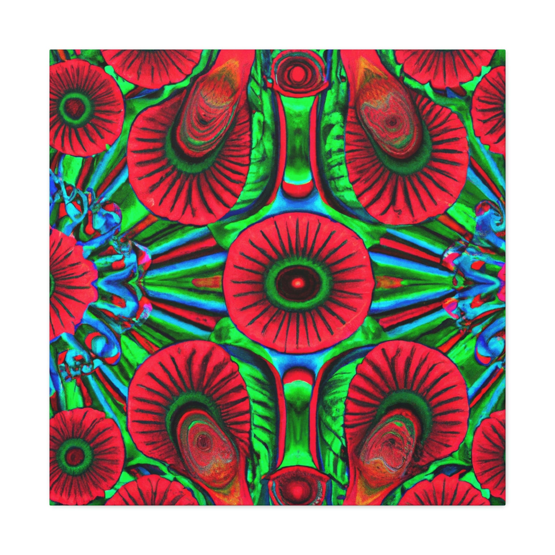 This vibrant canvas of trippy mushrooms, kaleidoscope, abstract, digital art, and 3D lines is sure to brighten your living space. The canvas has multi-coloured 3D lines, giving depth to this unique art piece. The generous use of vibrant colours add a splash of fun and energy to any room. This abstract canvas is sure to stand out and be the perfect statement piece. #mushrooms #kaleidoscope #3Dlines #abstractart #digitalart #canvasart #canvas #vibrantcolours #statementpiece #trippy #energy