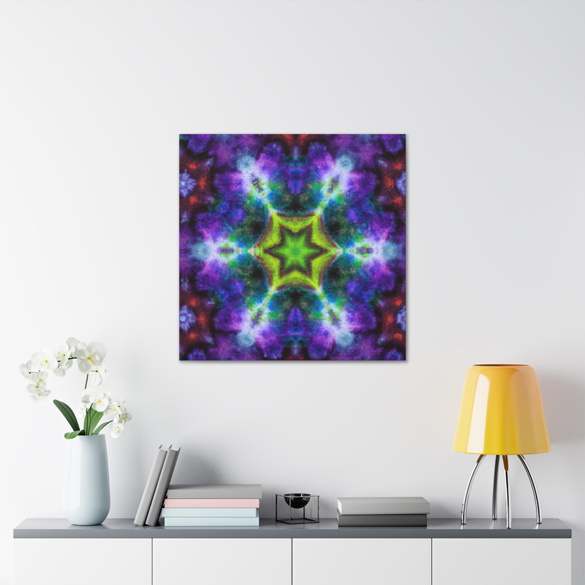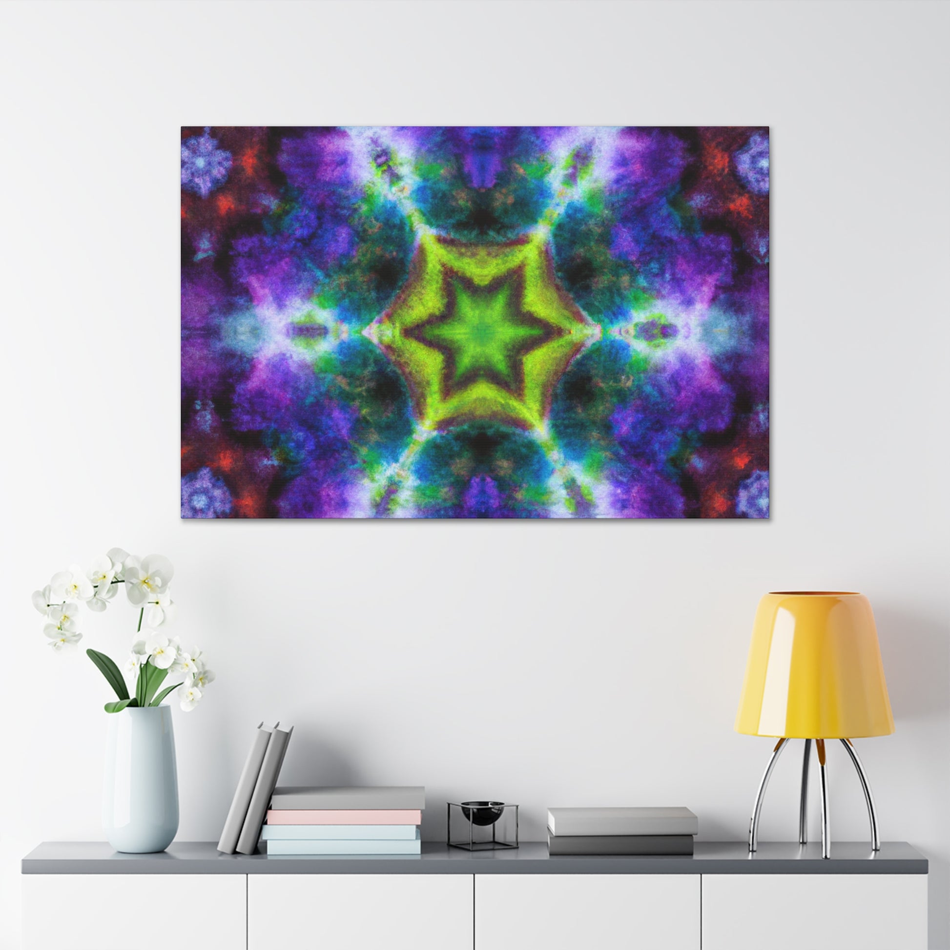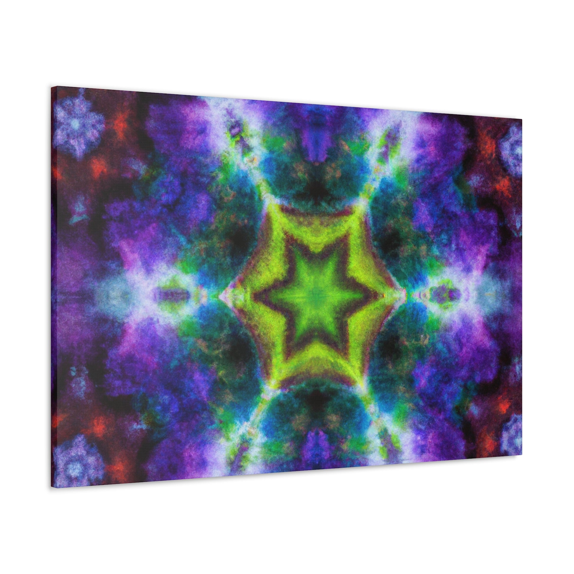 This one-of-a-kind canvas of digital artisty features colorful and trippy stars, kaleidoscope, and abstract shapes. With its bright, vibrant colors and HD design, this artwork is sure to draw attention in any home. The beautiful symmetrical canvas will take center stage in any room. #trippystars #kaleidoscope #abstractart #digitalart #vibrantcolors #HD #symmetrical #canvasart #wallart #artwork #homeart