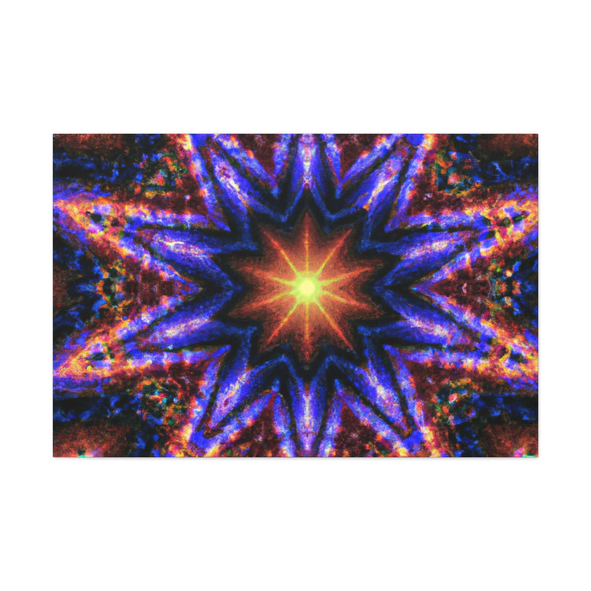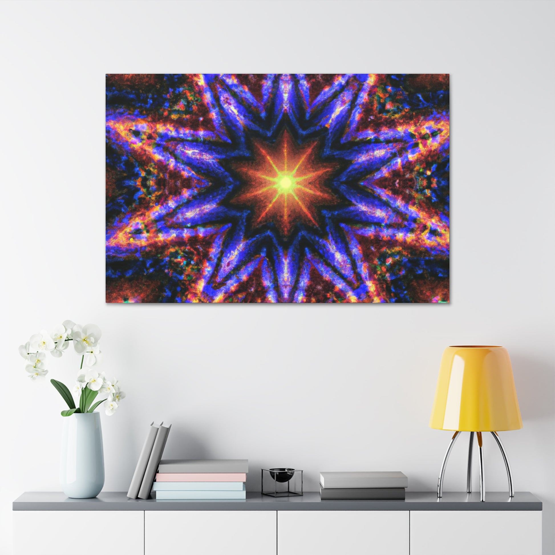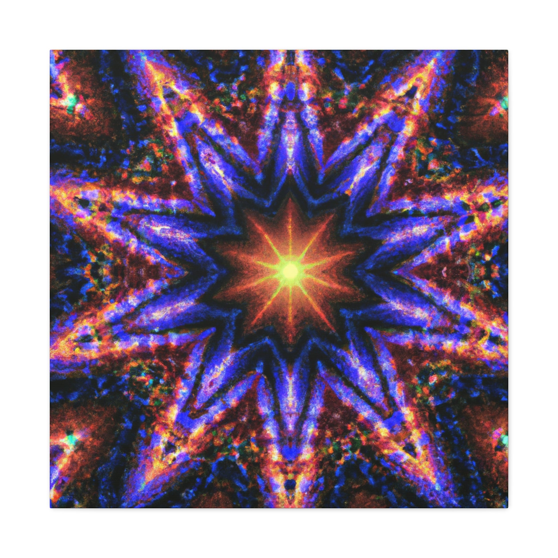 This gorgeous abstract art will add energy and color to any space! This canvas of Trippy stars, kaleidoscope, and symmetrical digital art is printed with vibrant colors in HD for great clarity. It will add an uplifting feel to any room! #canvas #art #digitalart #kaleidoscope #symmetry #stars #abstract #artdecor #trippy #vibrant #hd