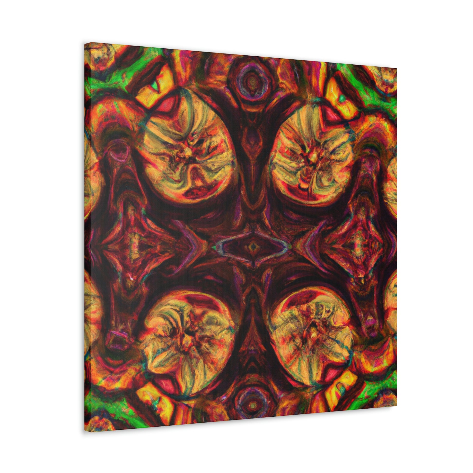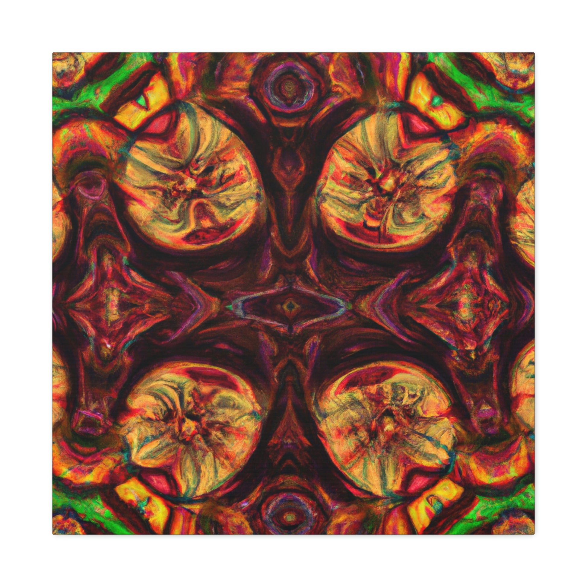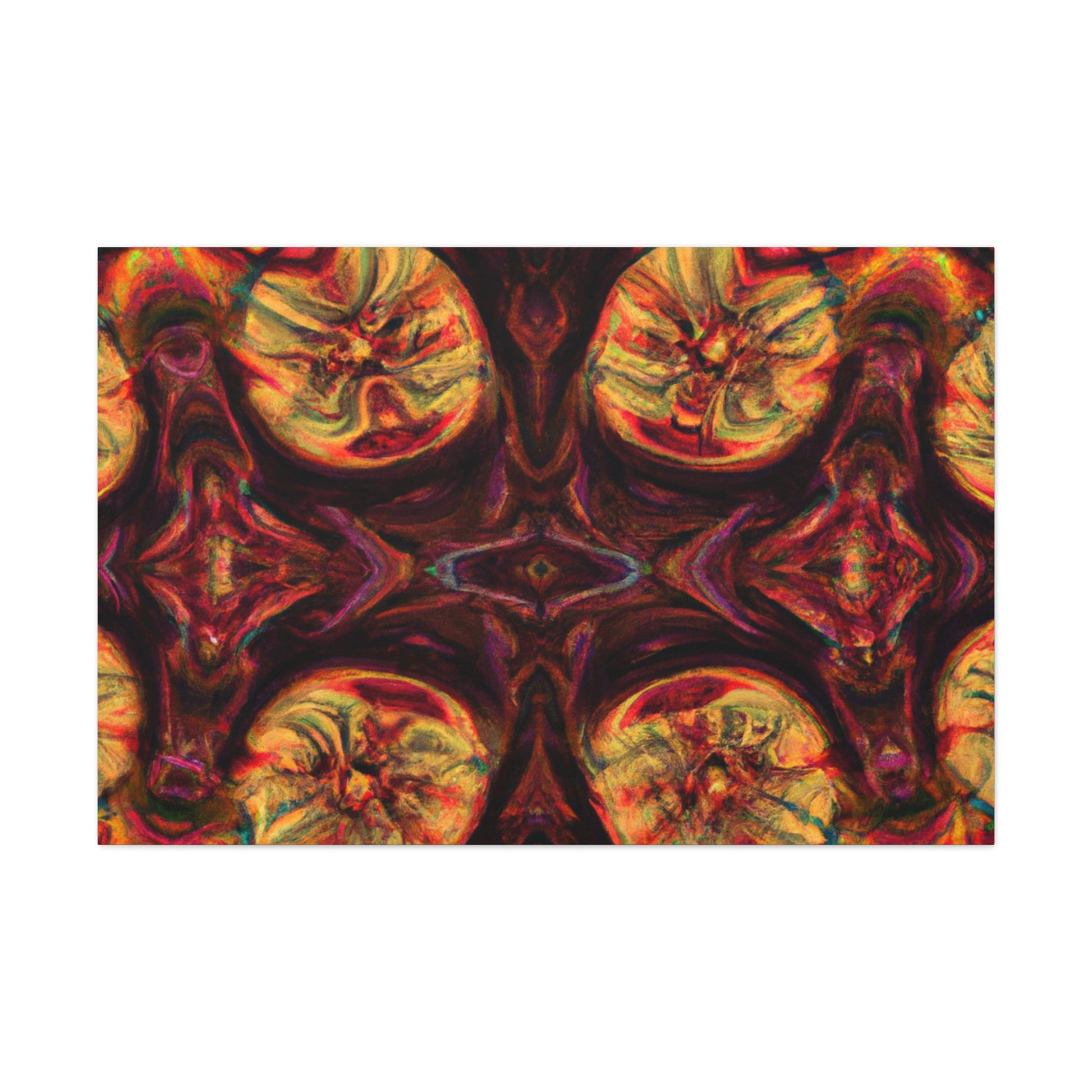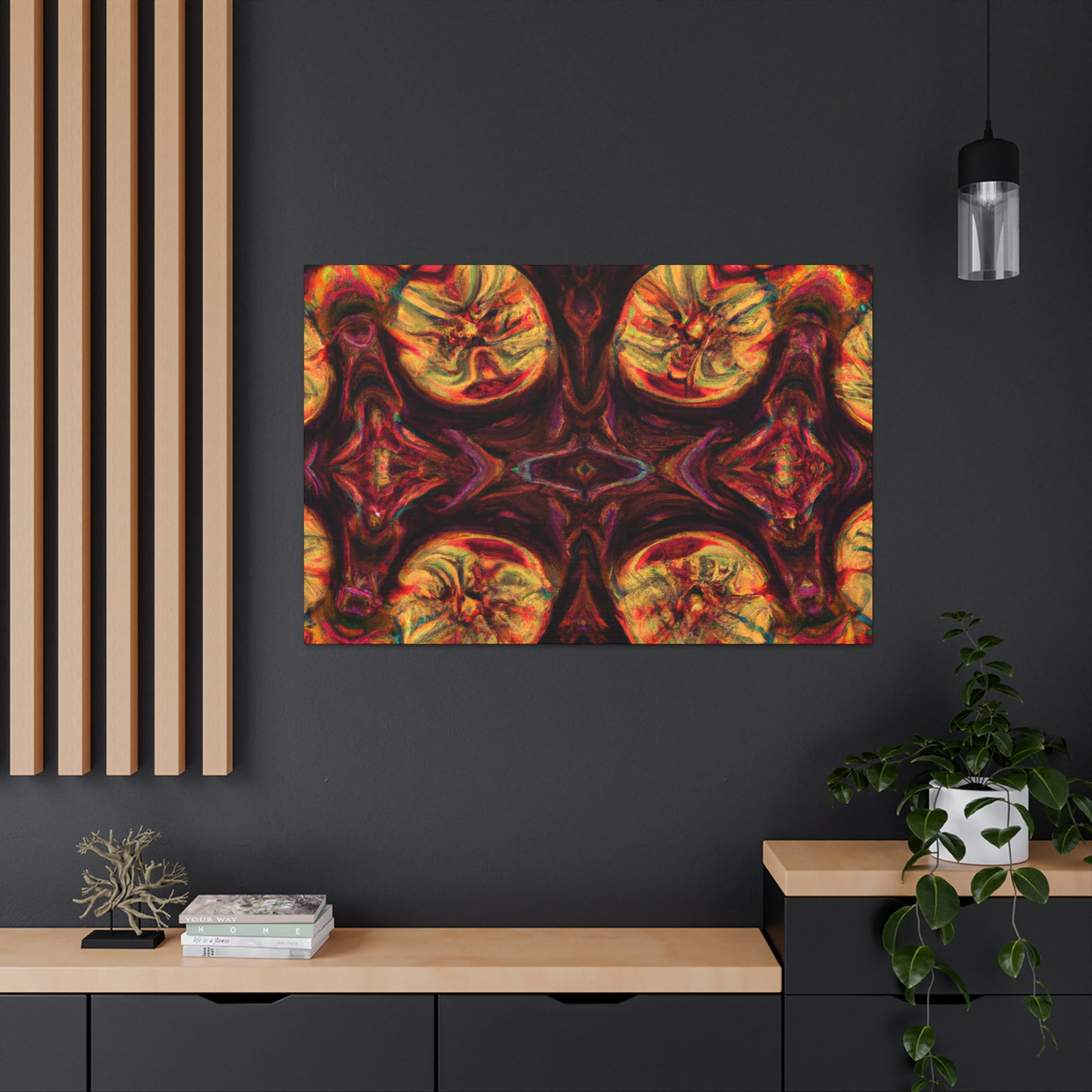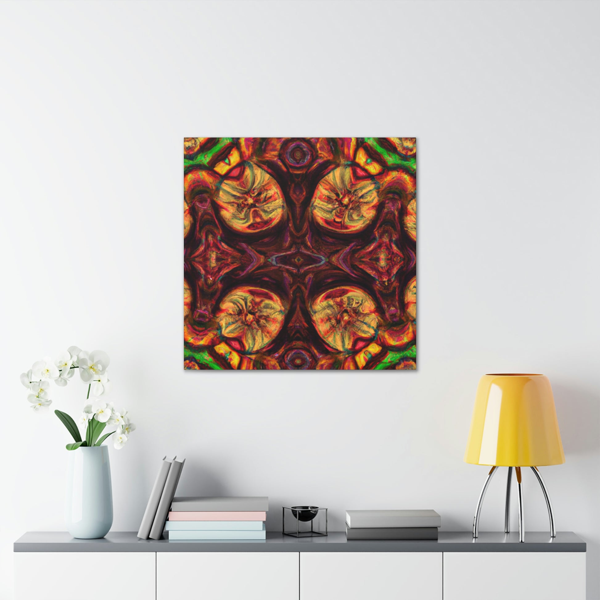This abstract digital art canvas shows off a unique take on trippy mushrooms. Colorful and psychedelic, this kaleidoscope pattern features vivid orange, yellow and blue colors that draw attention. Hang this canvas to instantly update any room and create an eye-catching wall décor. #trippy #mushrooms #kaleidoscope #abstract #digitalart #vividcolors #homedecor #psychedelic #colorful #wallart #ohwowspace
