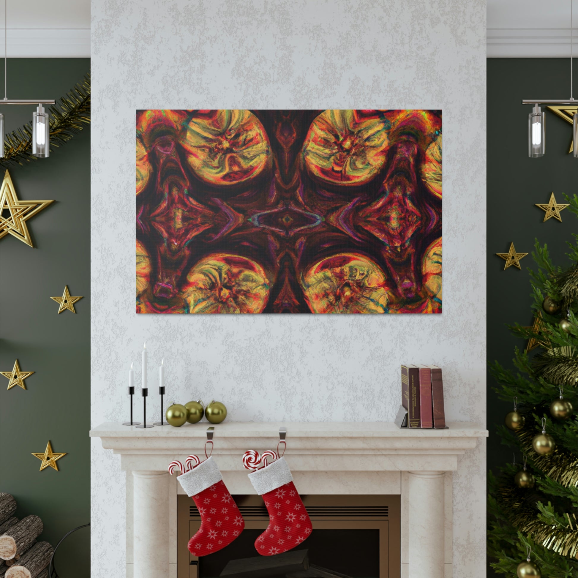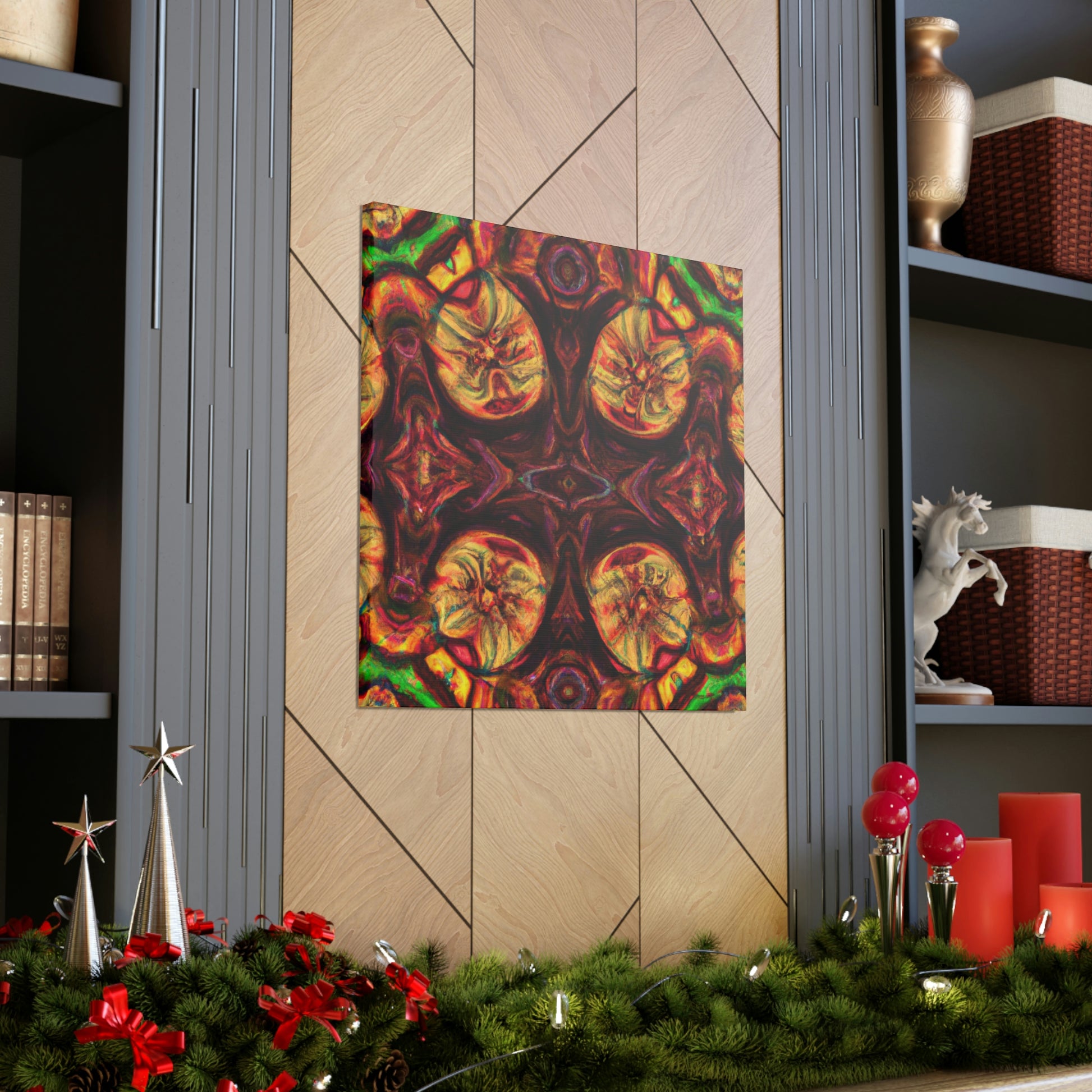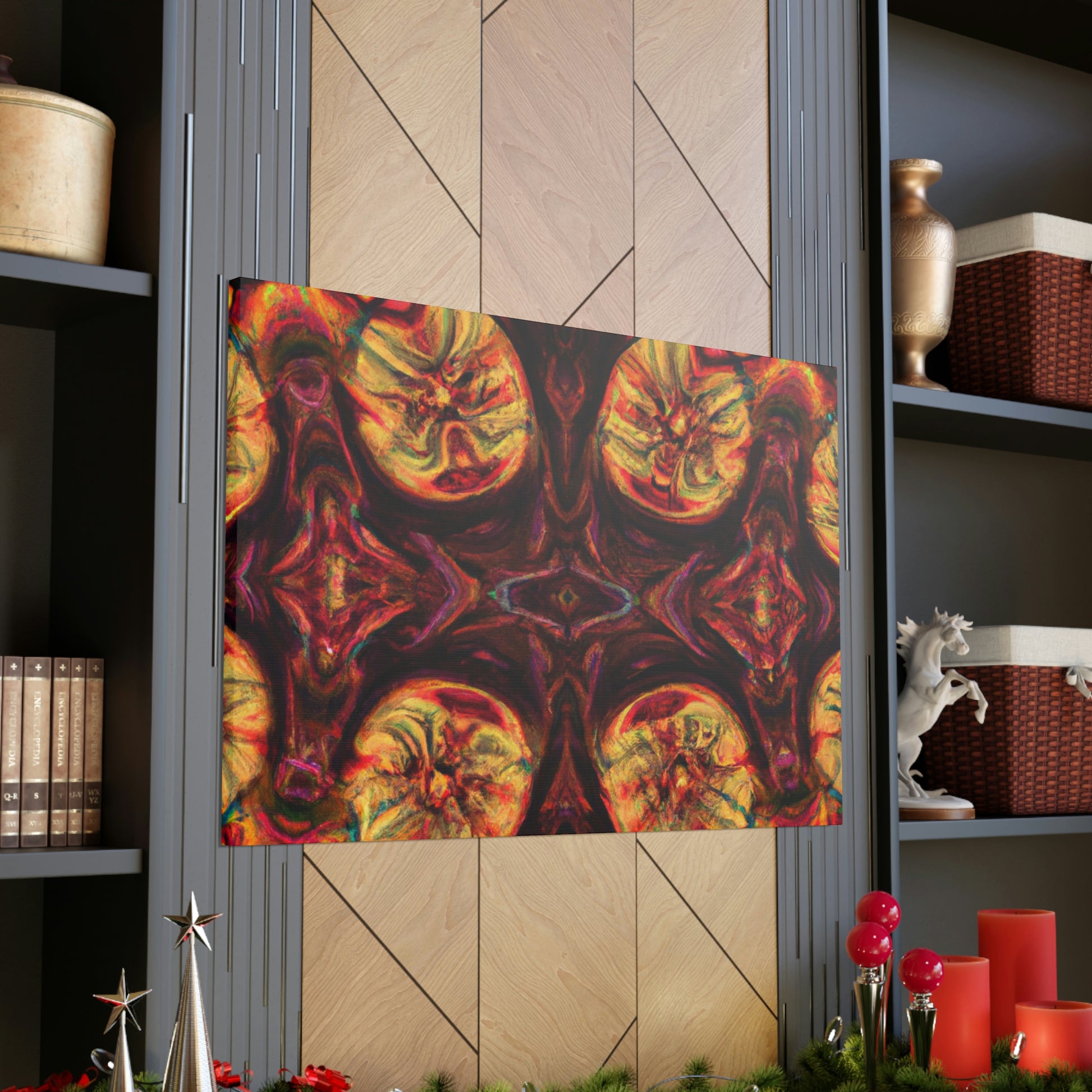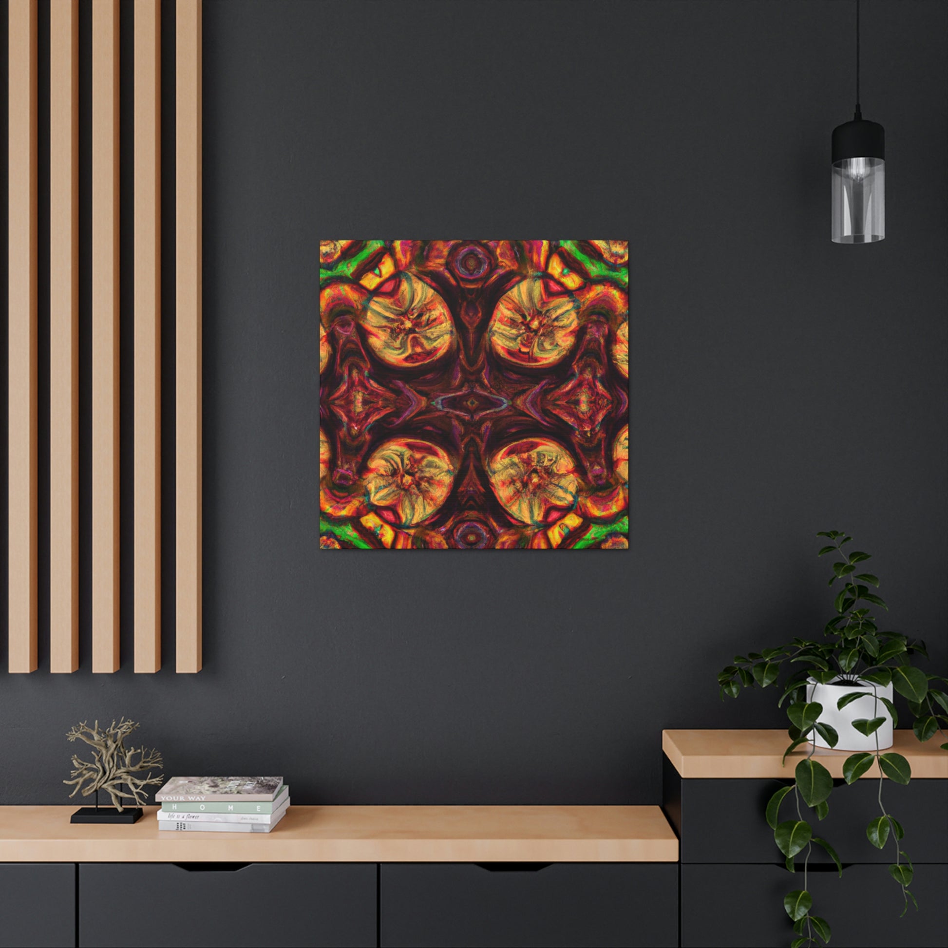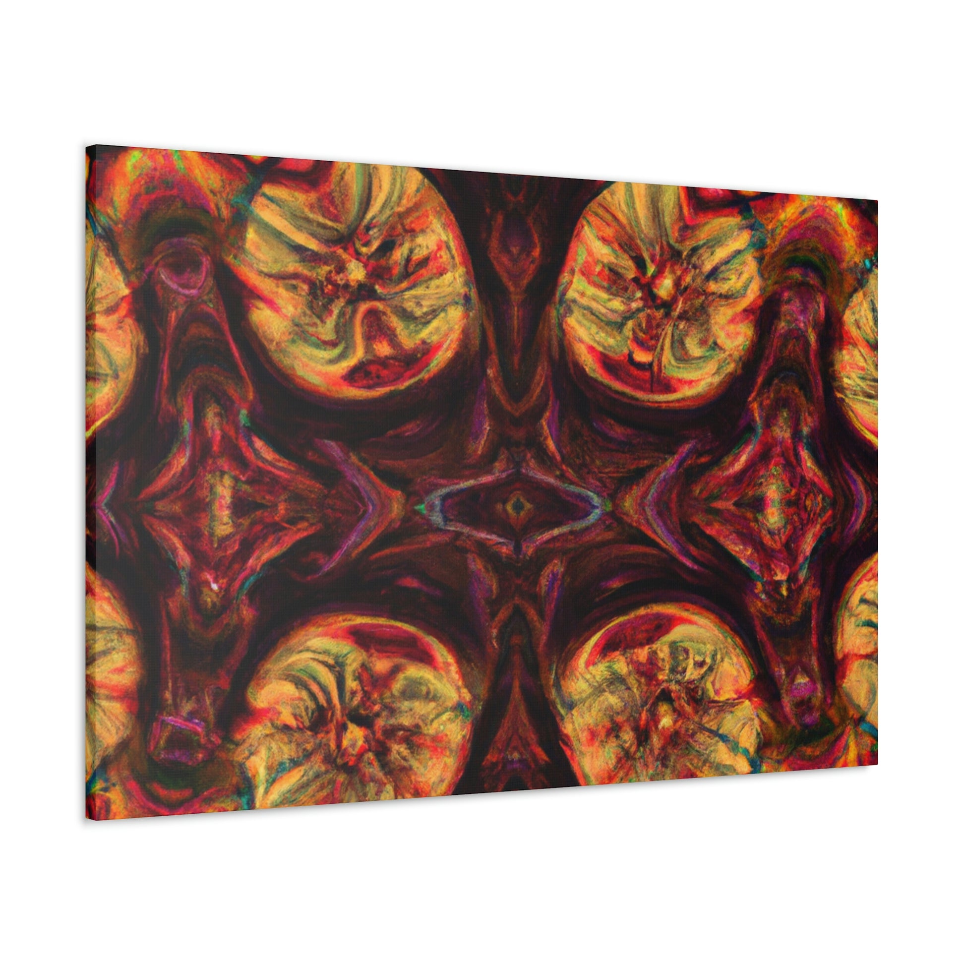 This abstract digital art canvas shows off a unique take on trippy mushrooms. Colorful and psychedelic, this kaleidoscope pattern features vivid orange, yellow and blue colors that draw attention. Hang this canvas to instantly update any room and create an eye-catching wall décor. #trippy #mushrooms #kaleidoscope #abstract #digitalart #vividcolors #homedecor #psychedelic #colorful #wallart #ohwowspace