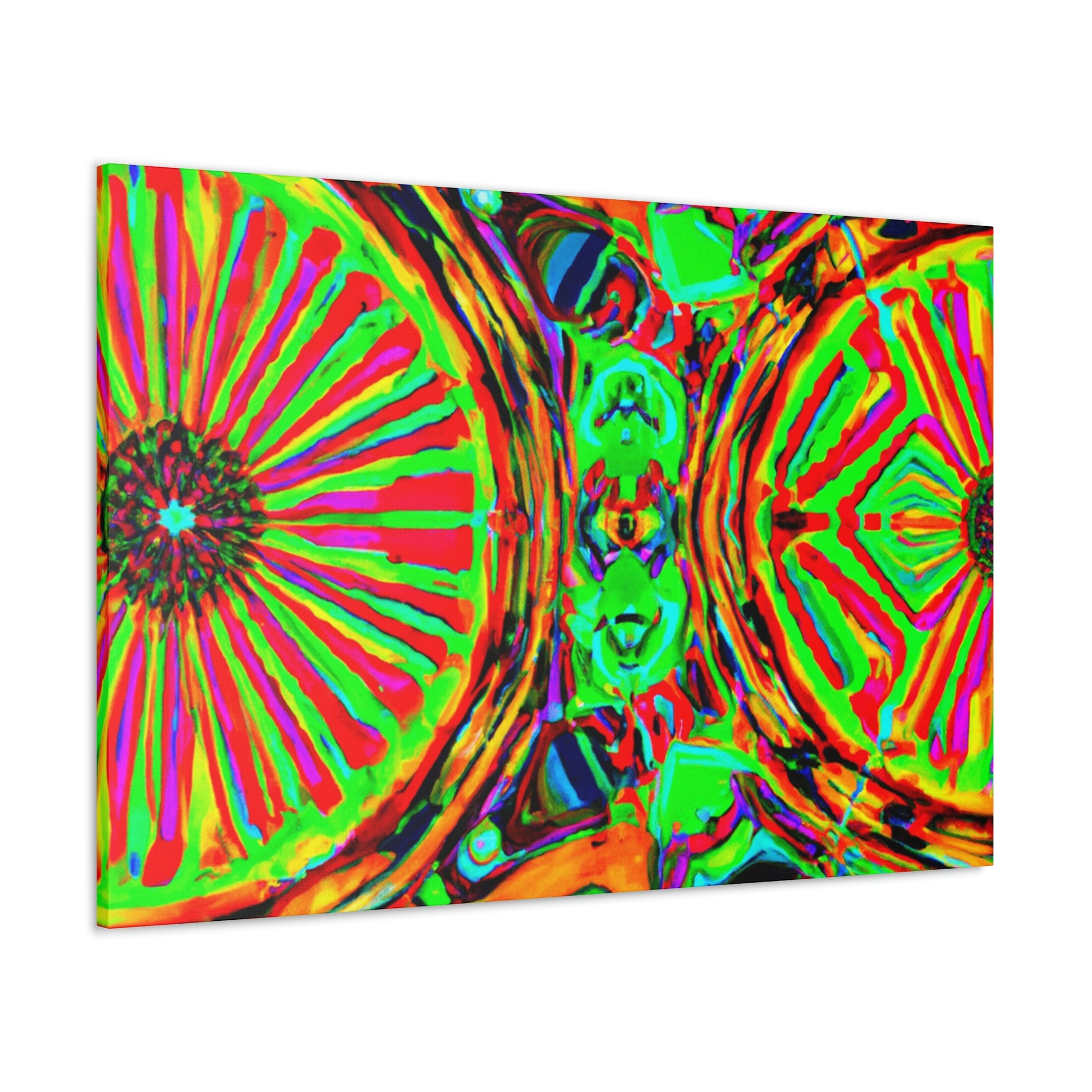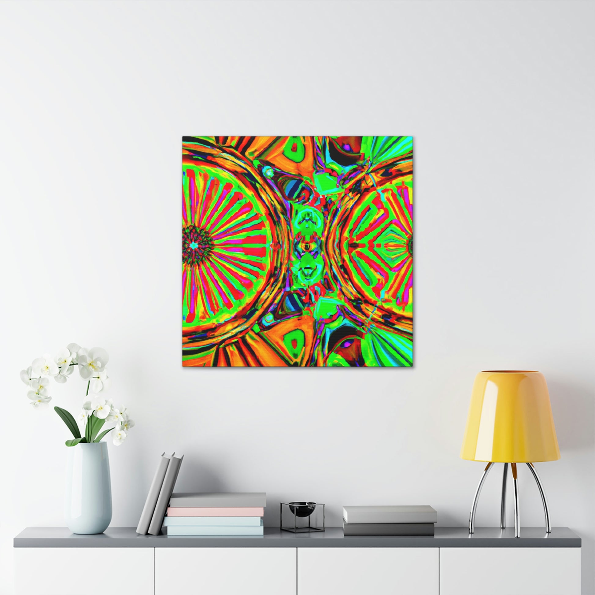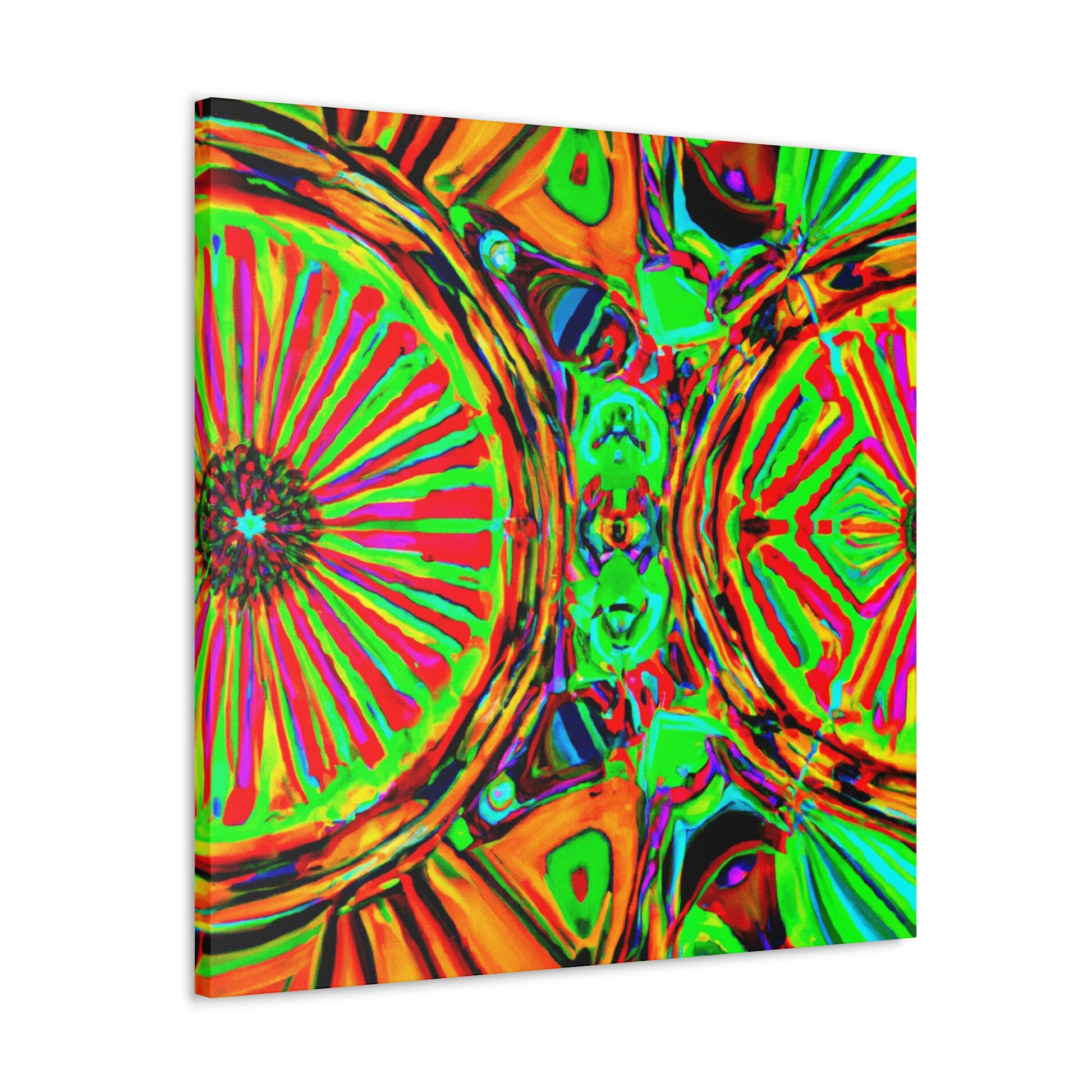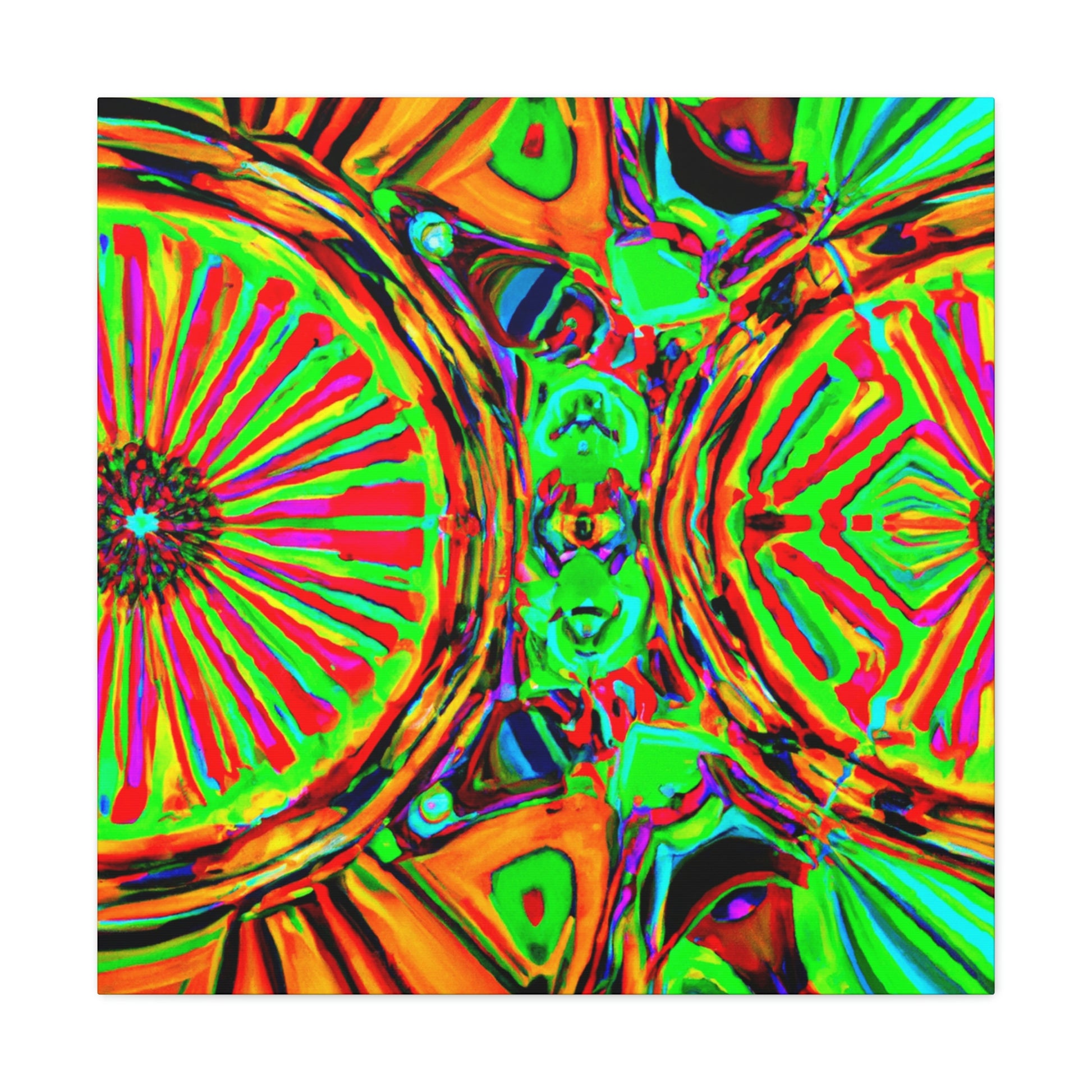 This gorgeous digital artwork features a trippy kaleidoscope of vibrant mushrooms framed on a canvas. The abstract lines form a mesmerizing 3D experience, creating a stunning visual piece for your home. Let this vibrant art invigorate your space with its one-of-a-kind combination of colors and shapes. #mushrooms #kaleidoscope #abstract#digitalart #3Dlines #vibrantcolors #canvasart #homedecor #vividart #AbstractPainting #statementart