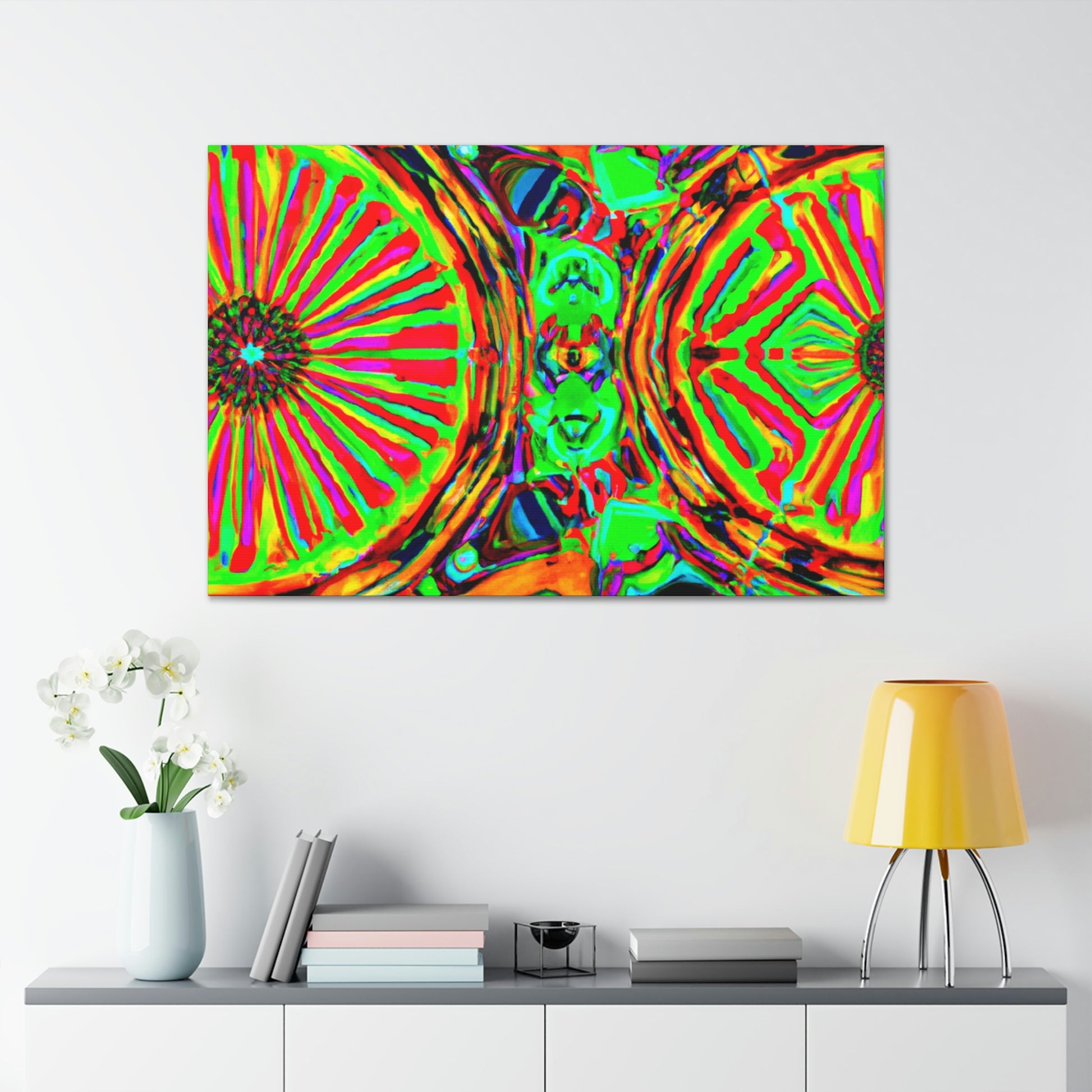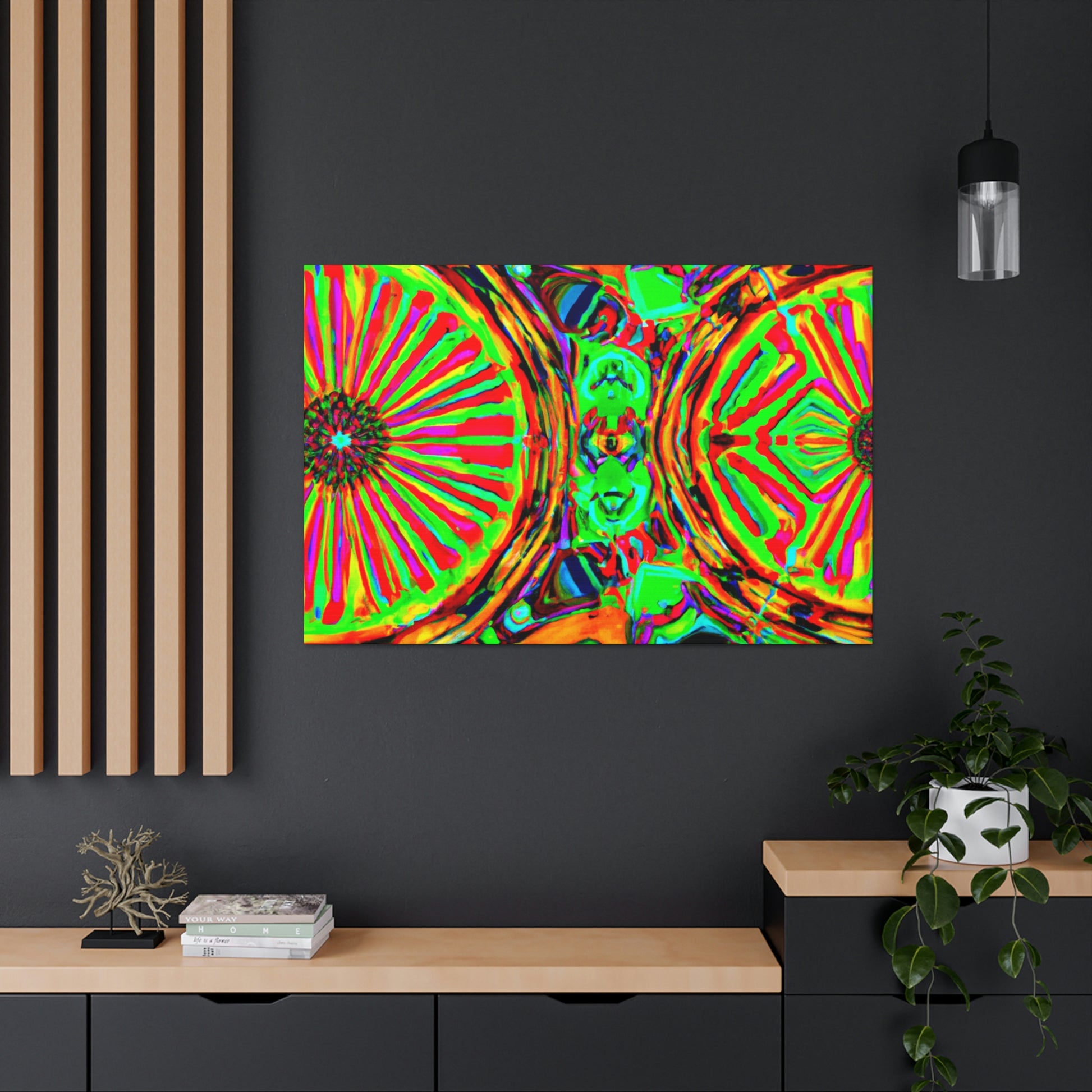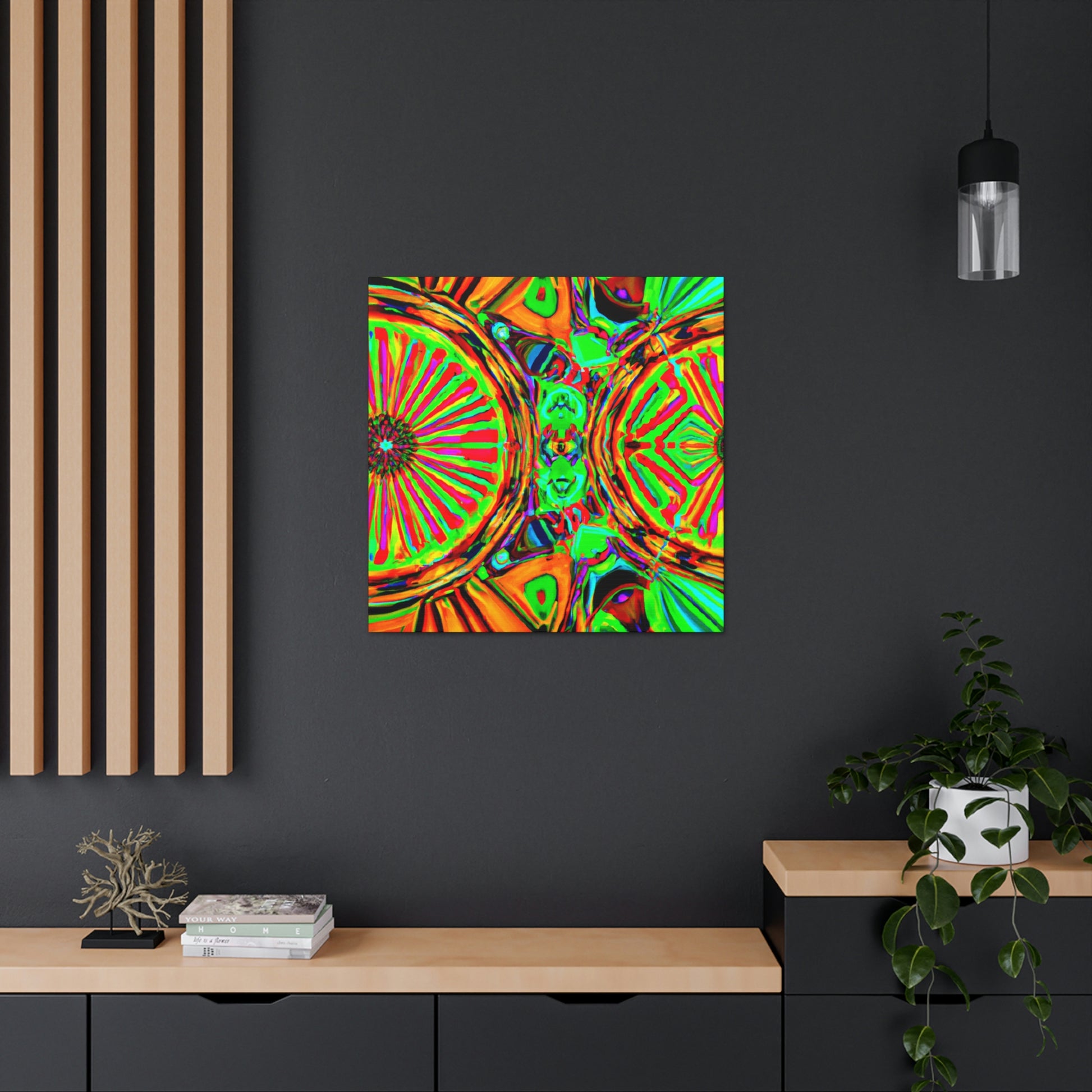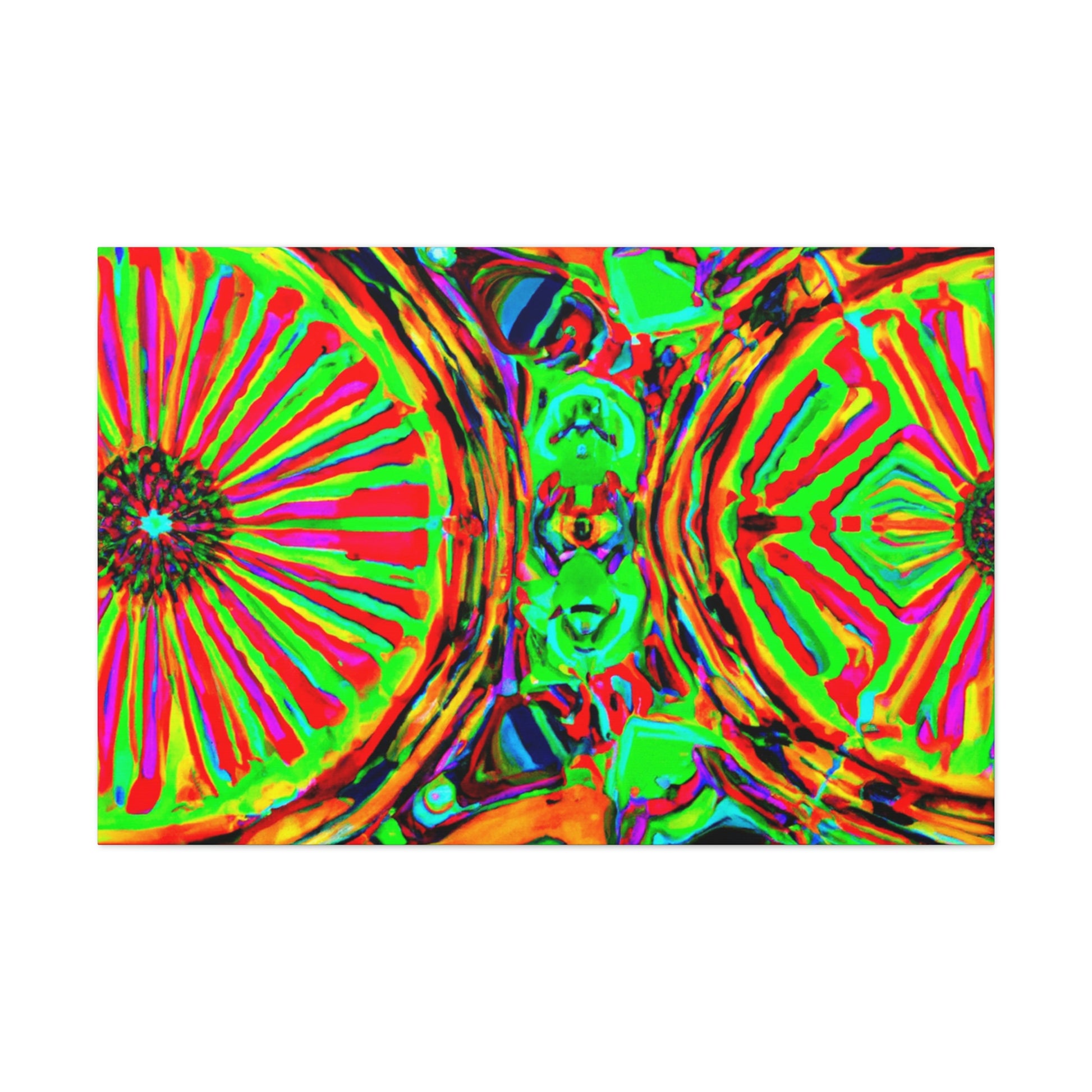 This gorgeous digital artwork features a trippy kaleidoscope of vibrant mushrooms framed on a canvas. The abstract lines form a mesmerizing 3D experience, creating a stunning visual piece for your home. Let this vibrant art invigorate your space with its one-of-a-kind combination of colors and shapes. #mushrooms #kaleidoscope #abstract#digitalart #3Dlines #vibrantcolors #canvasart #homedecor #vividart #AbstractPainting #statementart