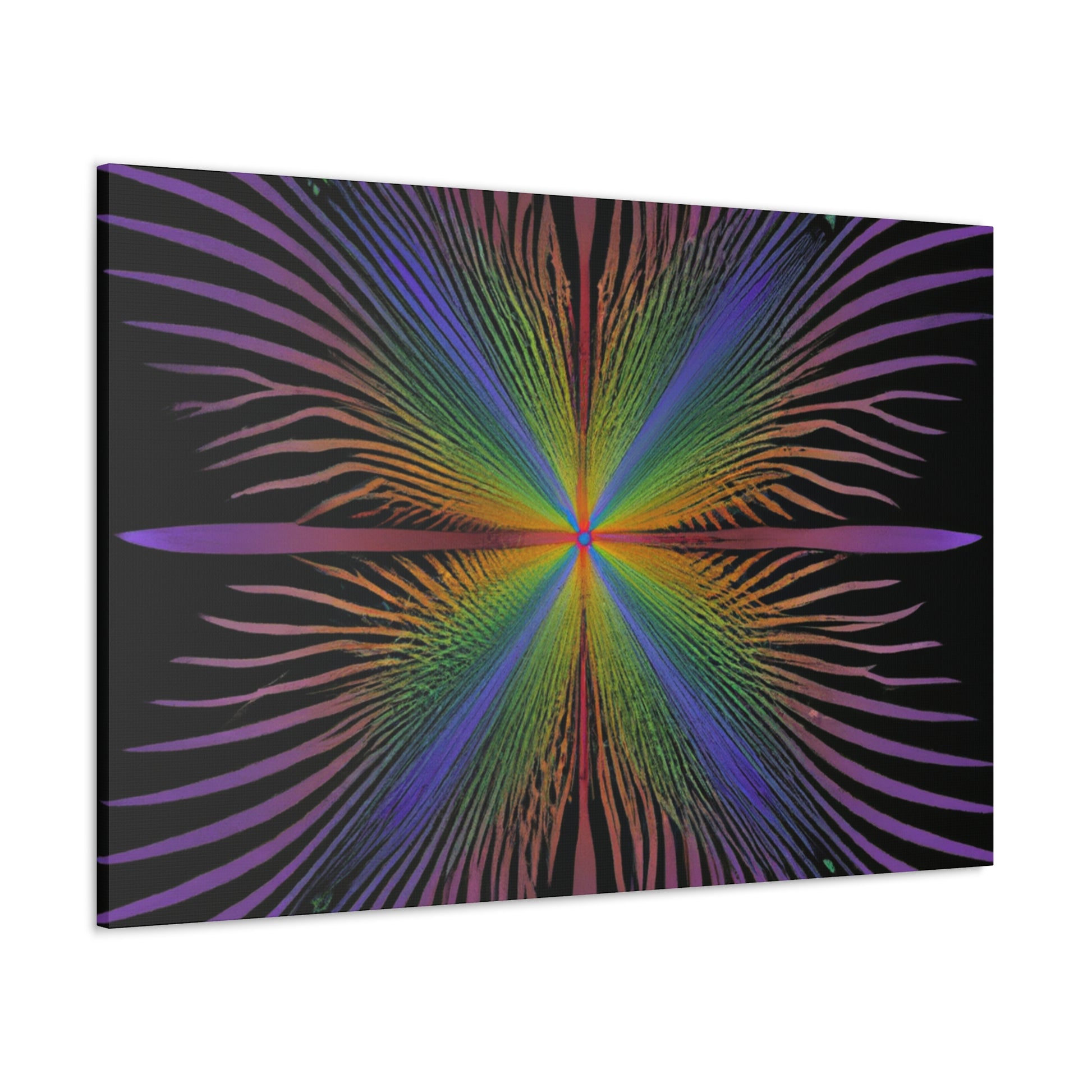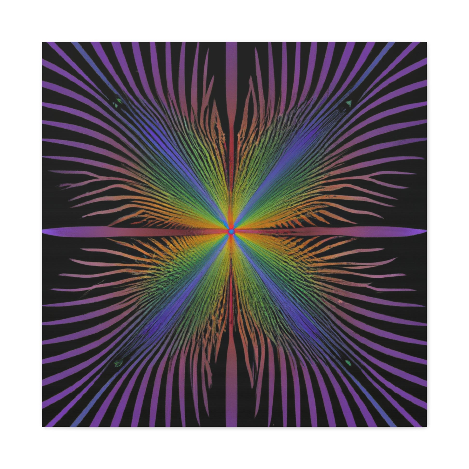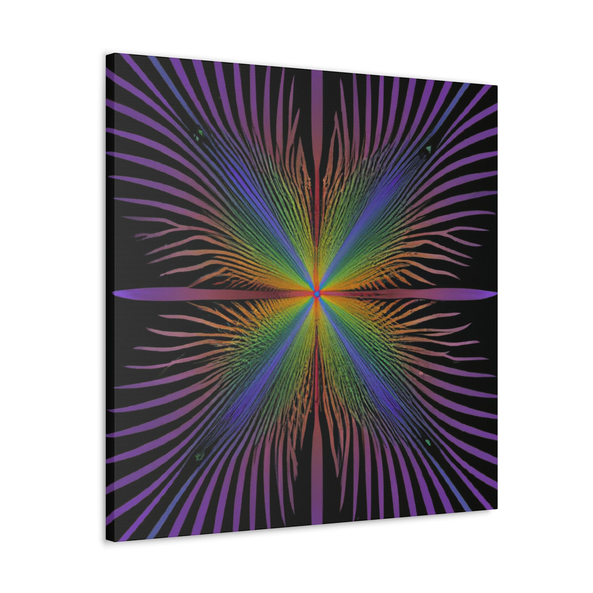 This gorgeous canvas features a radiant trippy kaleidoscope of geometric palm leaves and abstract shapes with a mesmerizing 3D fractal effect. The vibrant colors add a special touch to this digital artwork, making it a perfect piece for any wall. Let this unique design add some life and beauty to your home. #trippyart #kaleidoscope #fractal #3Dlines #palmleaves #abstractart #digitalart #canvasart #vibrantcolors #décorideas #3Dart