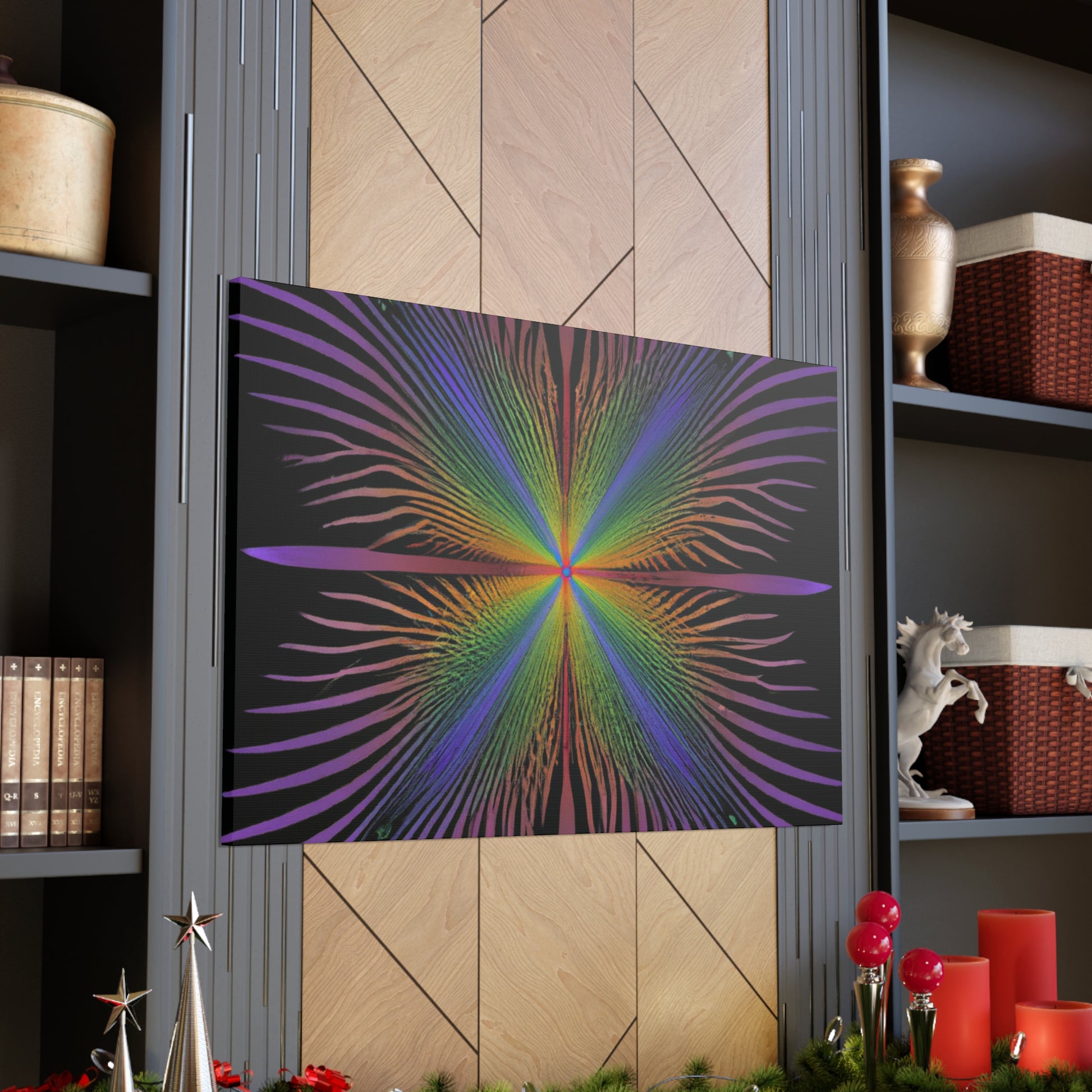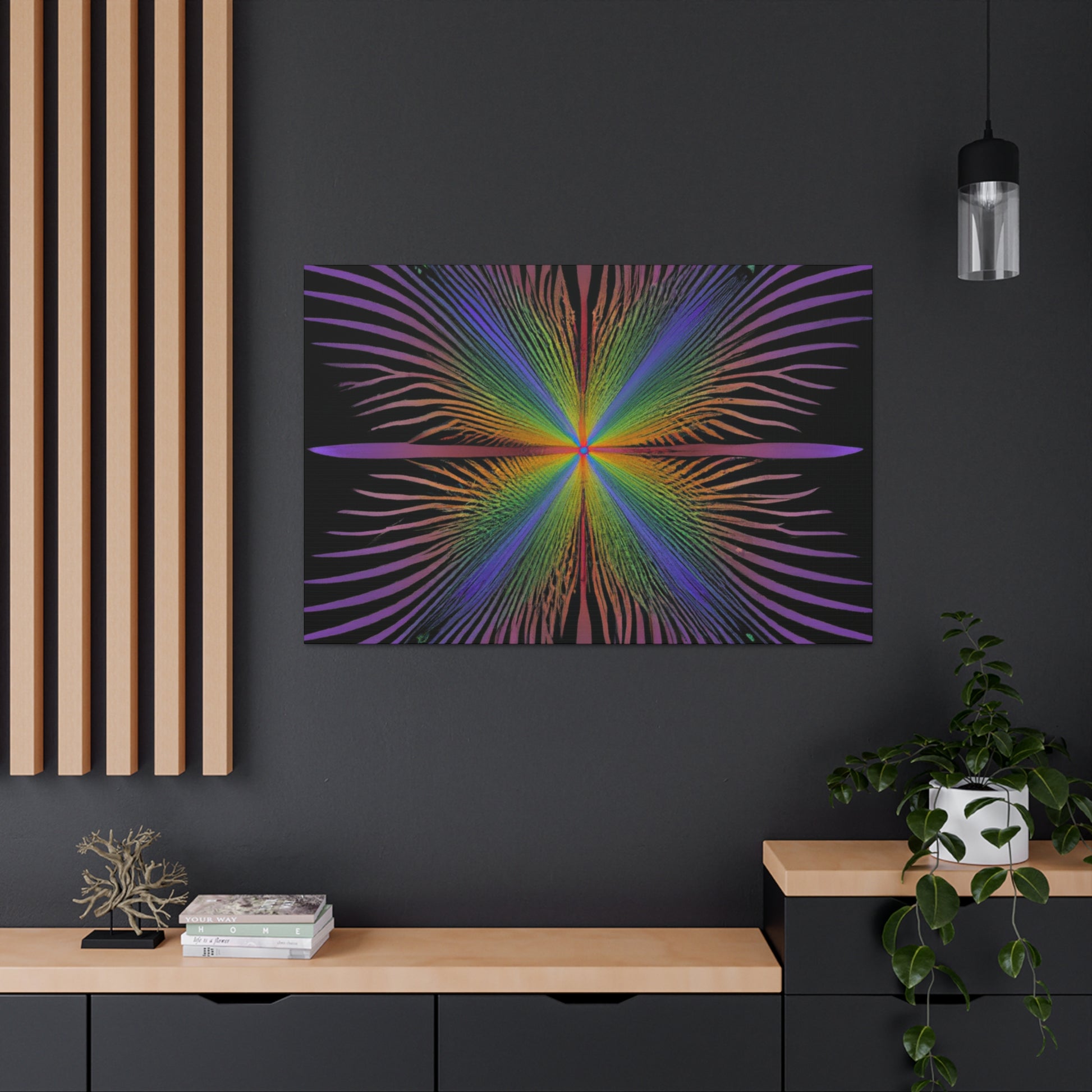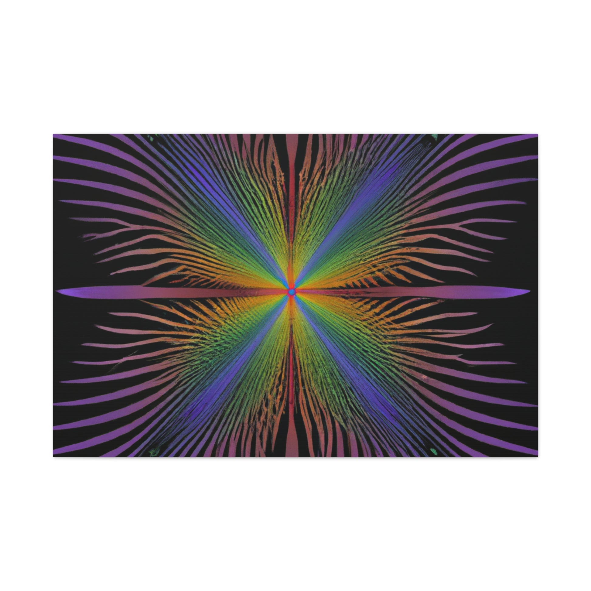 This gorgeous canvas features a radiant trippy kaleidoscope of geometric palm leaves and abstract shapes with a mesmerizing 3D fractal effect. The vibrant colors add a special touch to this digital artwork, making it a perfect piece for any wall. Let this unique design add some life and beauty to your home. #trippyart #kaleidoscope #fractal #3Dlines #palmleaves #abstractart #digitalart #canvasart #vibrantcolors #décorideas #3Dart
