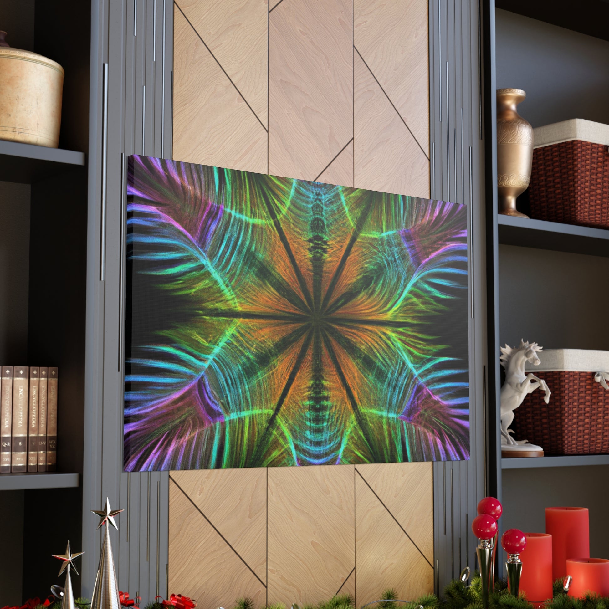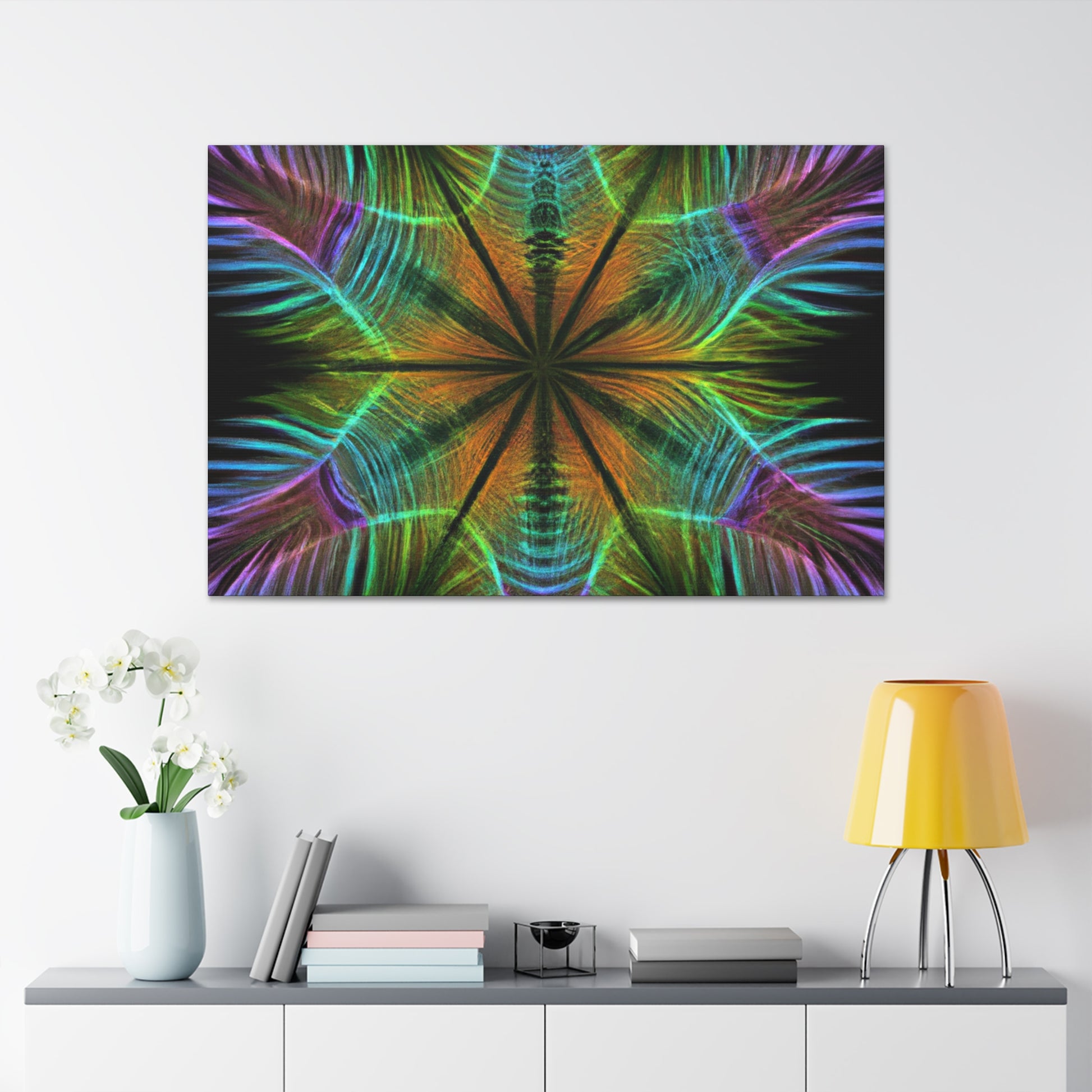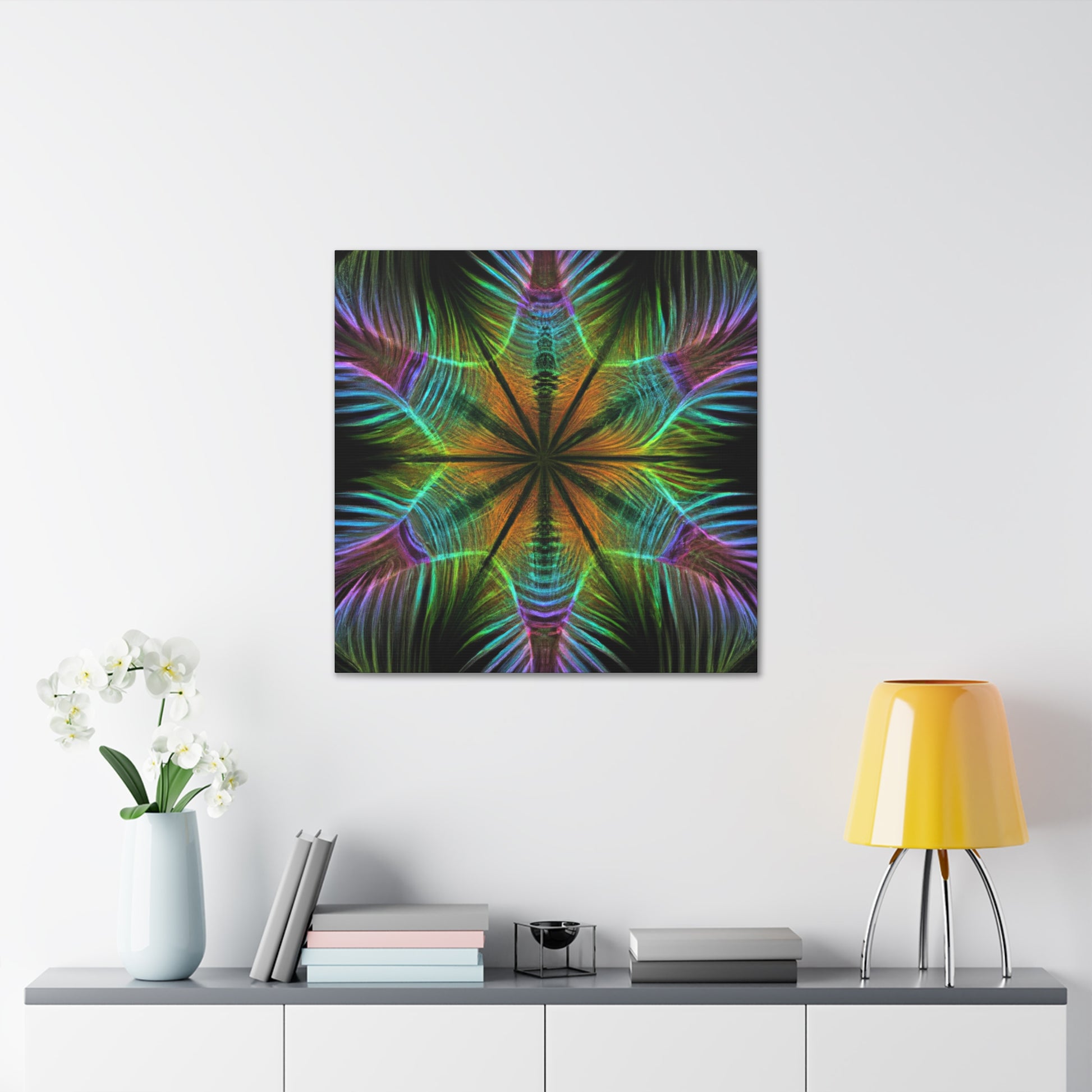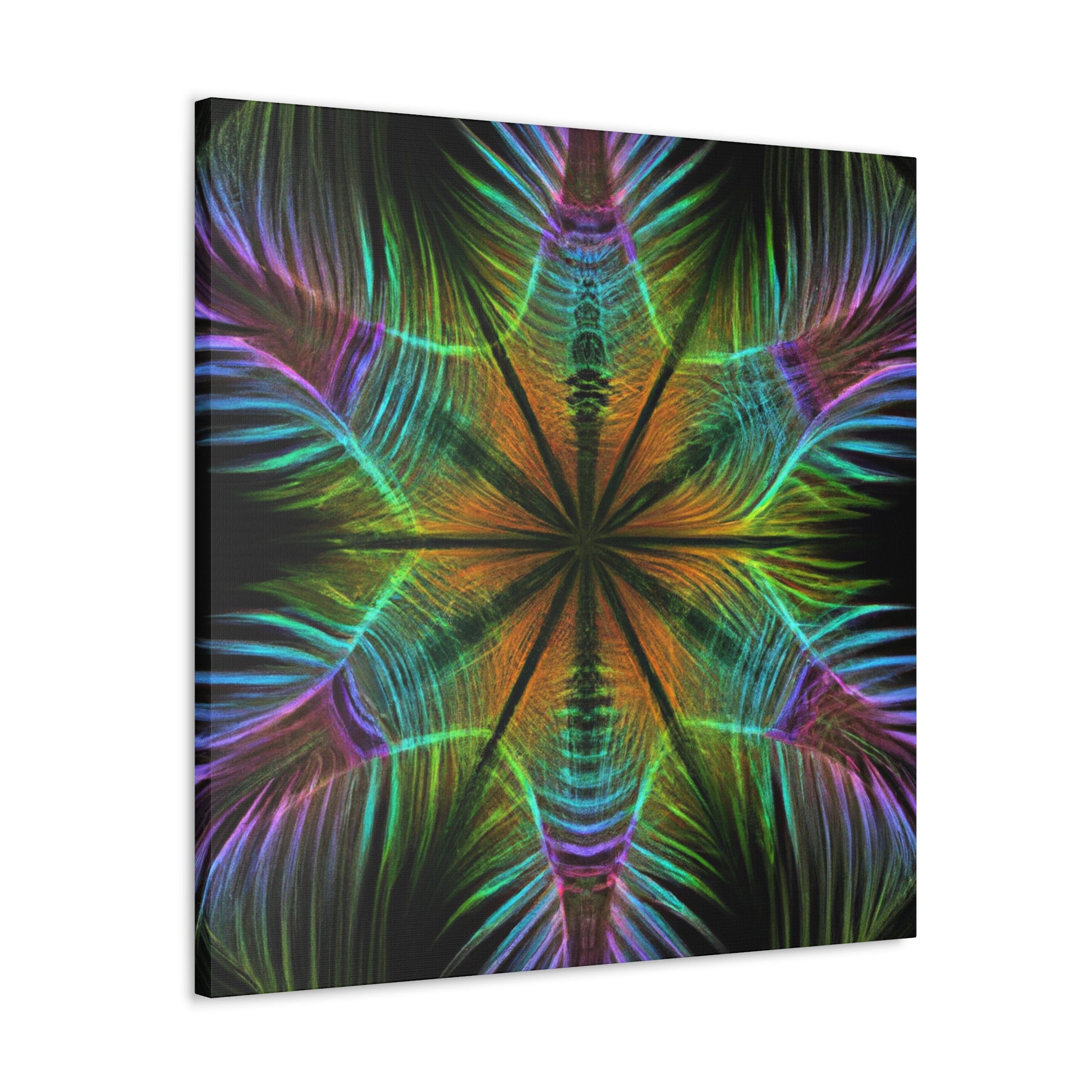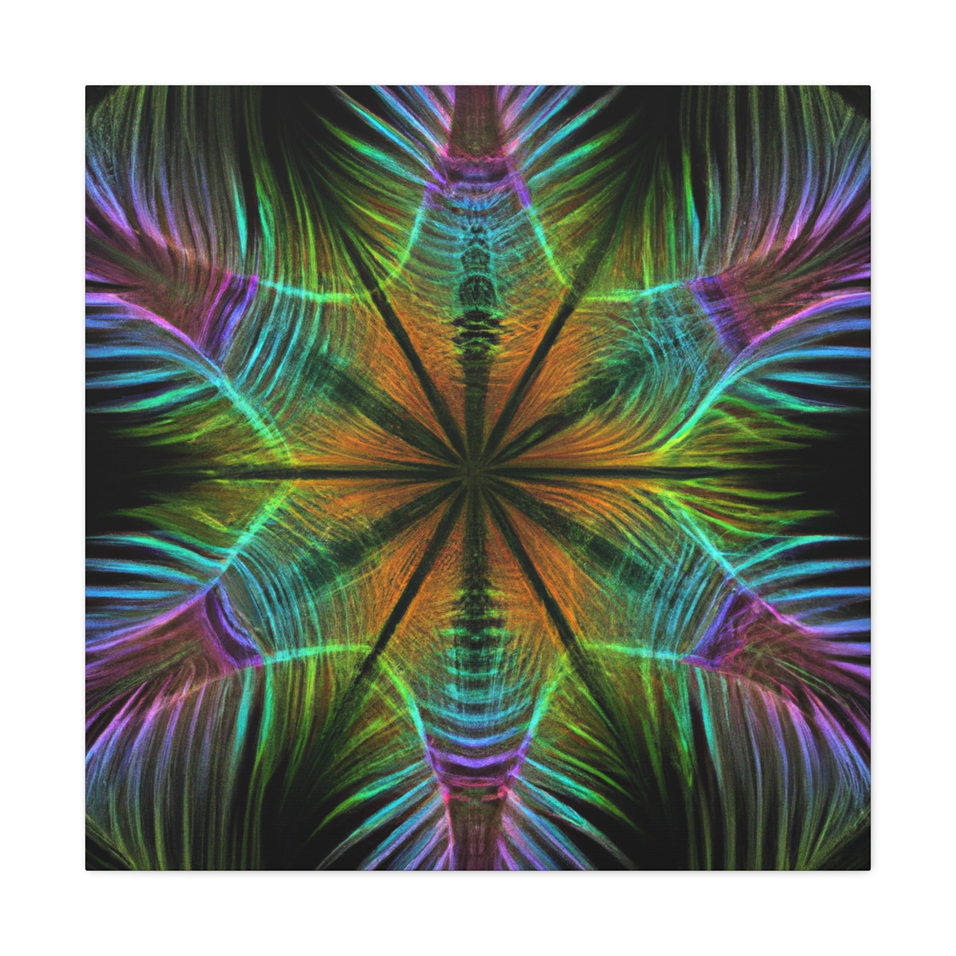 This vibrant digital artwork features a kaleidoscope of geometric palm leaves with abstract figures, 3D lines, and fractal shapes all in vibrant colors. The colors in this piece give it an energetic and surreal look, while still featuring enough complexity and detail to engage any viewer. Bring a touch of freshness and hypnotic beauty to your living space and enjoy the trippy geometric pattern all around!