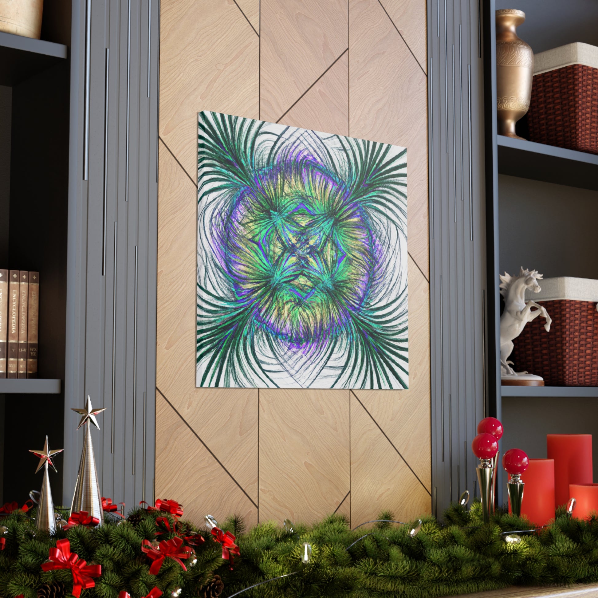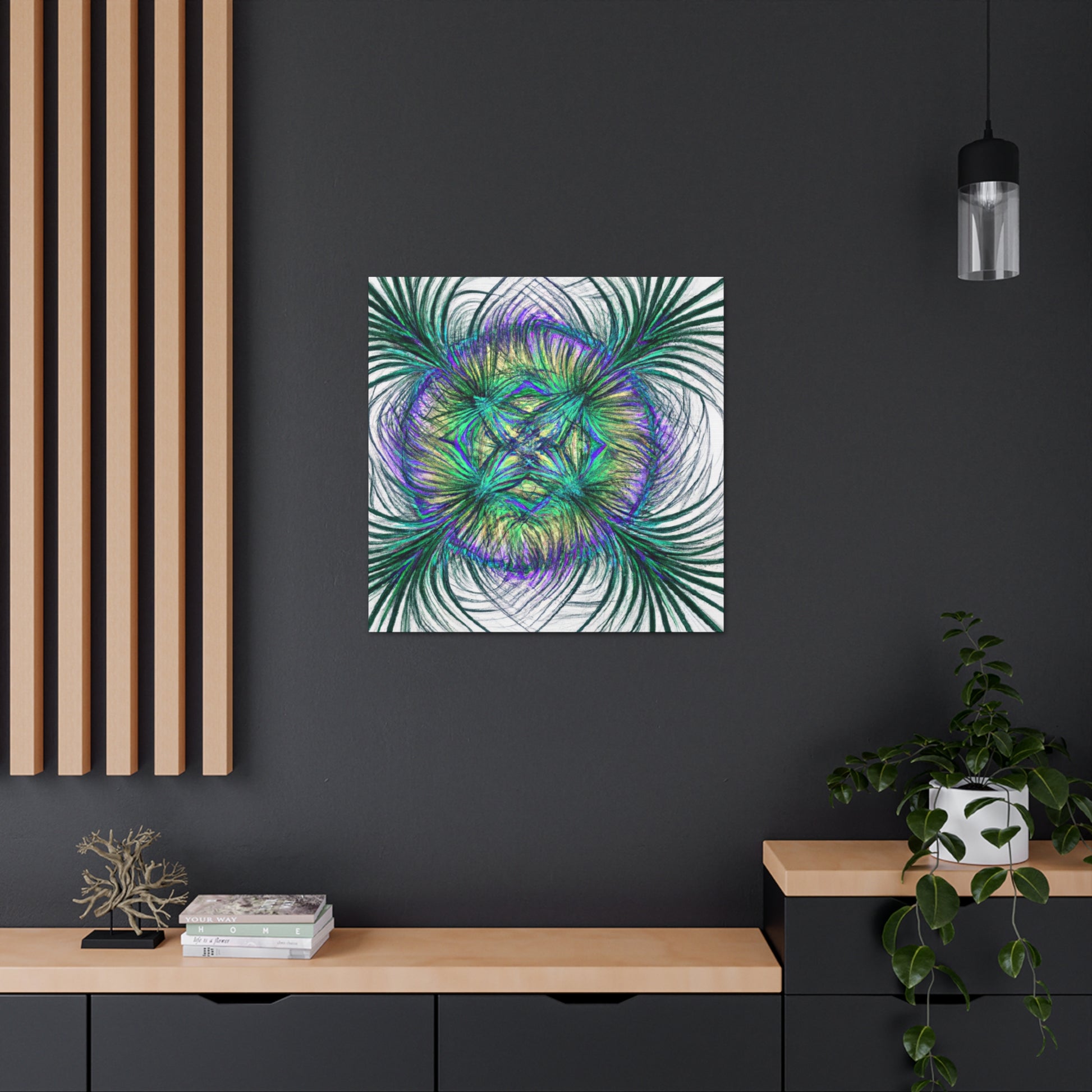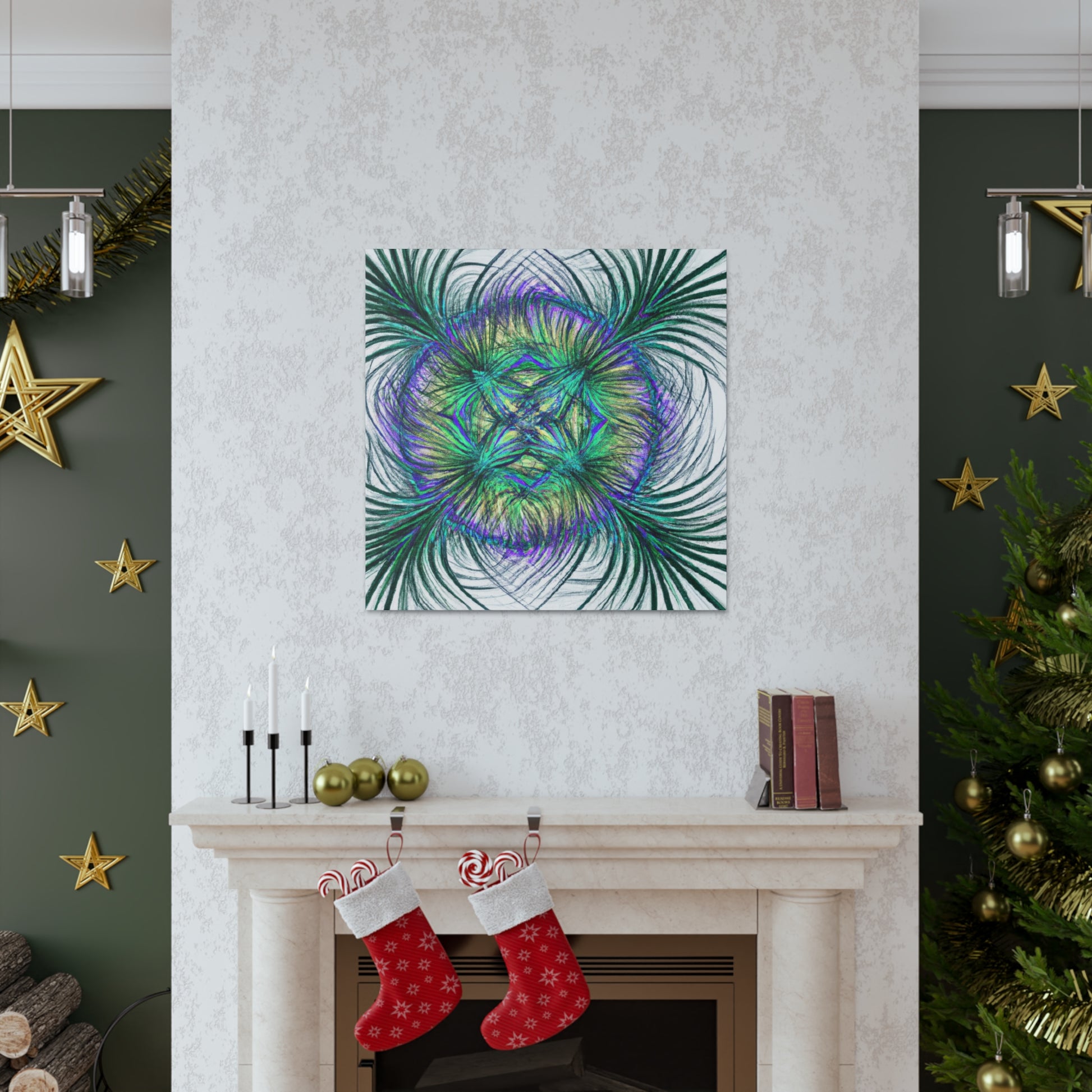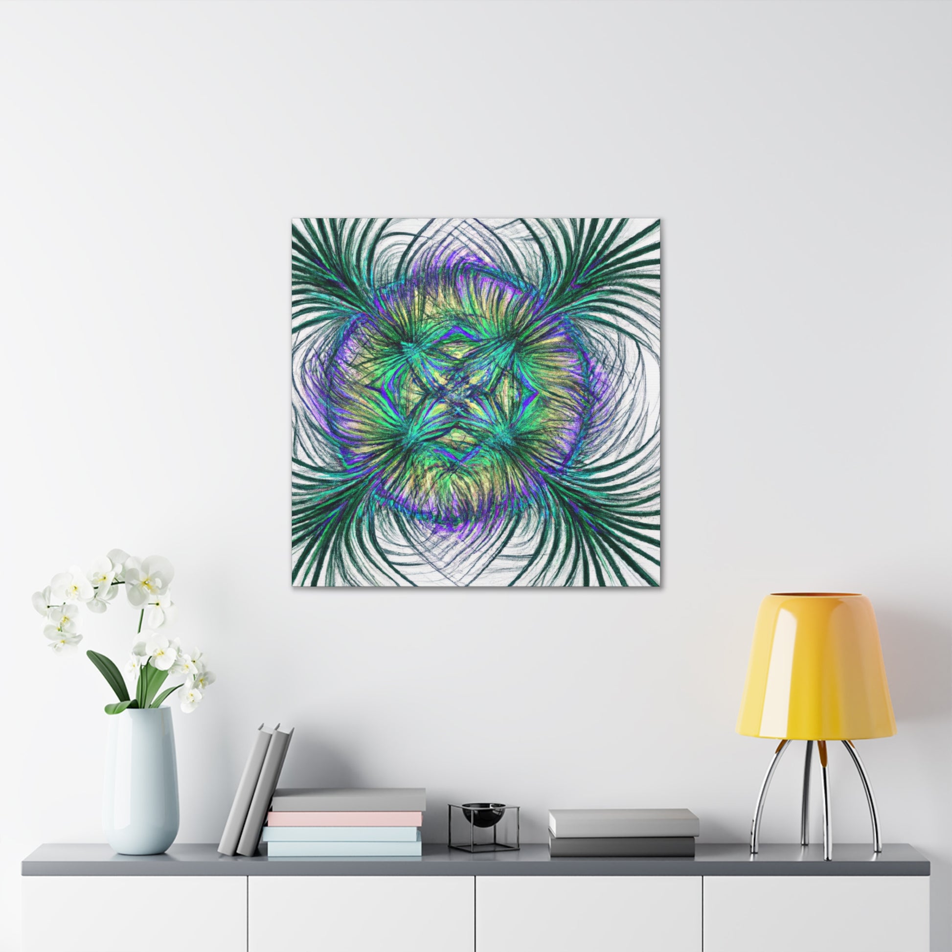 This geometric digital artwork will transport you a world of vivid colors, psychedelic fractals and abstract designs. The canvas features trippy palm leaves in a kaleidoscope pattern, complemented by 3D lines and bursts of vibrant colors. This artwork is the perfect way to express yourself and liven up any room. #abstractart #3D #digitalart #kaleidoscope #fractals #vibrantcolors #palmleaves #trippy #geometric #artwork #expression