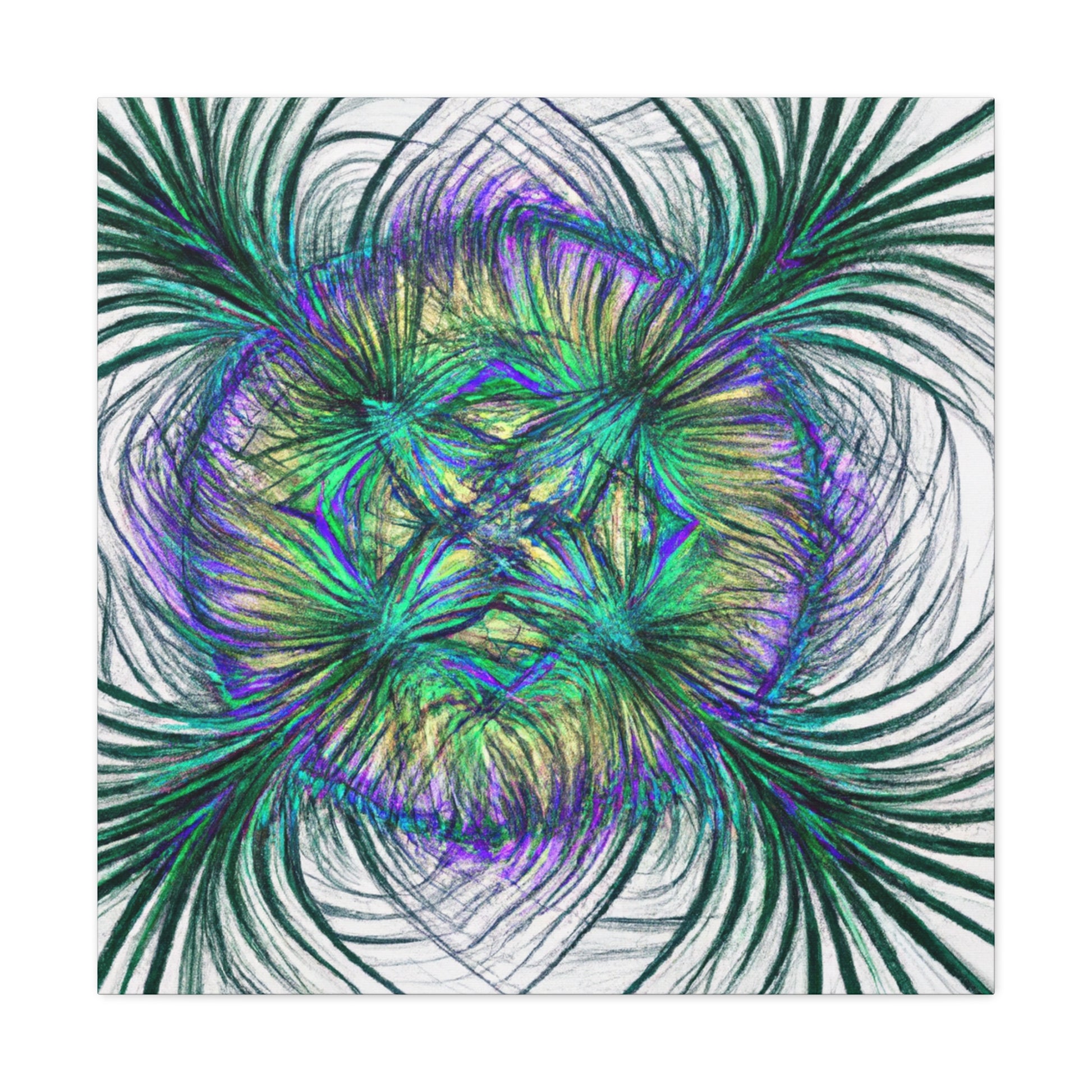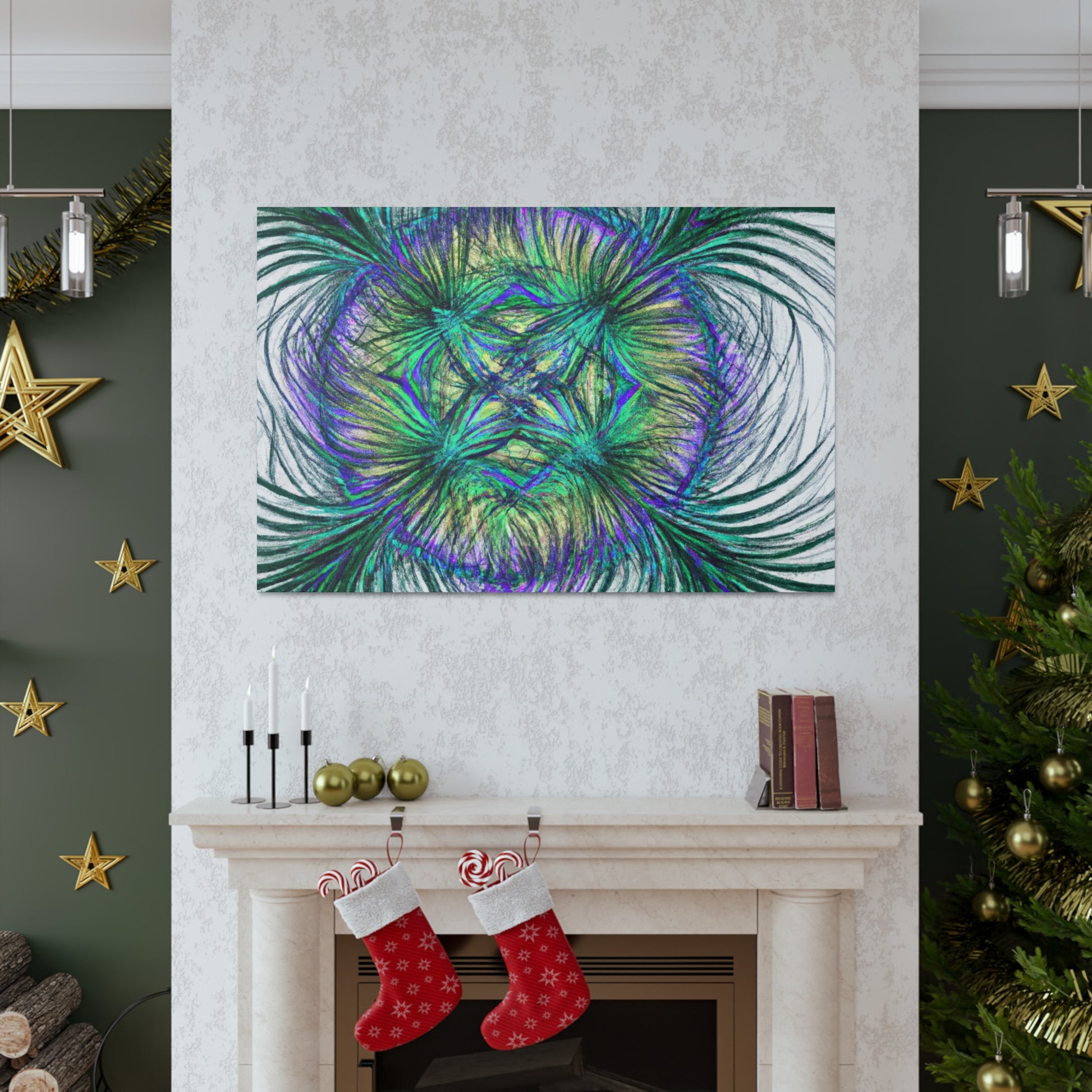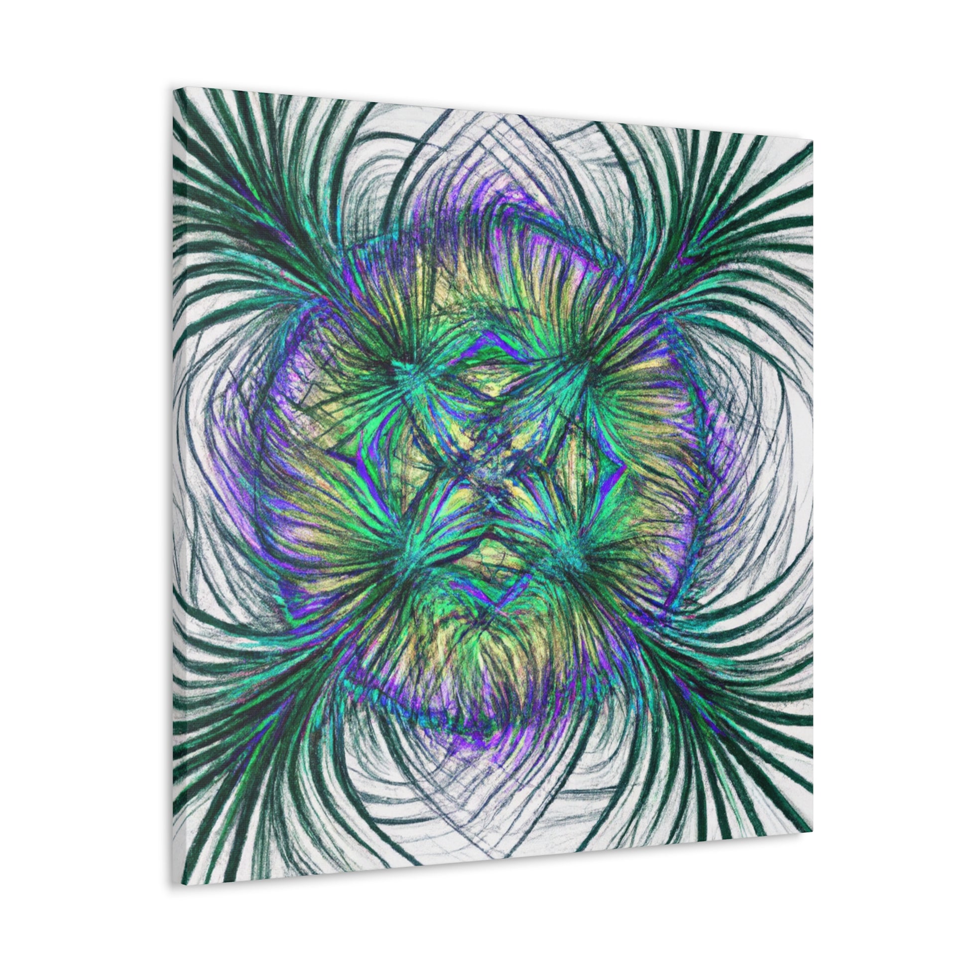 This geometric digital artwork will transport you a world of vivid colors, psychedelic fractals and abstract designs. The canvas features trippy palm leaves in a kaleidoscope pattern, complemented by 3D lines and bursts of vibrant colors. This artwork is the perfect way to express yourself and liven up any room. #abstractart #3D #digitalart #kaleidoscope #fractals #vibrantcolors #palmleaves #trippy #geometric #artwork #expression