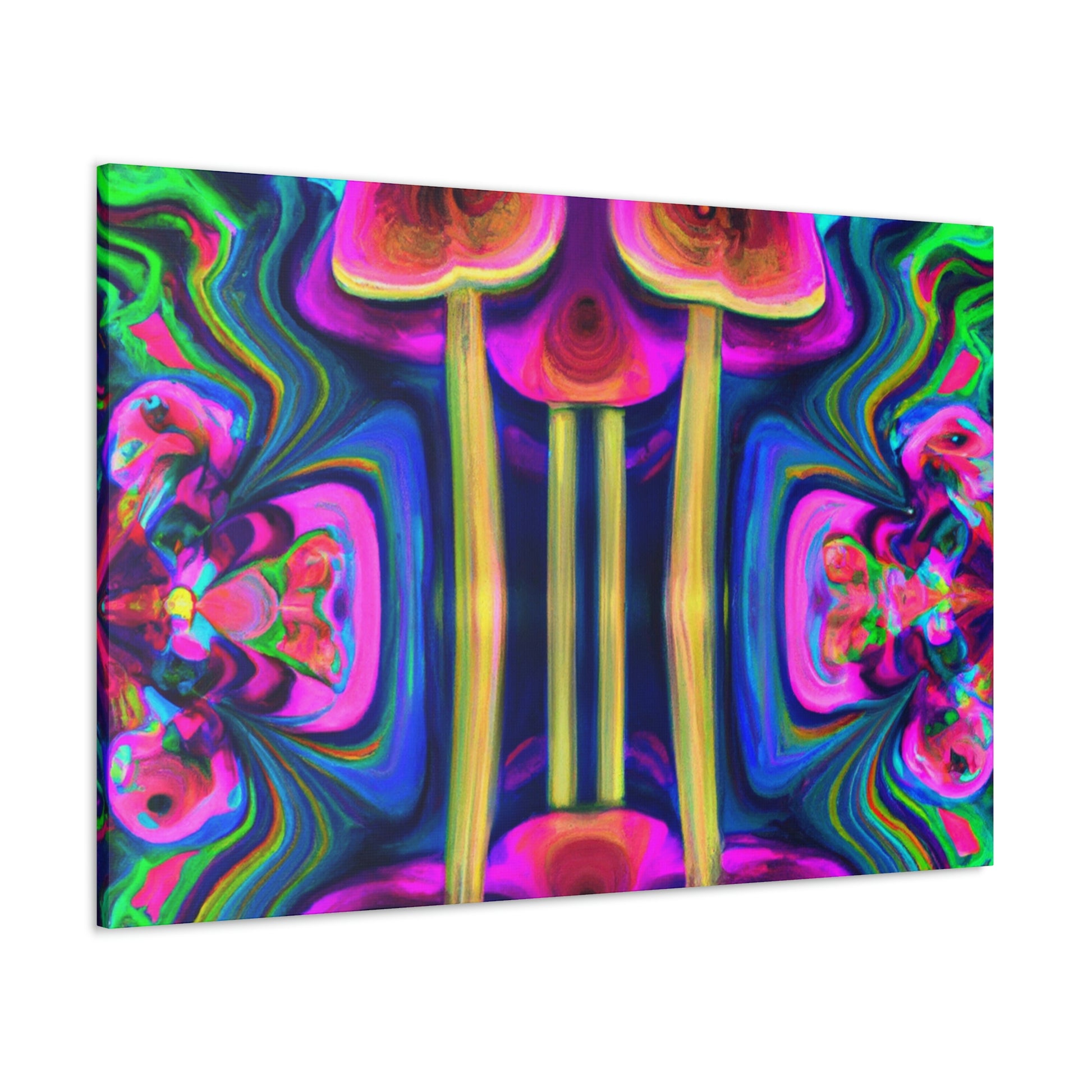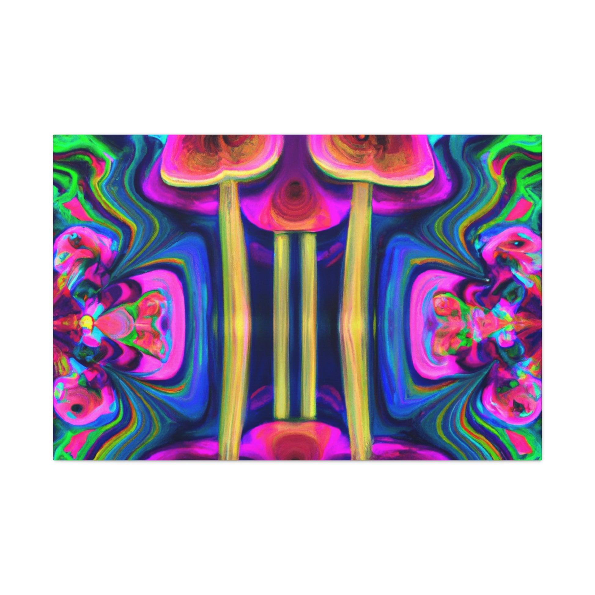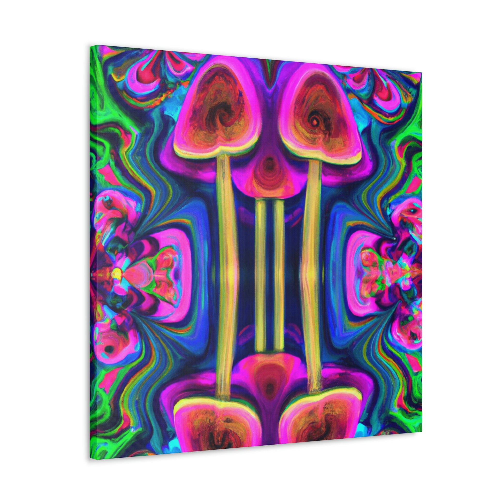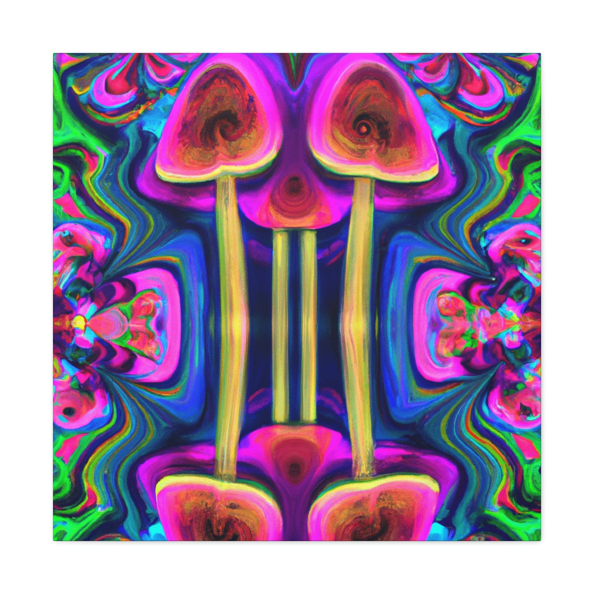 This digital art canvas features an abstract design of trippy mushrooms with kaleidoscope patterns and vibrant colors of 3D lines. It's sure to add some life and fun to any room with its mesmerizing display. Perfect for a modern home or office, this canvas is a one-of-a-kind piece of art. #abstractart #trippyart #mushroomart #kaleidoscopart #digitalart #colorfulart #3Dlines #vibrantcolors #artisticcanvas #uniquewallhangings #canvasart