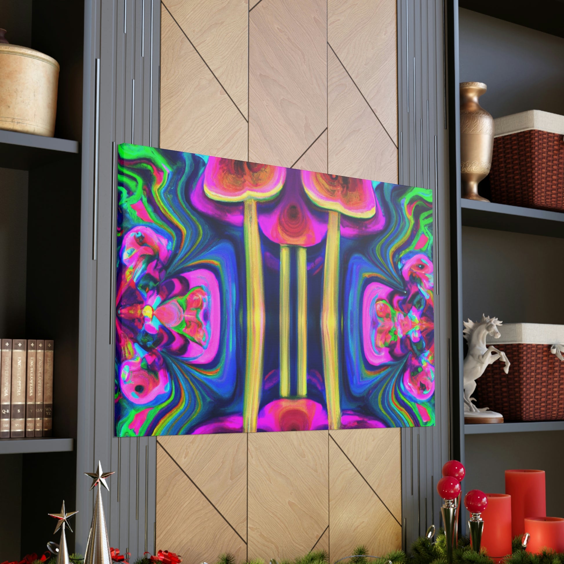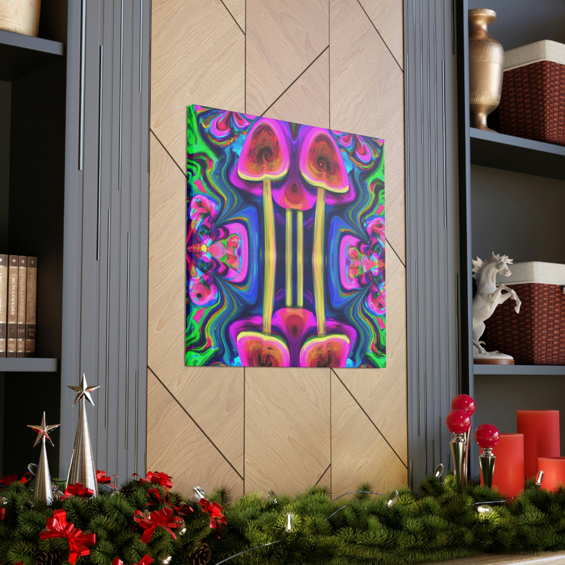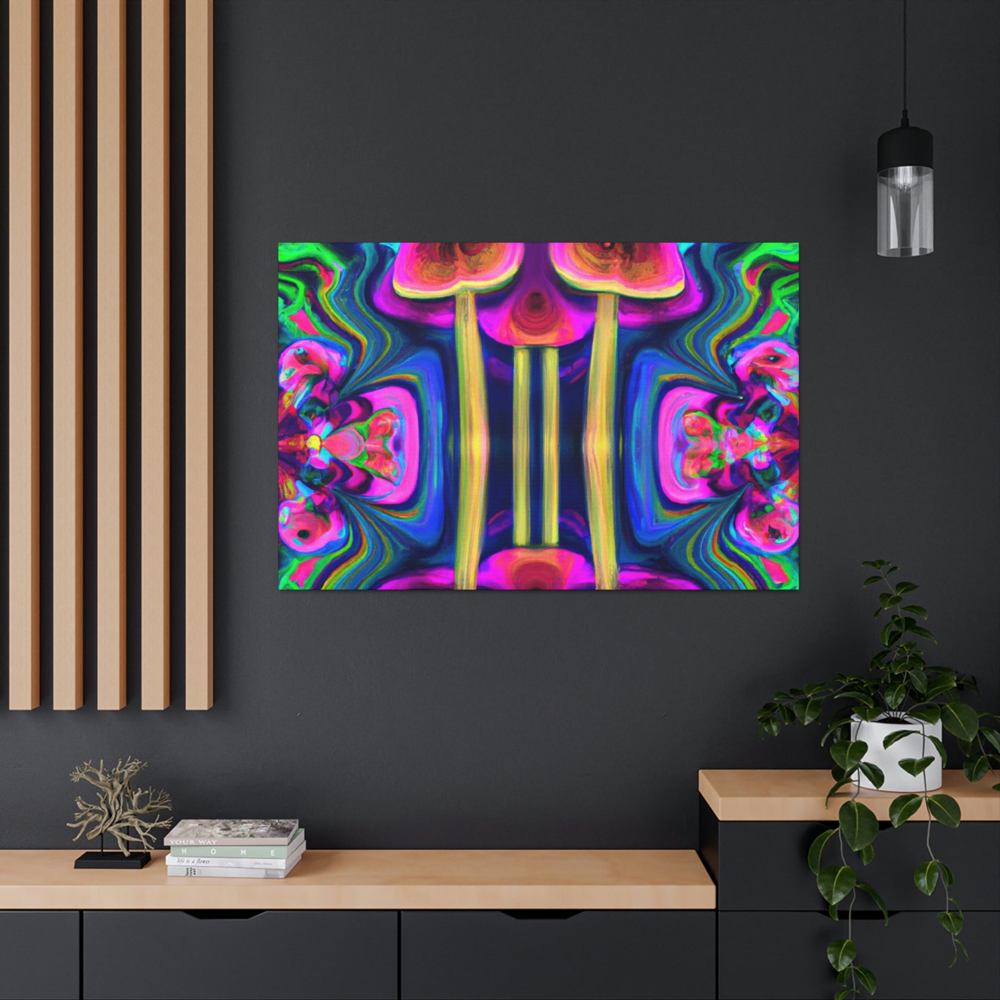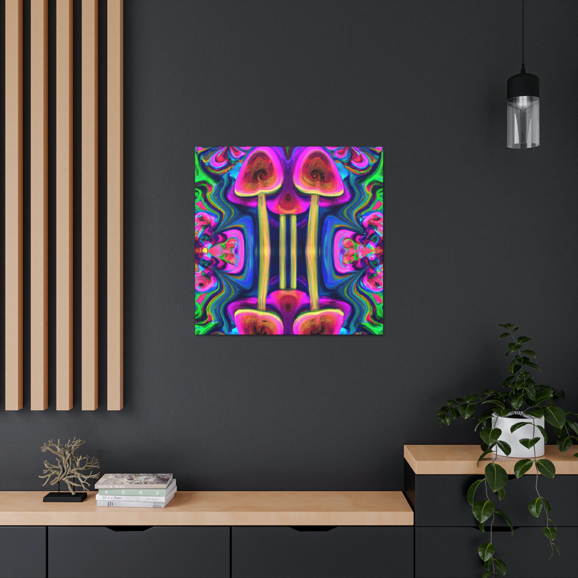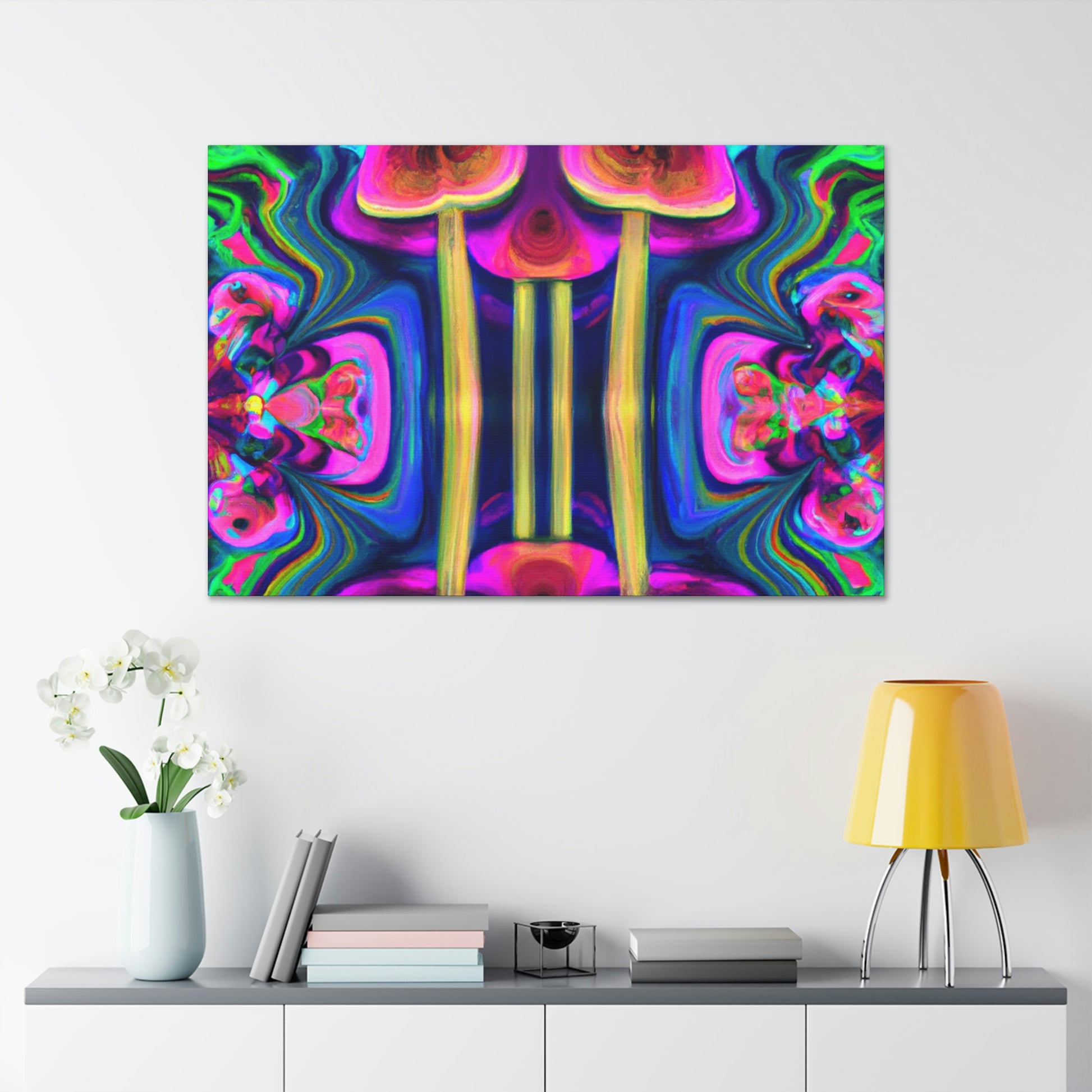 This digital art canvas features an abstract design of trippy mushrooms with kaleidoscope patterns and vibrant colors of 3D lines. It's sure to add some life and fun to any room with its mesmerizing display. Perfect for a modern home or office, this canvas is a one-of-a-kind piece of art. #abstractart #trippyart #mushroomart #kaleidoscopart #digitalart #colorfulart #3Dlines #vibrantcolors #artisticcanvas #uniquewallhangings #canvasart