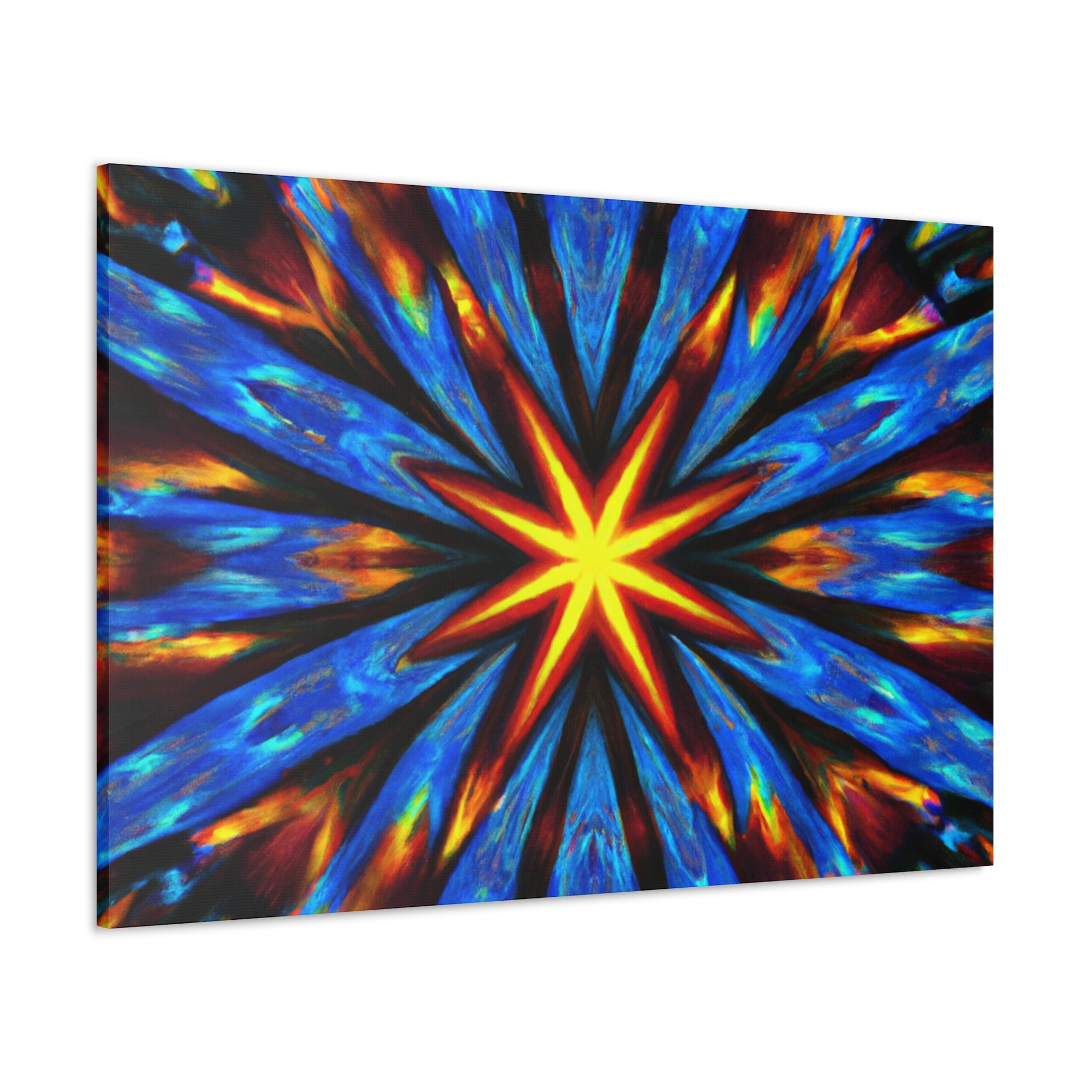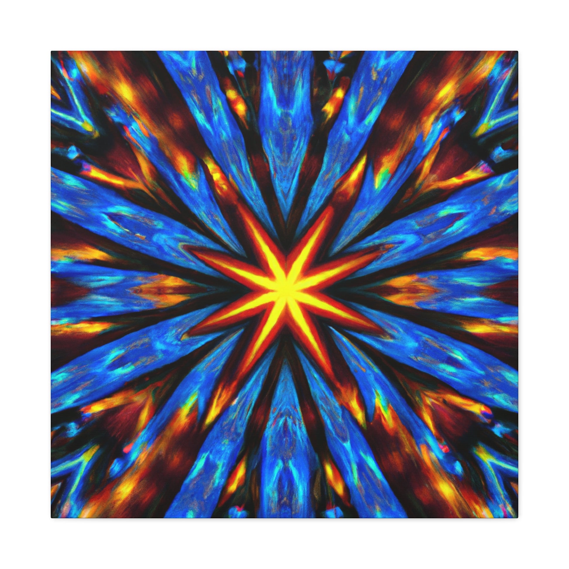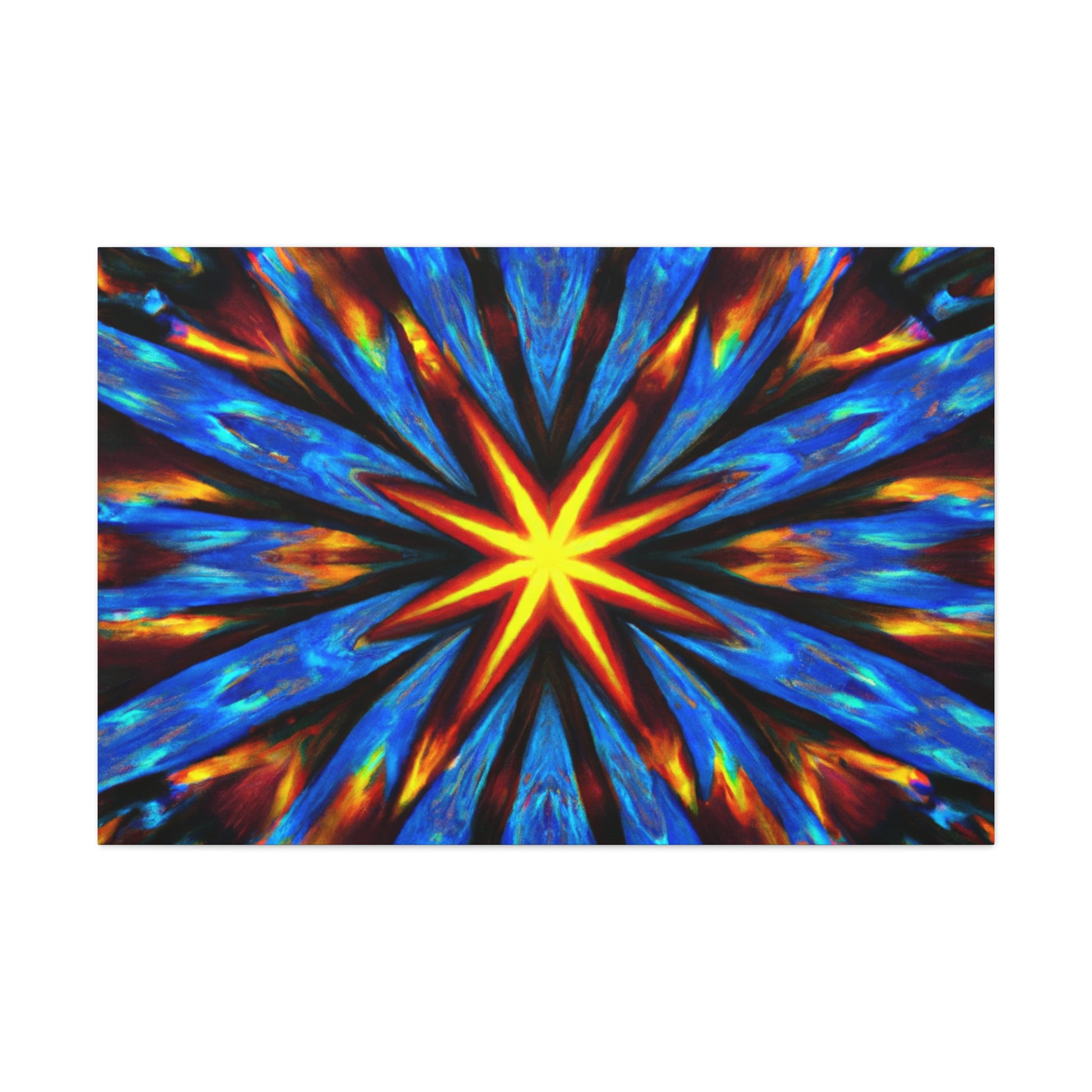 Brighten up your walls with this vibrant and eye-catching canvas print of abstract digital art featuring trippy stars and kaleidoscopic patterns. Printed in HD on quality UV-resistant canvas, this masterpiece creates a uniquely symmetrical effect. With its slew of dynamic colors and bold lines, it's sure to be the focal point of any room. #abstractart #trippystars #kaleidoscope #digitalart #vibrantcolors #HD #symmetrical #canvasprint #canvaswallart #wallart #statementpiece