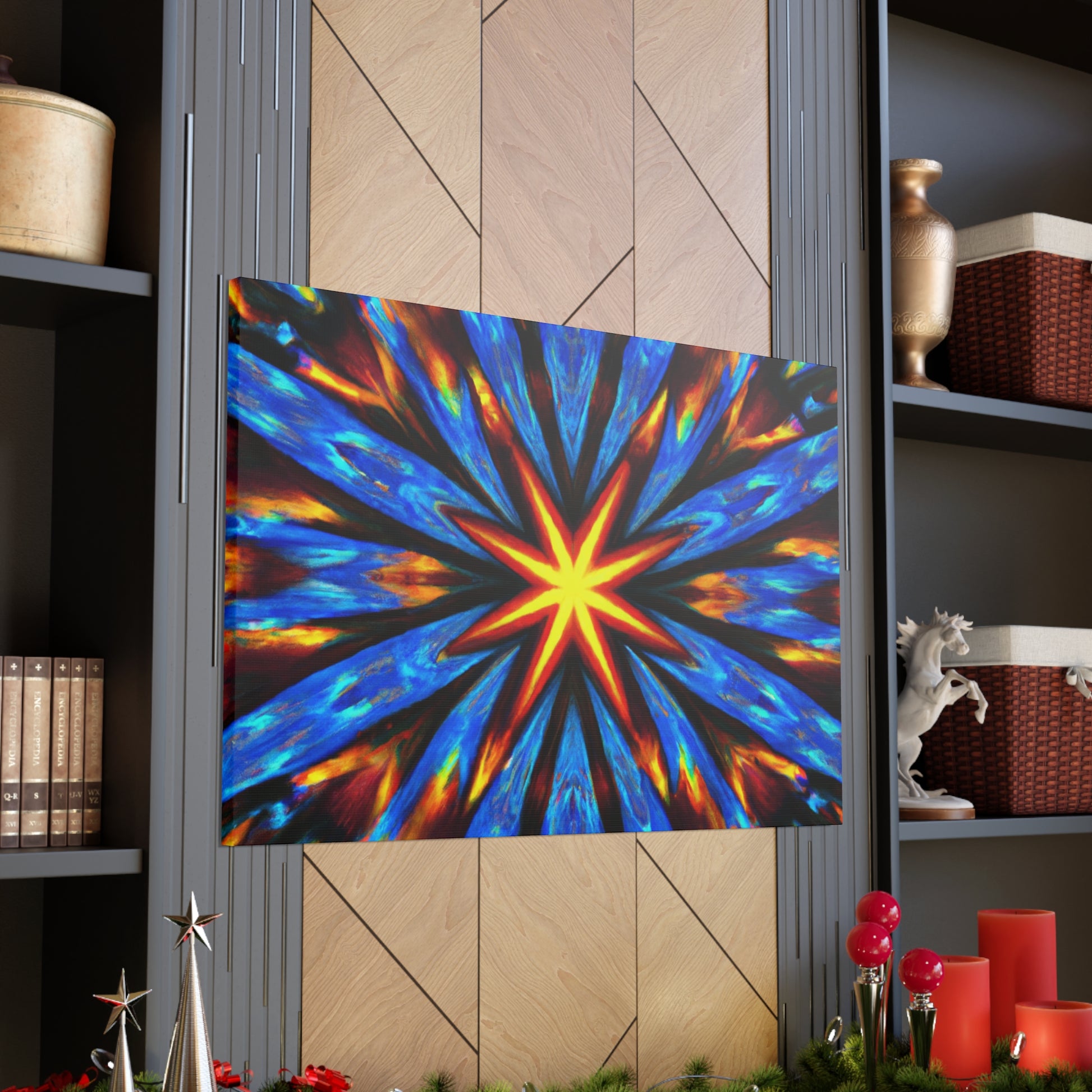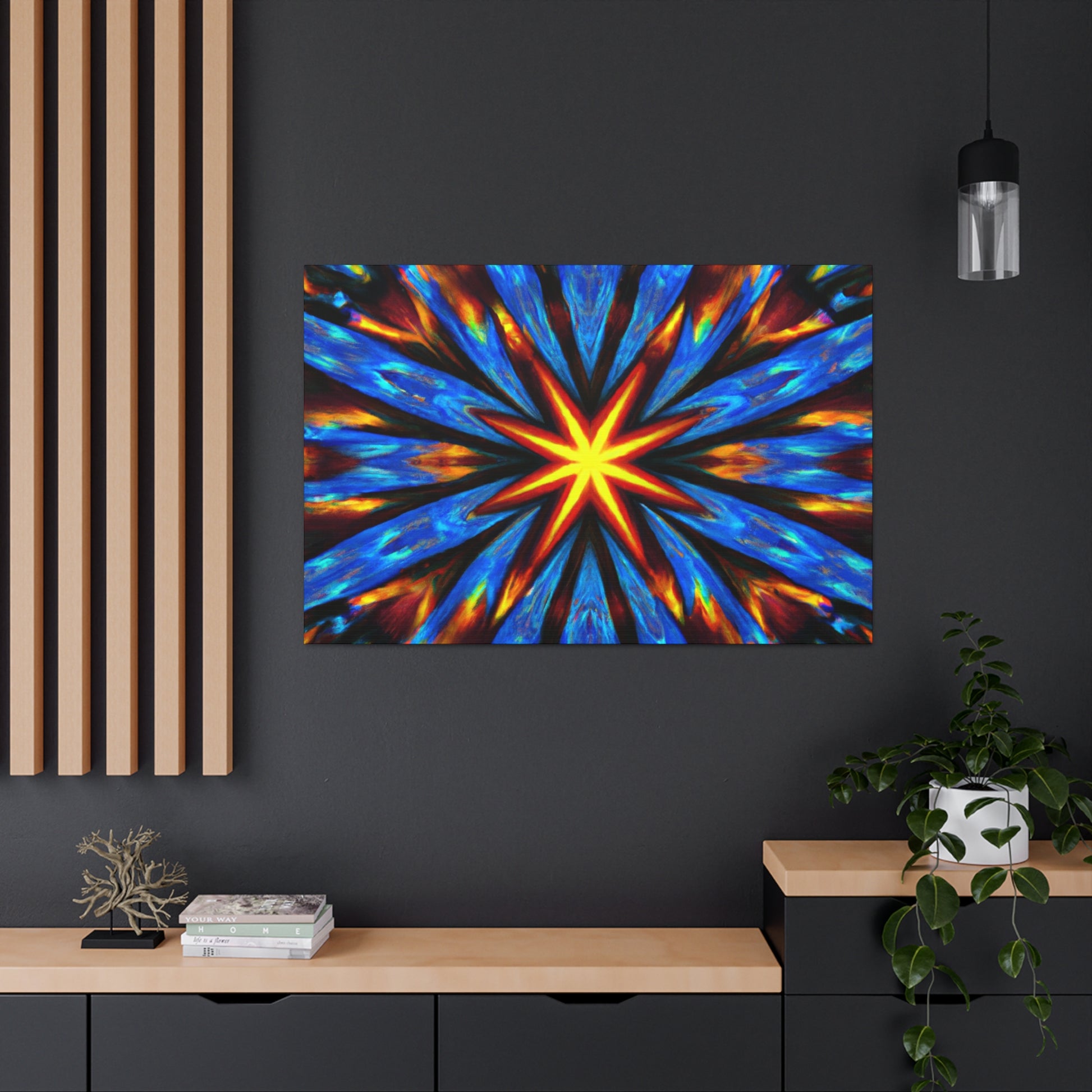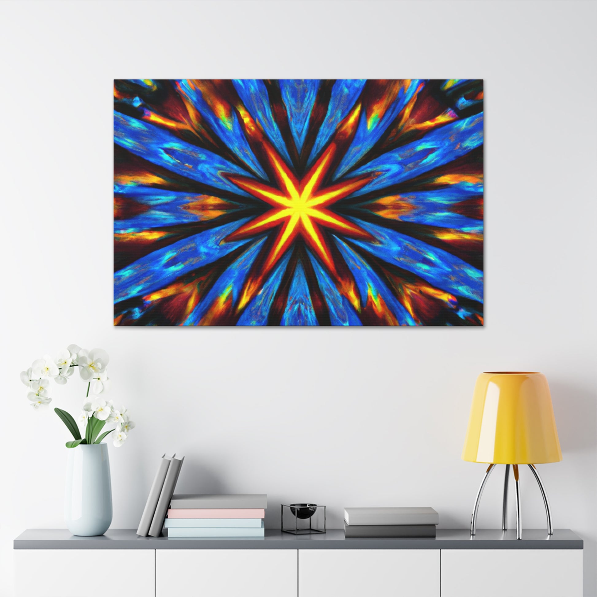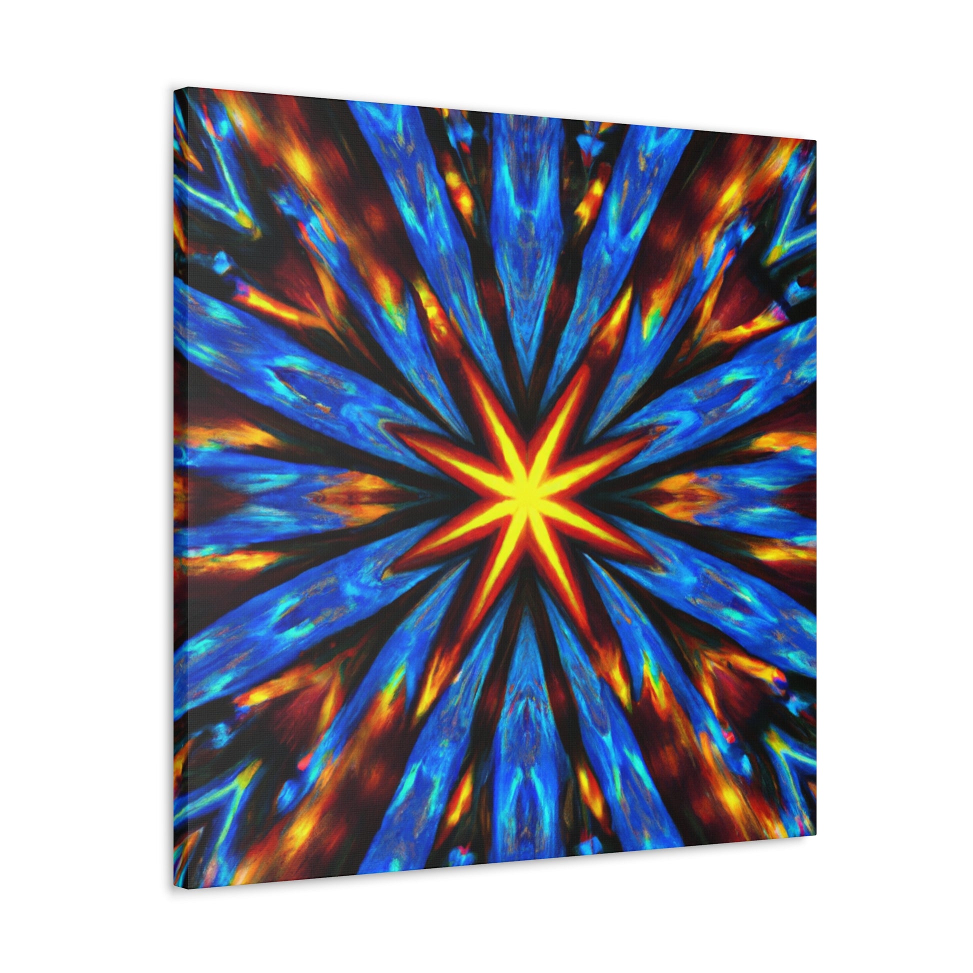 Brighten up your walls with this vibrant and eye-catching canvas print of abstract digital art featuring trippy stars and kaleidoscopic patterns. Printed in HD on quality UV-resistant canvas, this masterpiece creates a uniquely symmetrical effect. With its slew of dynamic colors and bold lines, it's sure to be the focal point of any room. #abstractart #trippystars #kaleidoscope #digitalart #vibrantcolors #HD #symmetrical #canvasprint #canvaswallart #wallart #statementpiece
