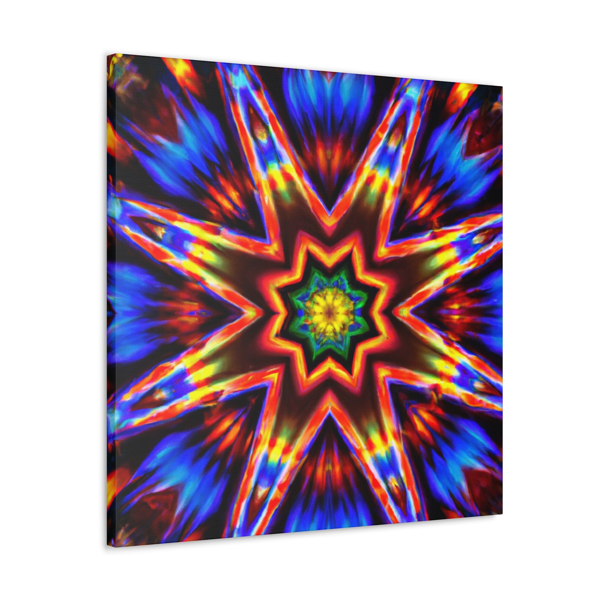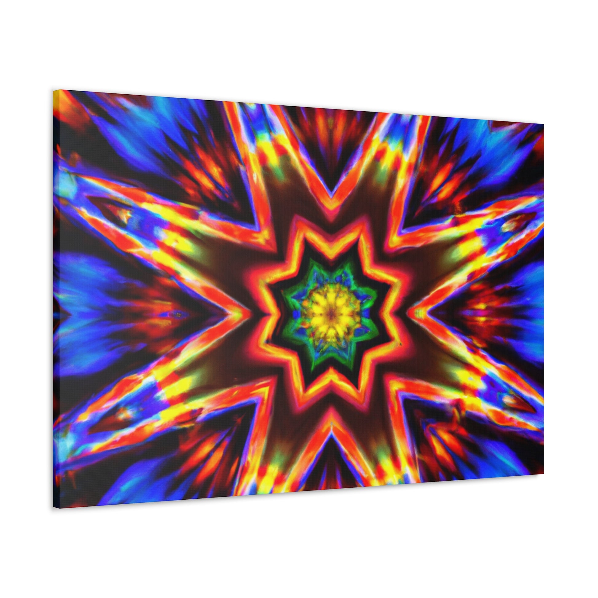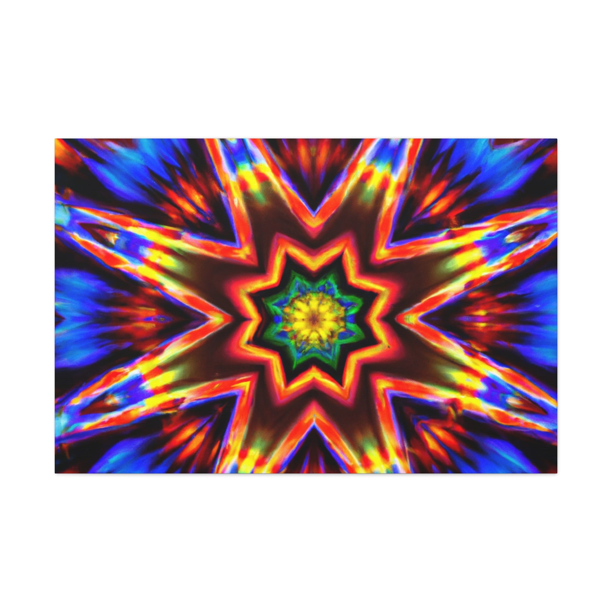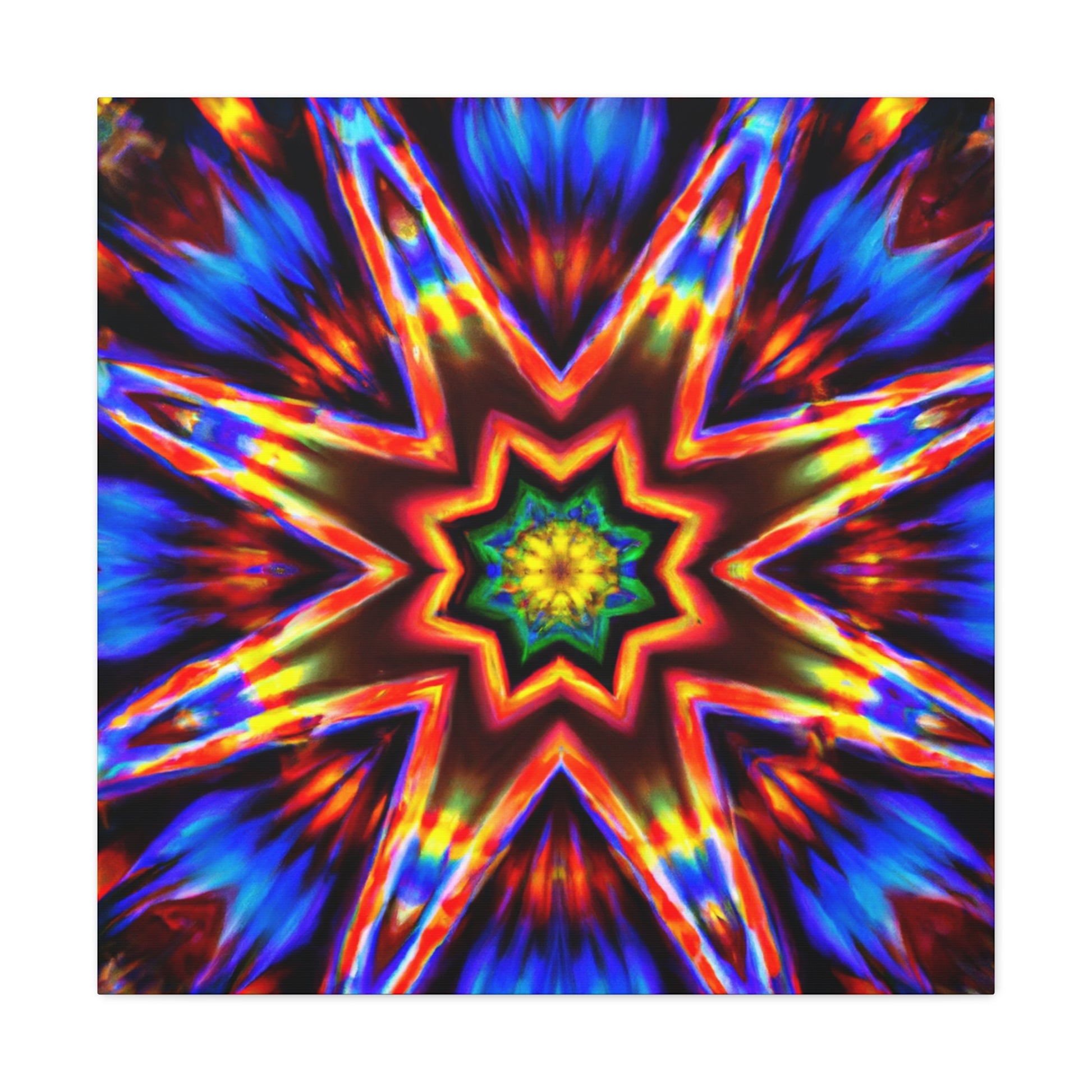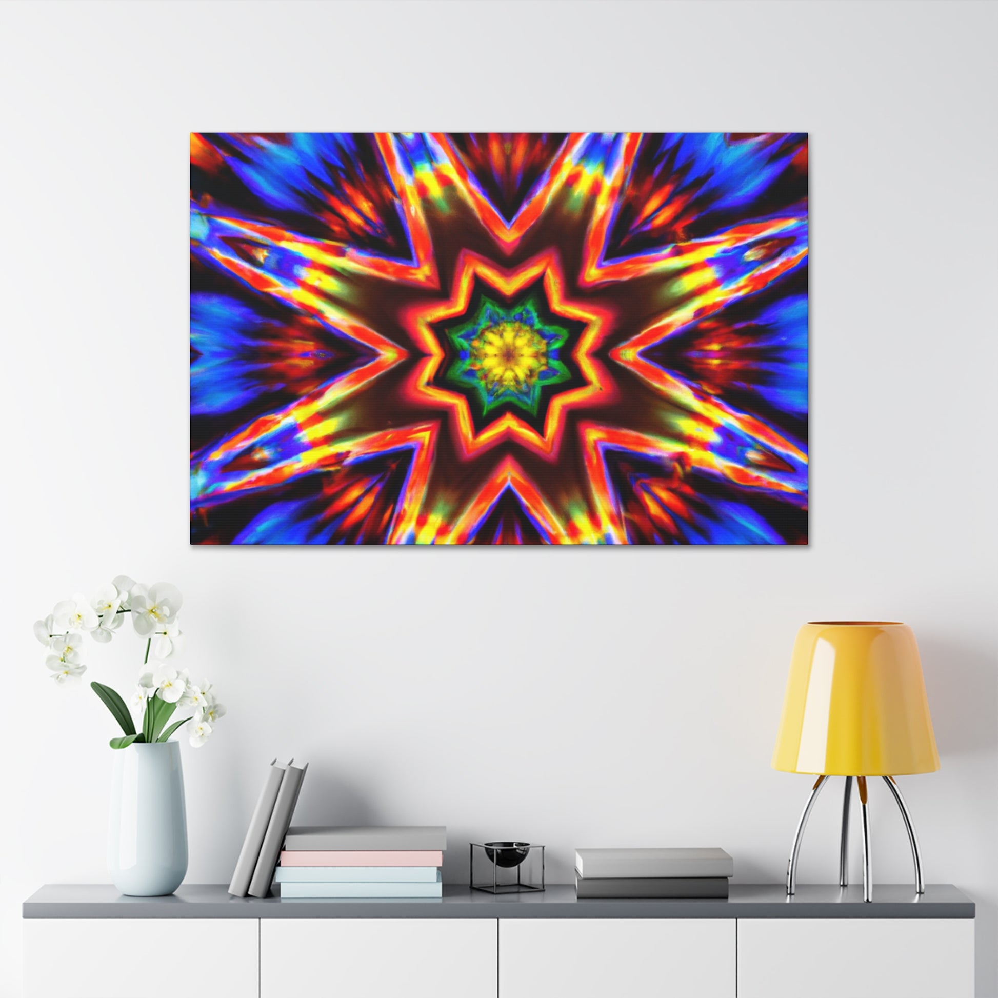 This vibrant HD canvas features abstract digital art, with a symmetrical kaleidoscopic pattern of trippy stars, and vibrant colors. It is sure to elevate the ambience of any room! #interiordecor #canvas #HD #digitalart #abstractart #kaleidoscope #vibrant #trippystars #symmetrical #decor #roomambience