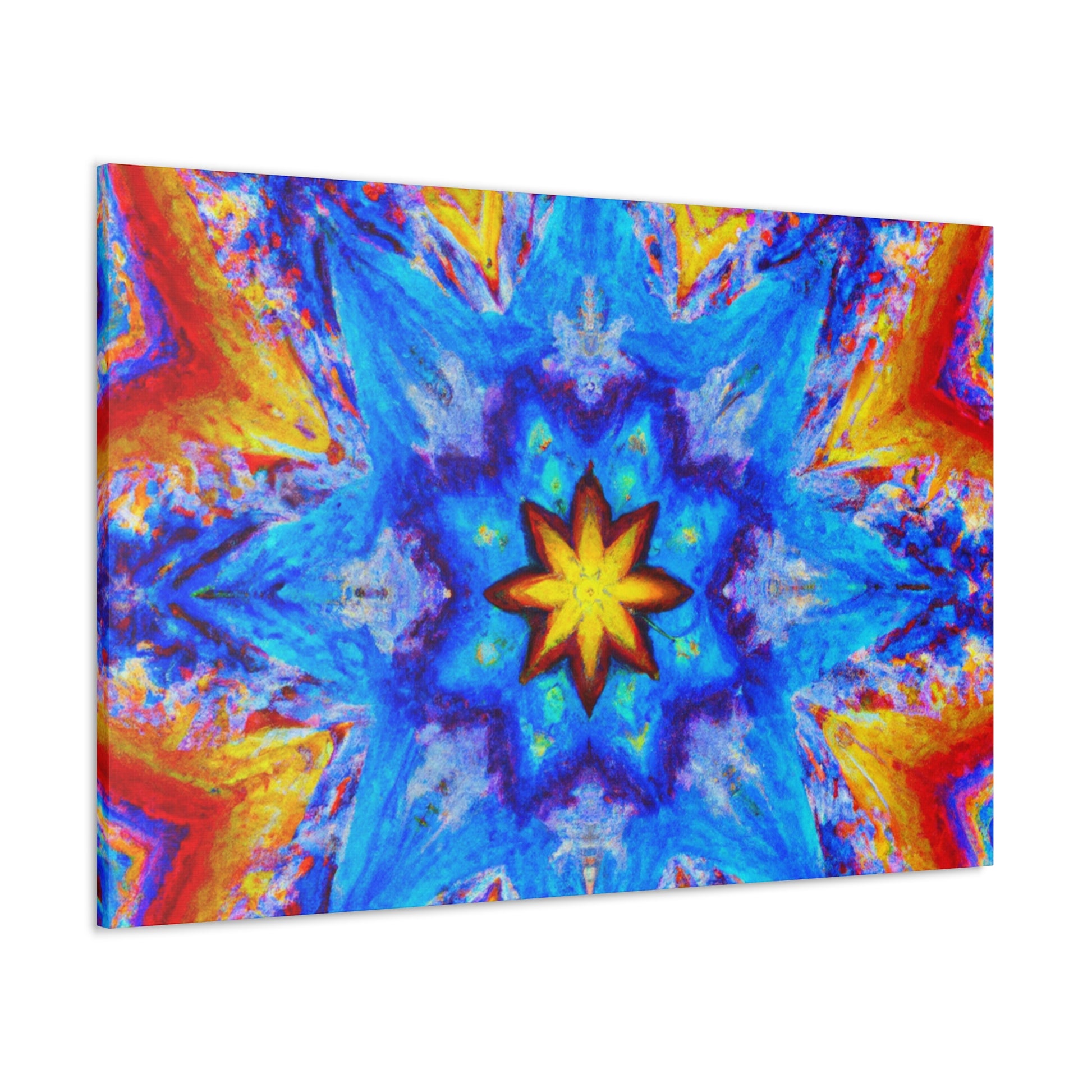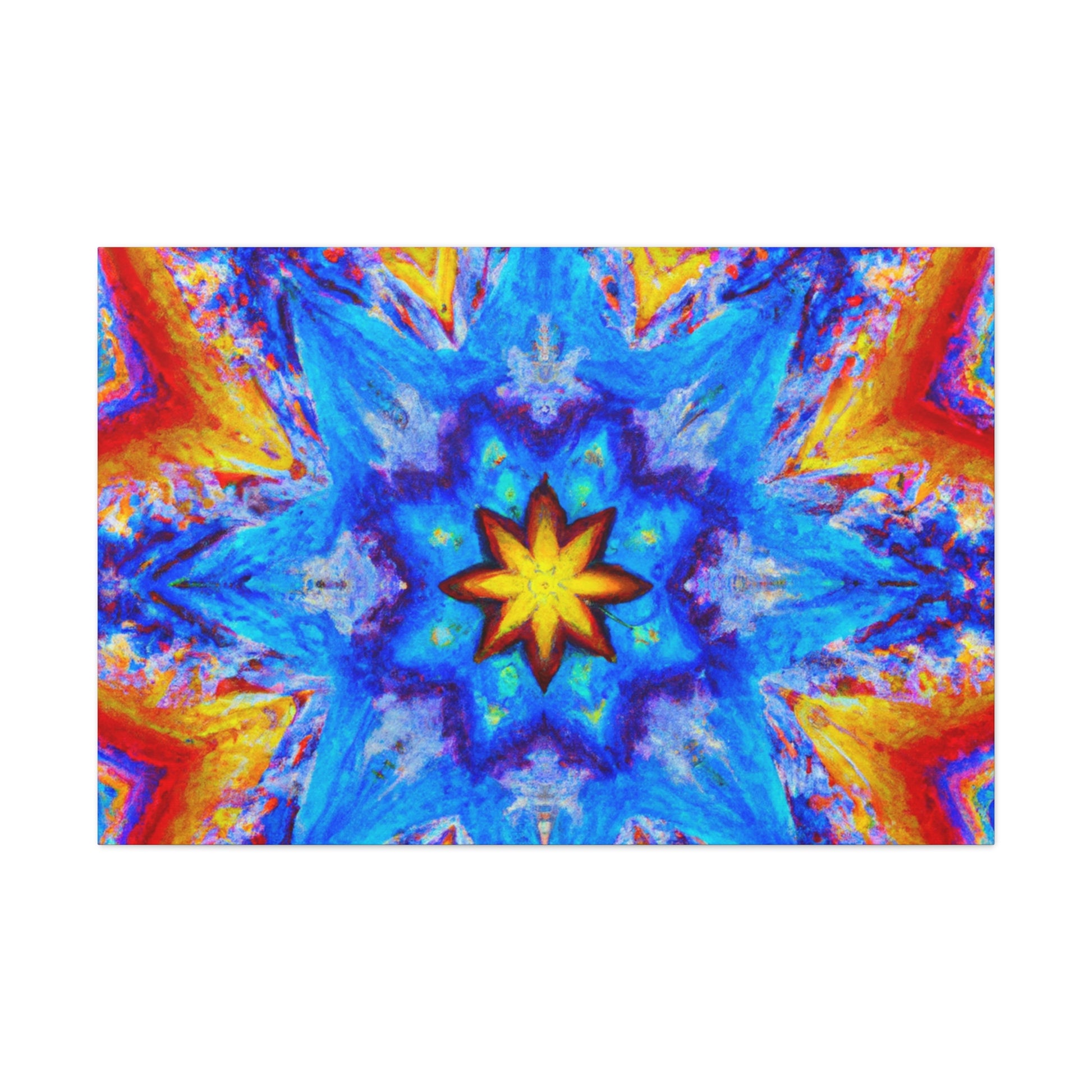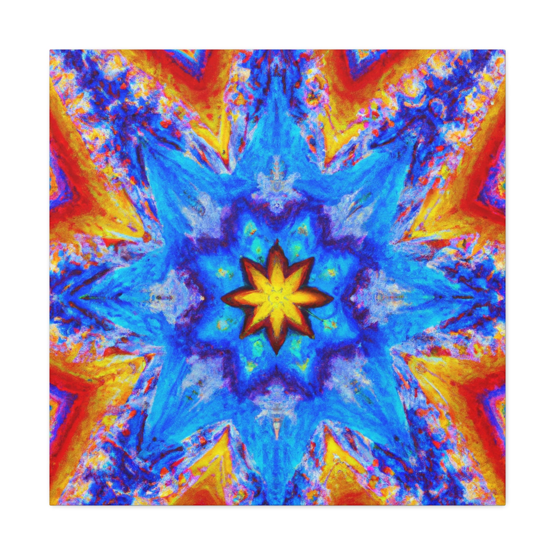 This vibrant and abstract digital art canvas will add some energy and life to any space! It features stars, kaleidoscope and abstract shapes in vivid HD colors that are sure to get noticed. With its symmetrical shape, the overall look is both eye-catching and mesmerizing. #trippy #kaleidoscope #abstract #art #digitalart #vibrantcolors #HD #symmetrical #canvas #statementpiece #interiordesign