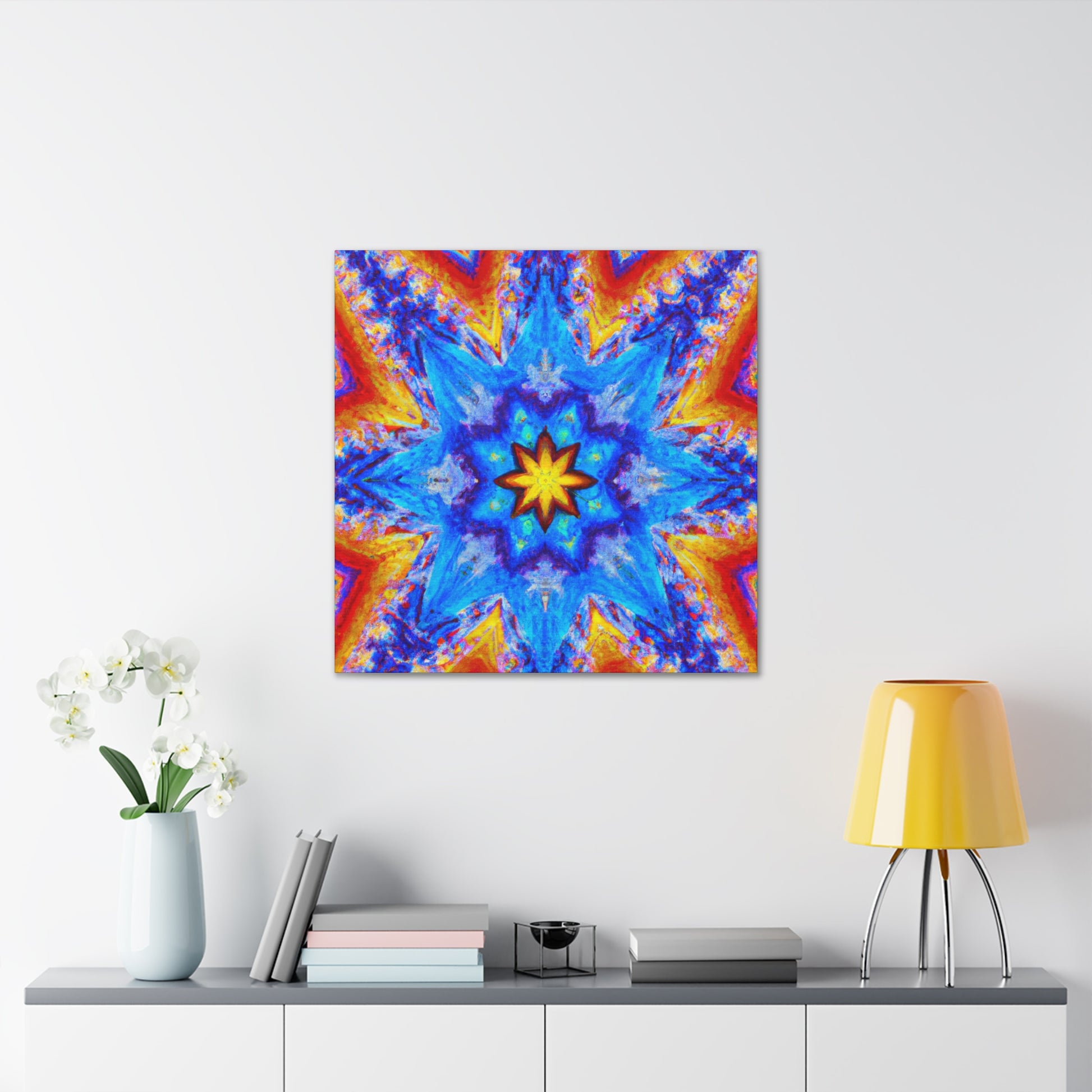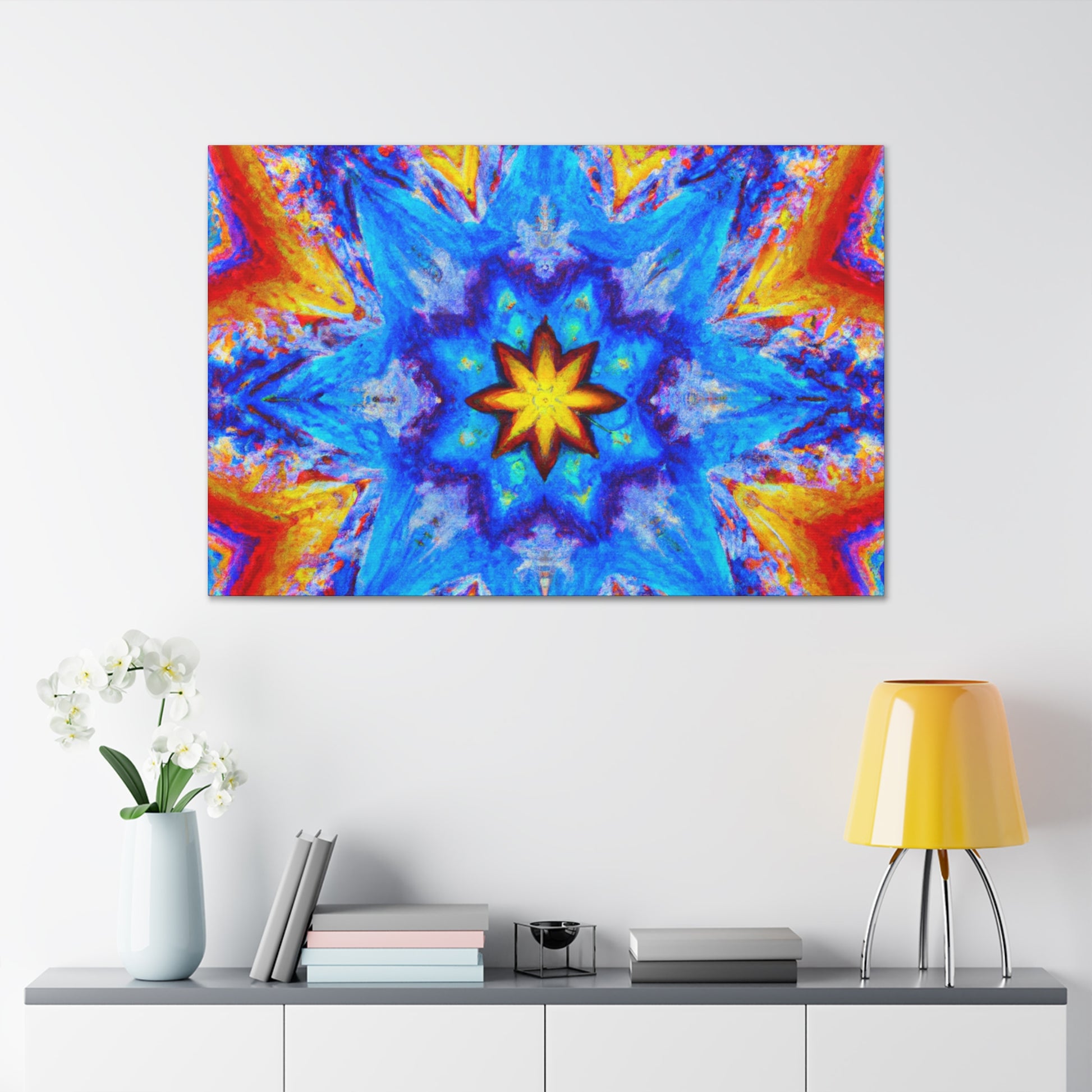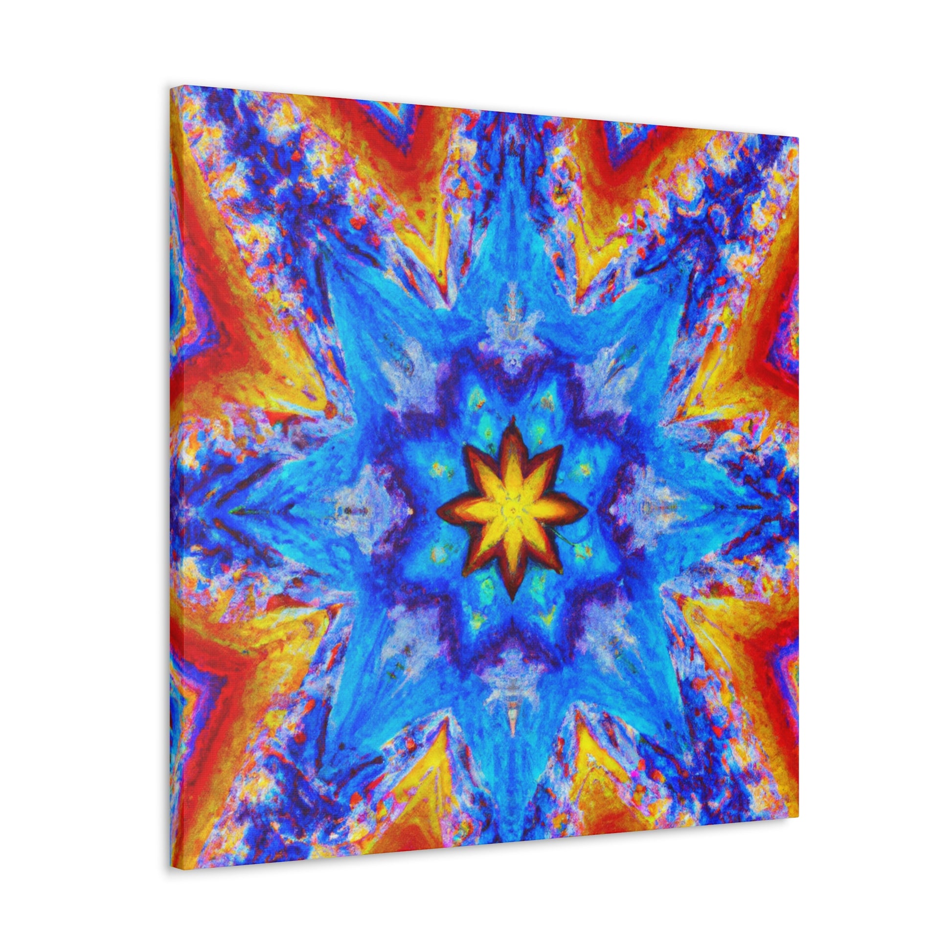This vibrant and abstract digital art canvas will add some energy and life to any space! It features stars, kaleidoscope and abstract shapes in vivid HD colors that are sure to get noticed. With its symmetrical shape, the overall look is both eye-catching and mesmerizing. #trippy #kaleidoscope #abstract #art #digitalart #vibrantcolors #HD #symmetrical #canvas #statementpiece #interiordesign