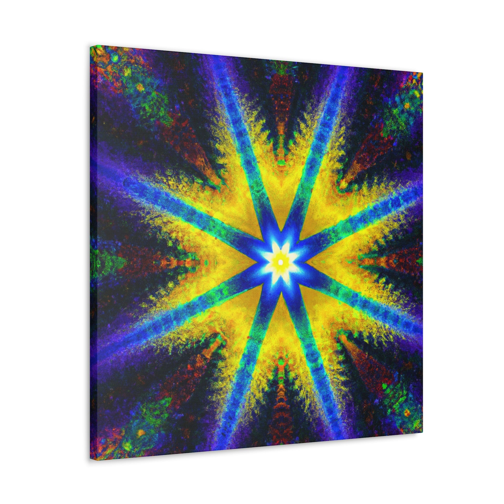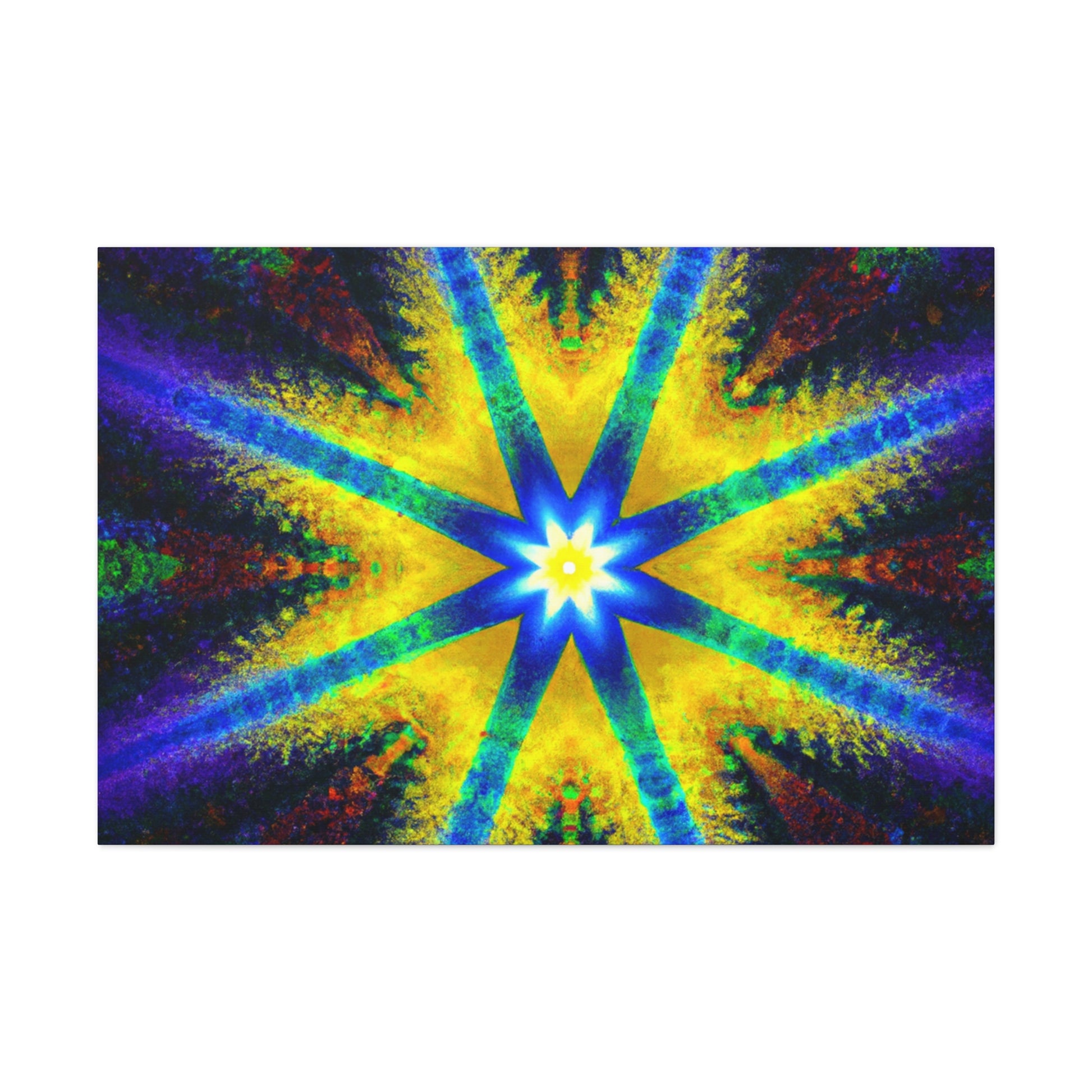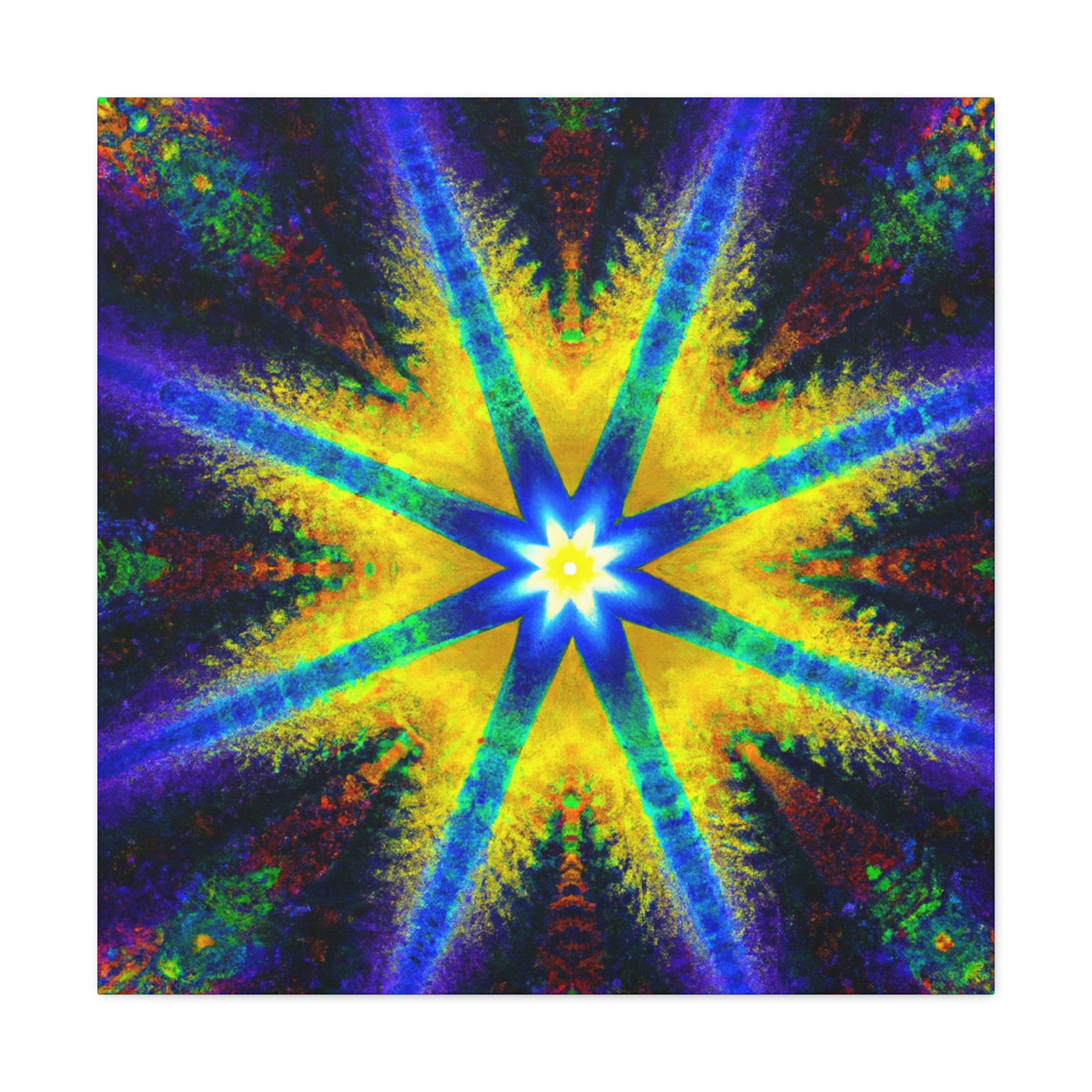 This stunning canvas is a perfect display of abstract digital art featuring a trippy stars, kaleidoscope design with vibrant colors and symmetry. Created with high definition HD, the colors will vividly display on your wall and are sure to make a dramatic statement. #symmetrical #vibrantcolors #trippiestars #digitalart #hd #abstract #kaleidoscope #digitalartist #center #Canvas #statement