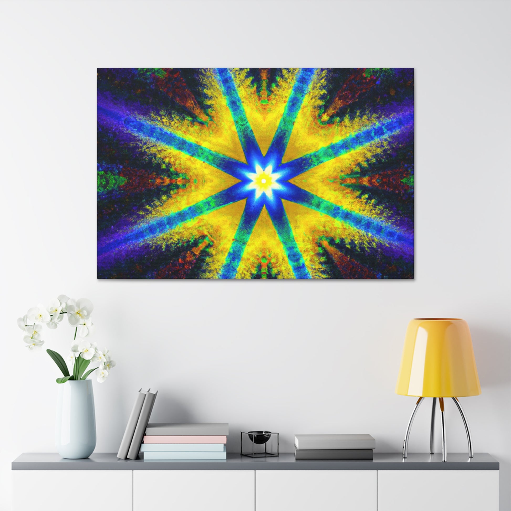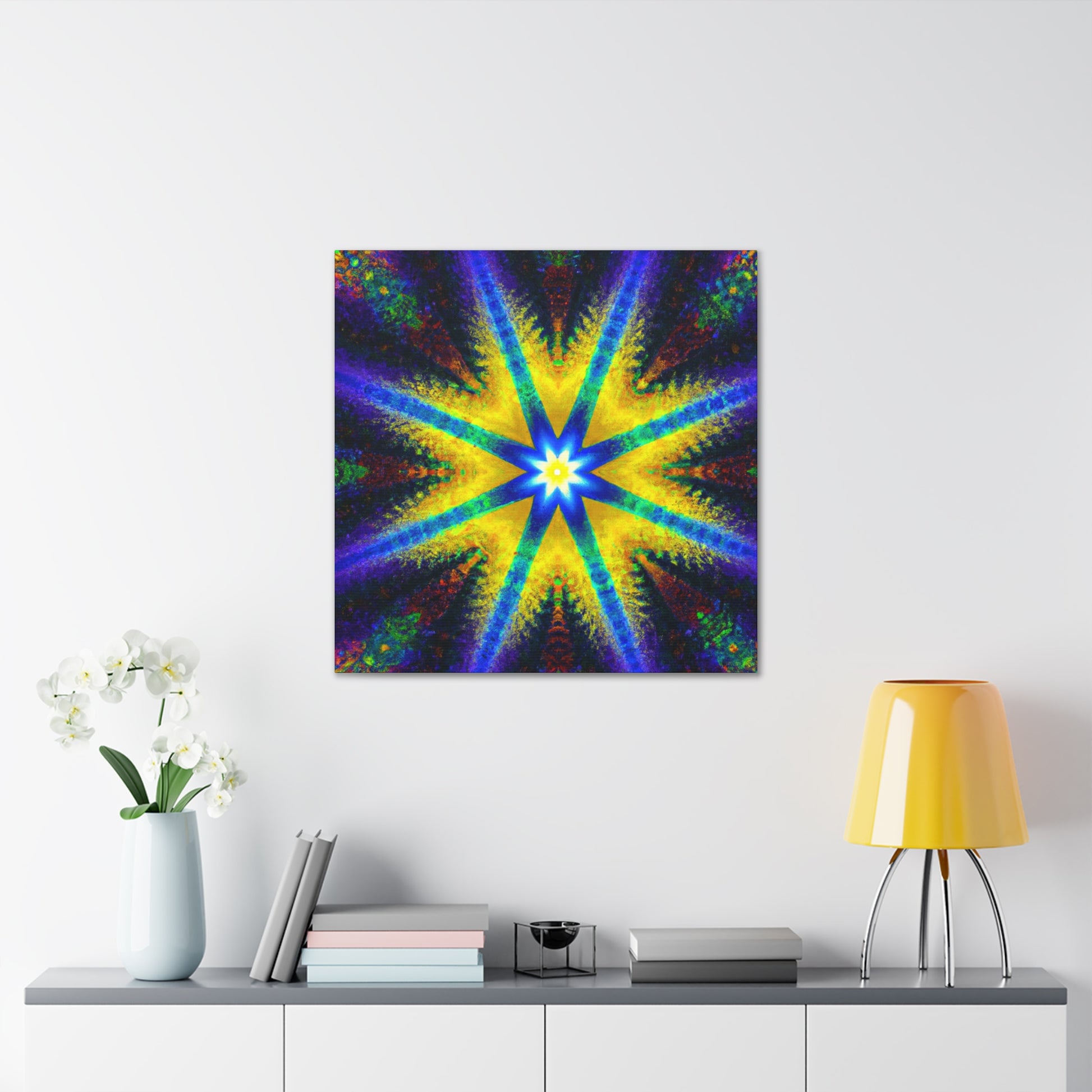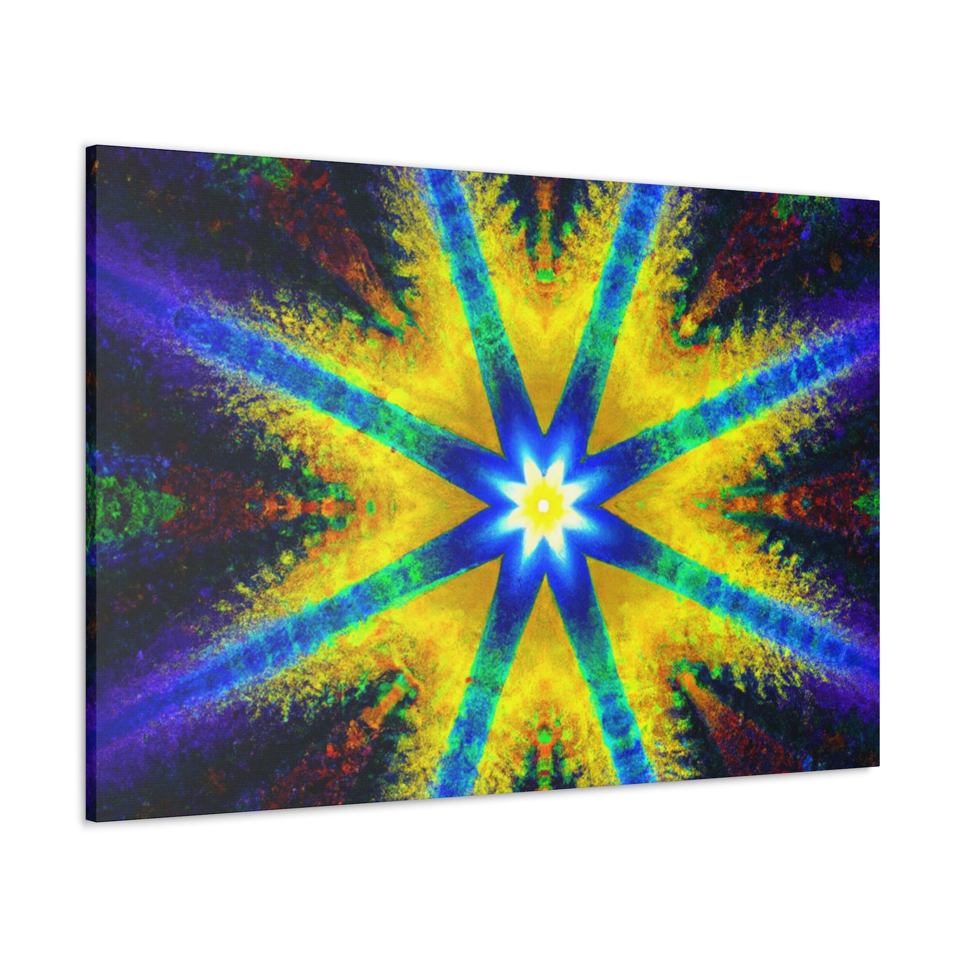 This stunning canvas is a perfect display of abstract digital art featuring a trippy stars, kaleidoscope design with vibrant colors and symmetry. Created with high definition HD, the colors will vividly display on your wall and are sure to make a dramatic statement. #symmetrical #vibrantcolors #trippiestars #digitalart #hd #abstract #kaleidoscope #digitalartist #center #Canvas #statement