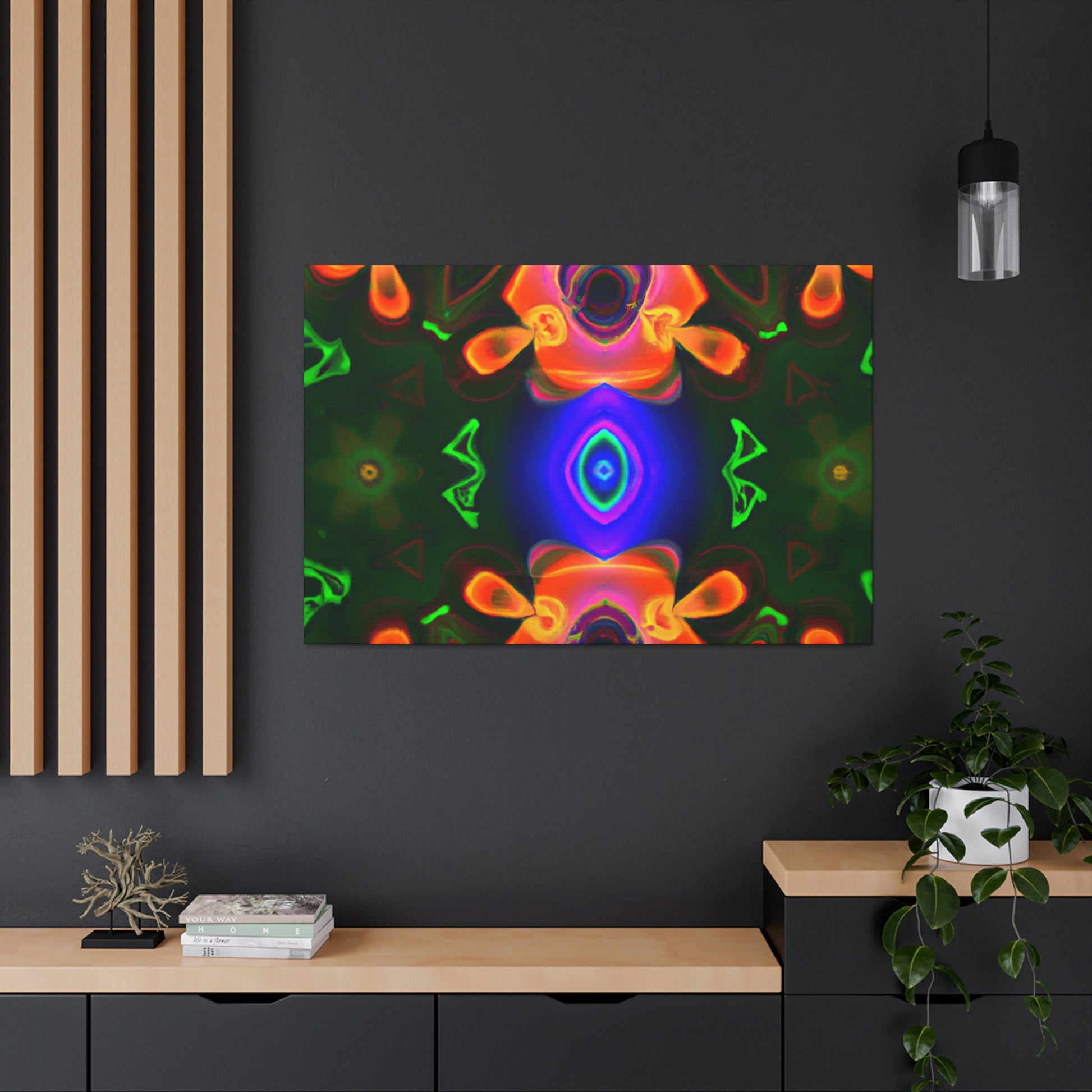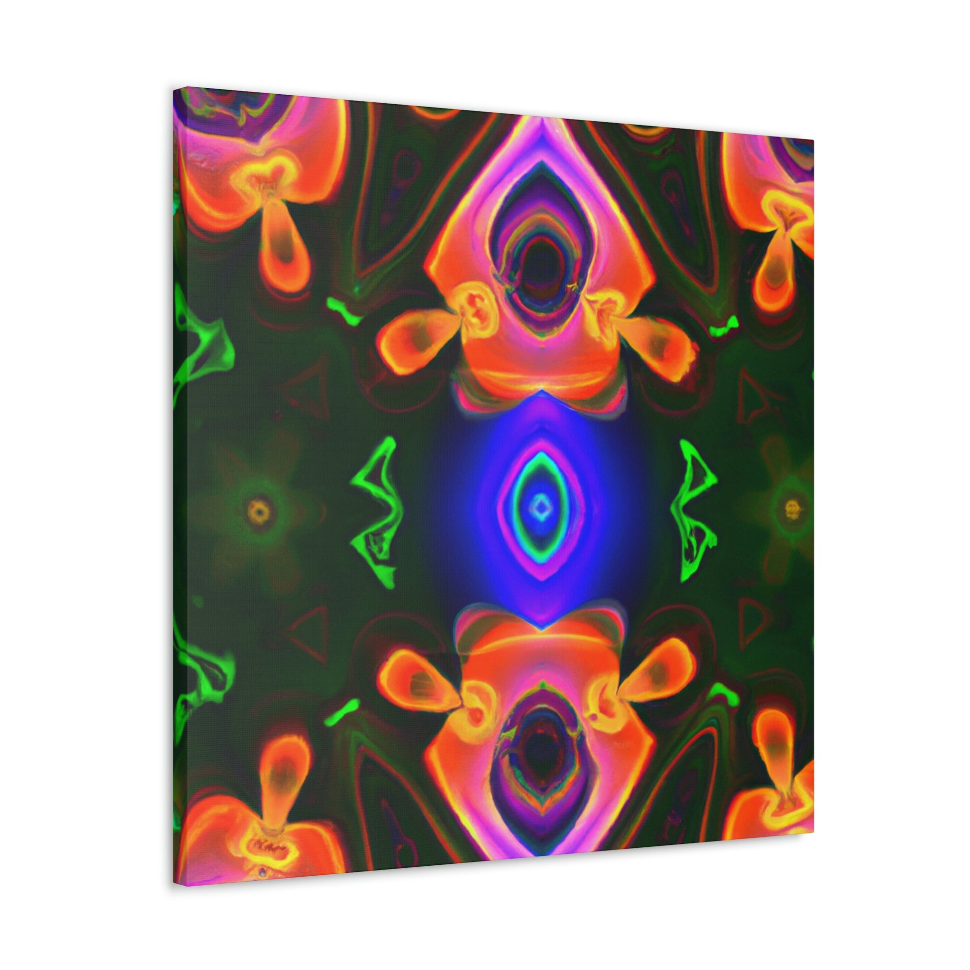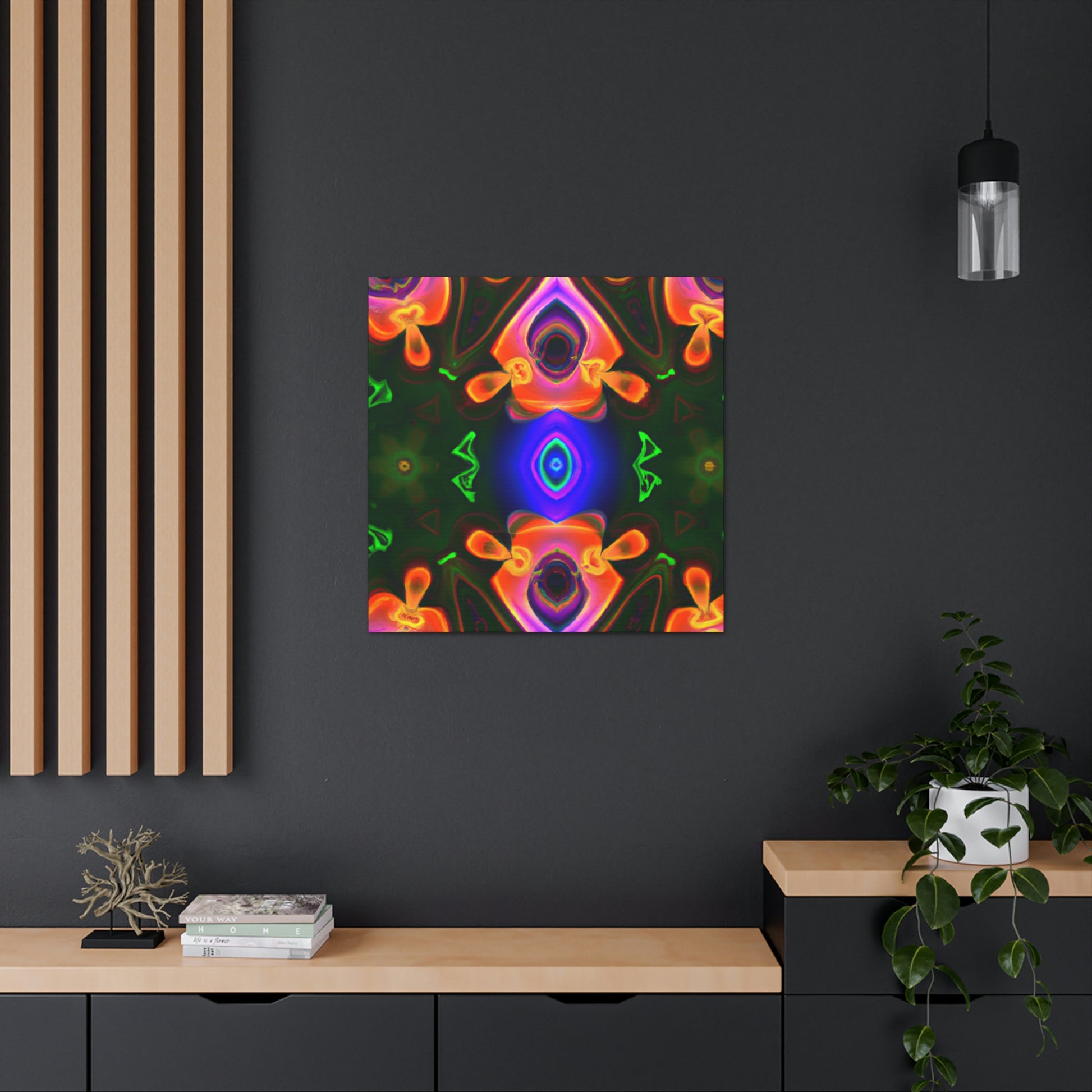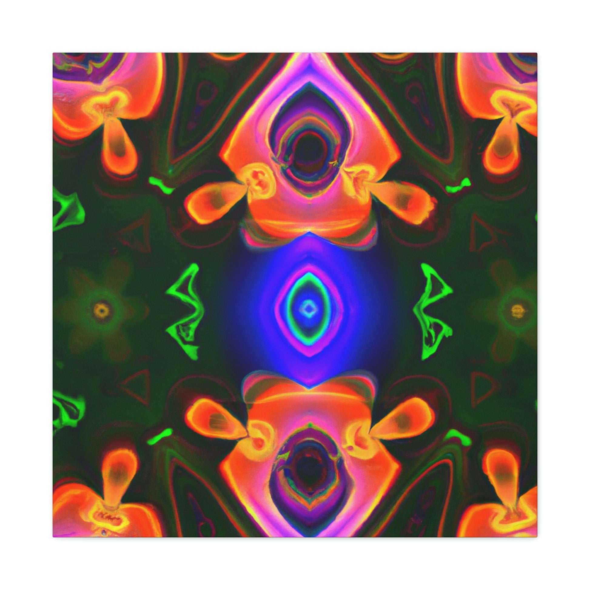 This one-of-a-kind canvas will transport you to another world! Featuring trippy mushrooms, kaleidoscope, abstract and digital art, and cyperpunkin designs, this canvas is perfect for any space needing some visual pizzazz. Bright colors, bold patterns, and intricate detailing make this a stunning piece of art and a great conversation starter! #digitalart #trippyart #cyperpunkin #abstractart #canvasart #mushroomart #kaleidoscope #canvasmurals #décorart #wallart #boldart