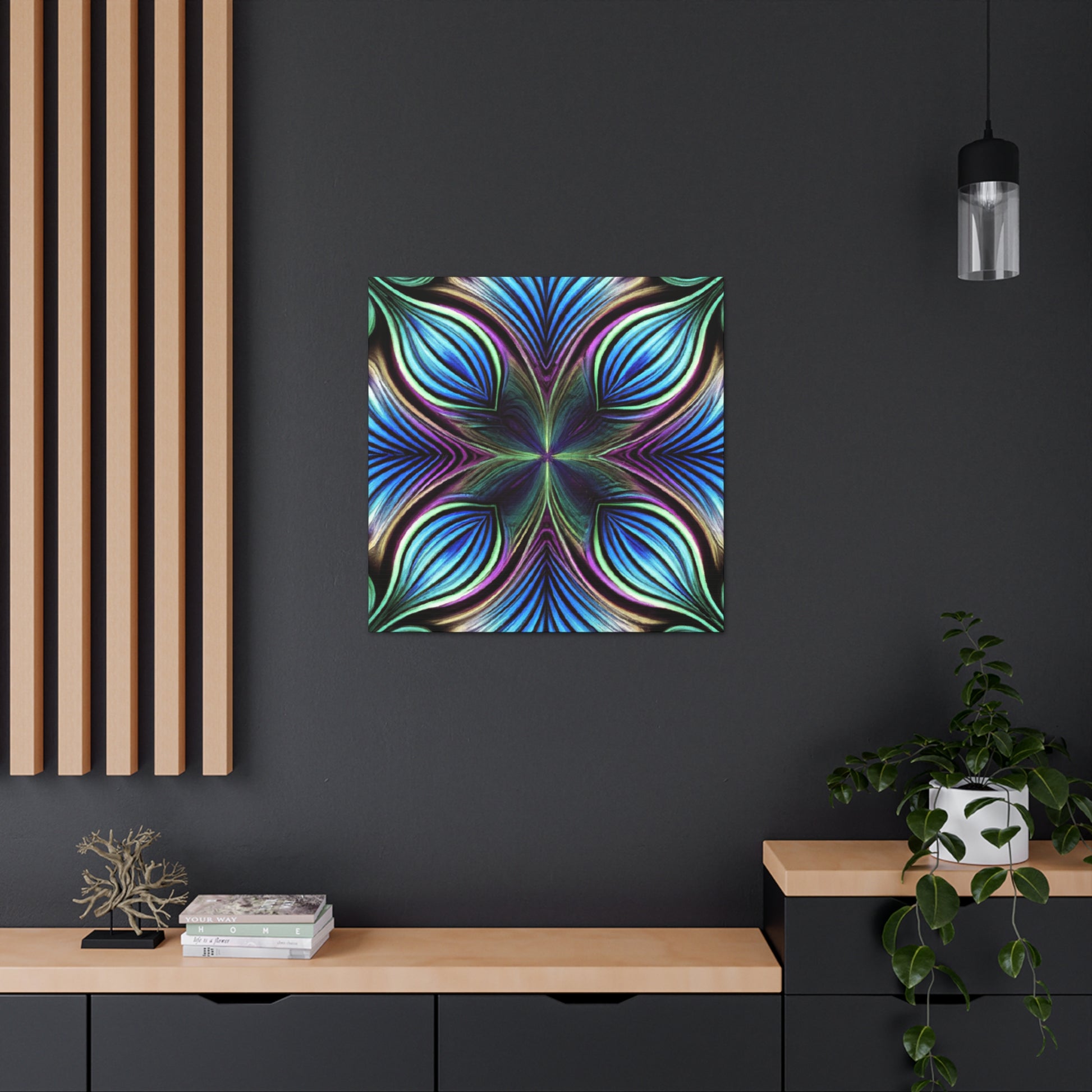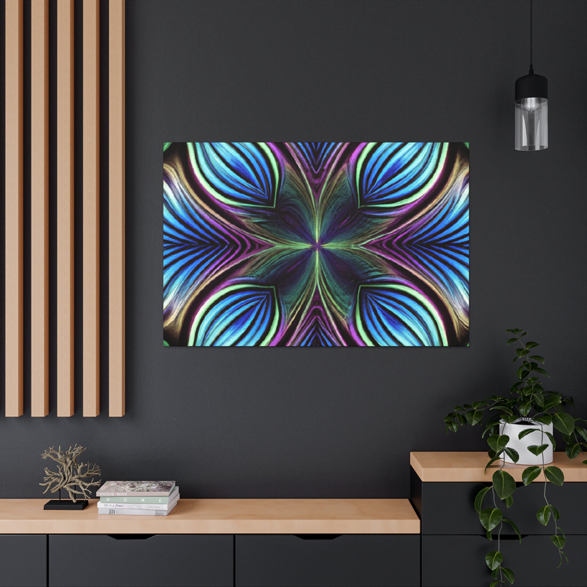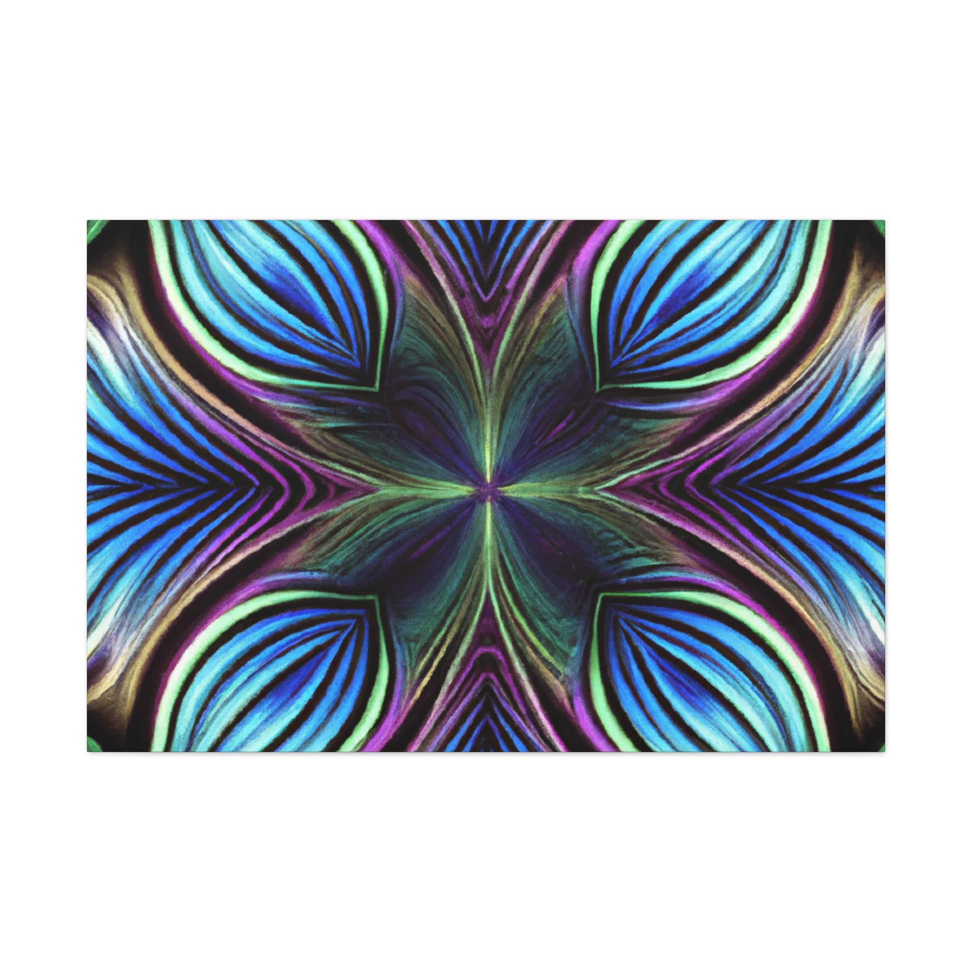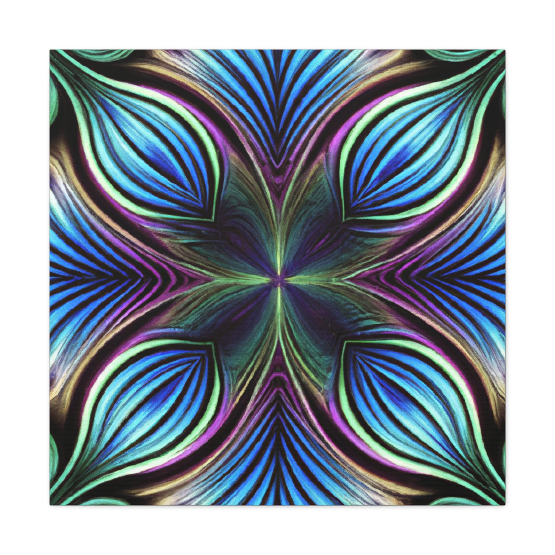This canvas takes artistry to a whole new level. Featuring Trippy geometric palm leaves, kaleidoscope, abstract, digital art, and bright vibrant colors, it captures the beauty of a 3D lined fractal. This piece is eye-catching and stimulating, making it the perfect accent to decorate any room. #trippyart #geometricart #kaleidoscopeart #abstractart #digitalart #vibrantcolors #3Dlines #fractals #modernart #palmleaves #decoration
