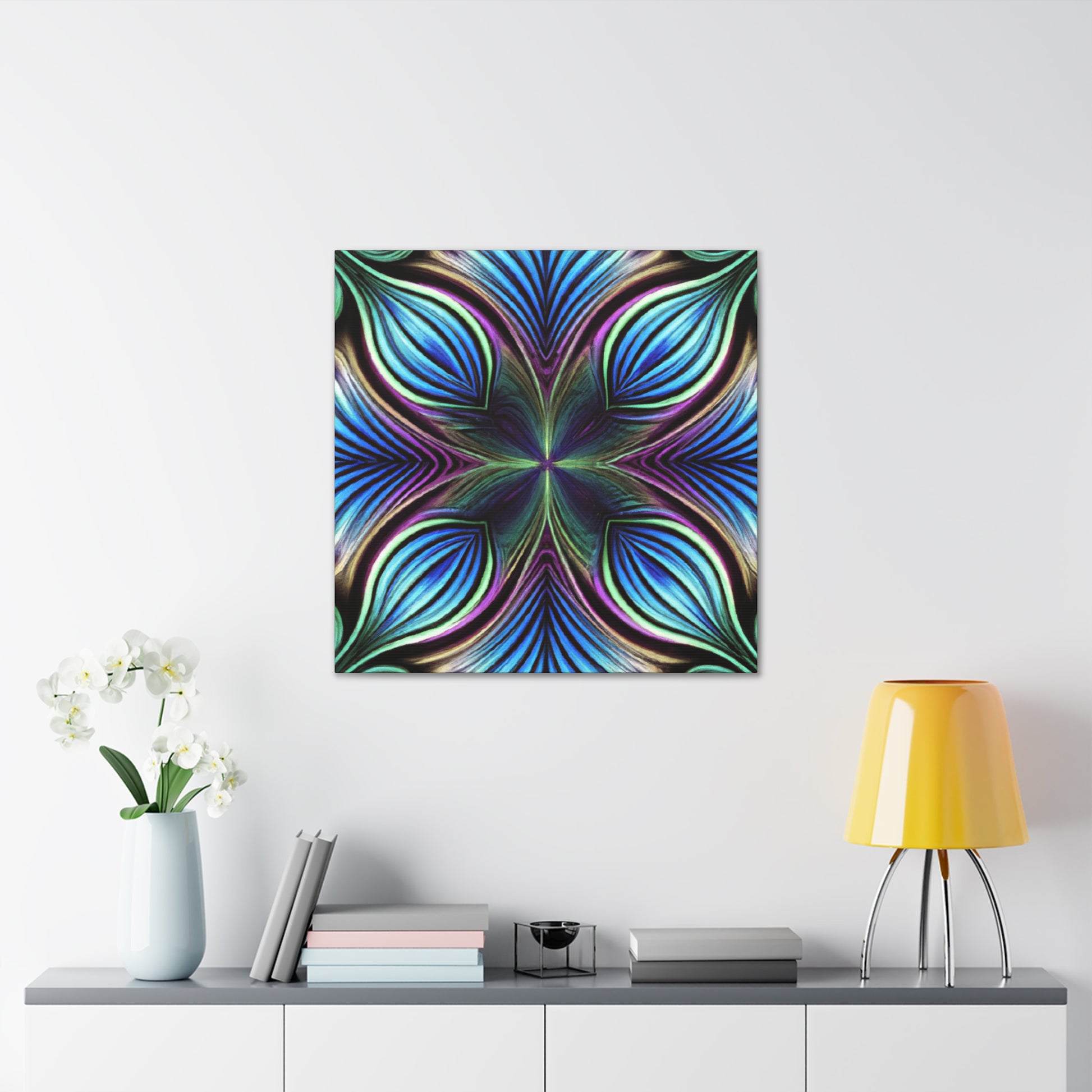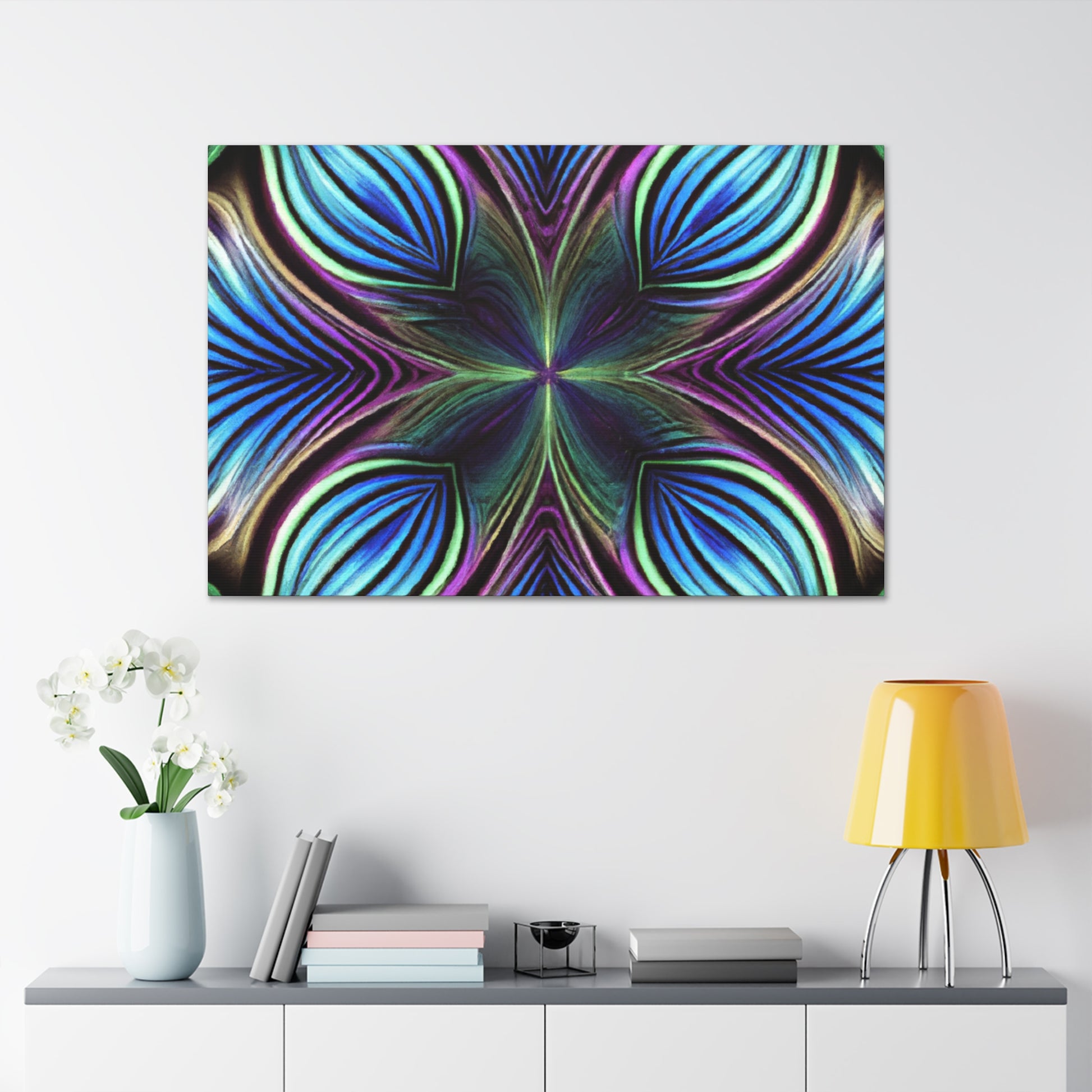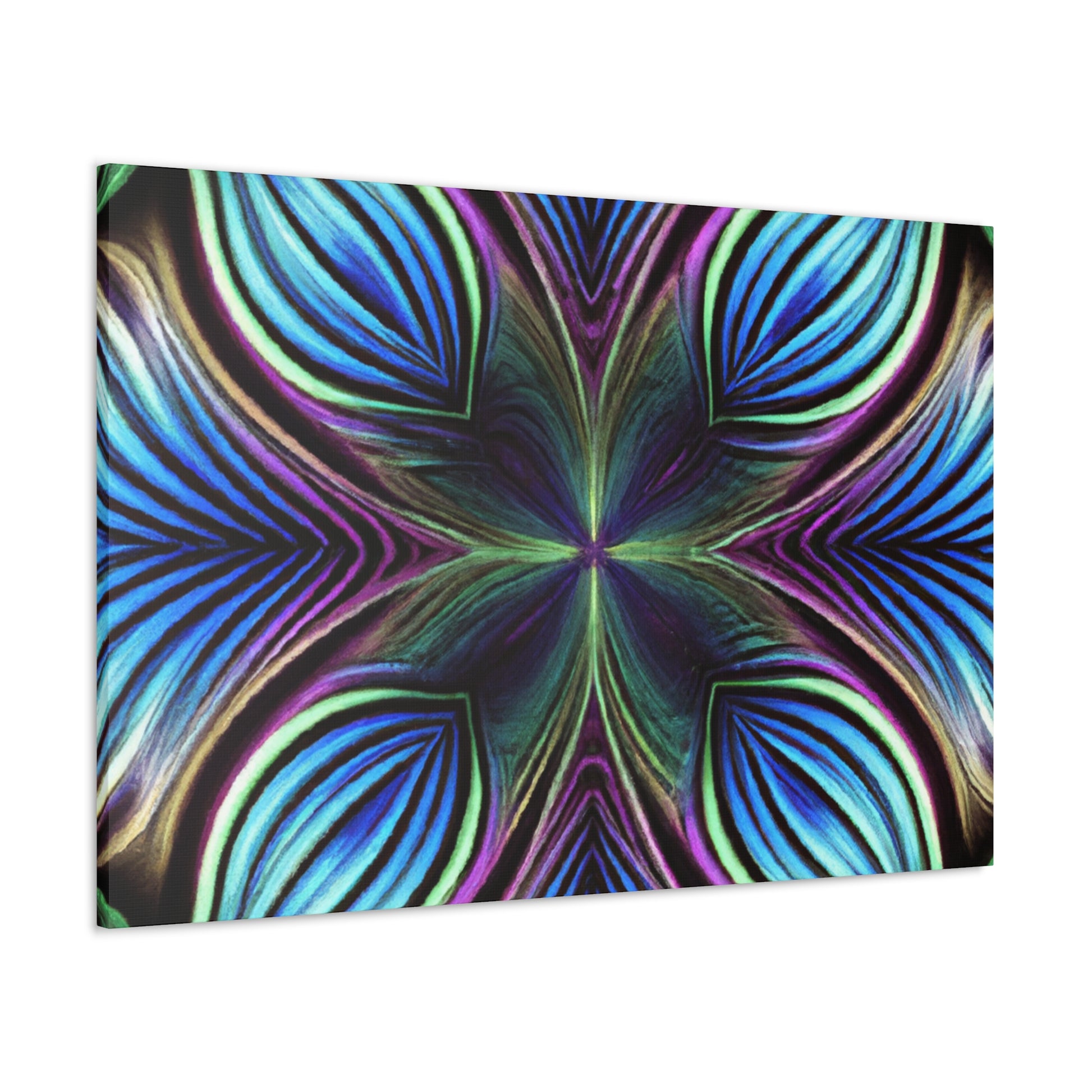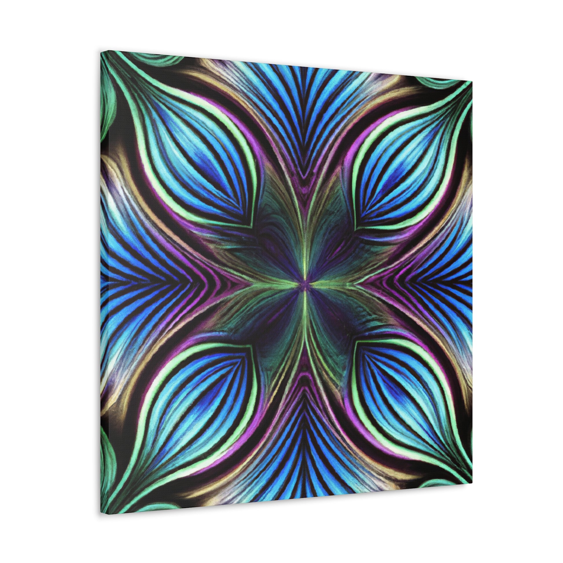 This canvas takes artistry to a whole new level. Featuring Trippy geometric palm leaves, kaleidoscope, abstract, digital art, and bright vibrant colors, it captures the beauty of a 3D lined fractal. This piece is eye-catching and stimulating, making it the perfect accent to decorate any room. #trippyart #geometricart #kaleidoscopeart #abstractart #digitalart #vibrantcolors #3Dlines #fractals #modernart #palmleaves #decoration