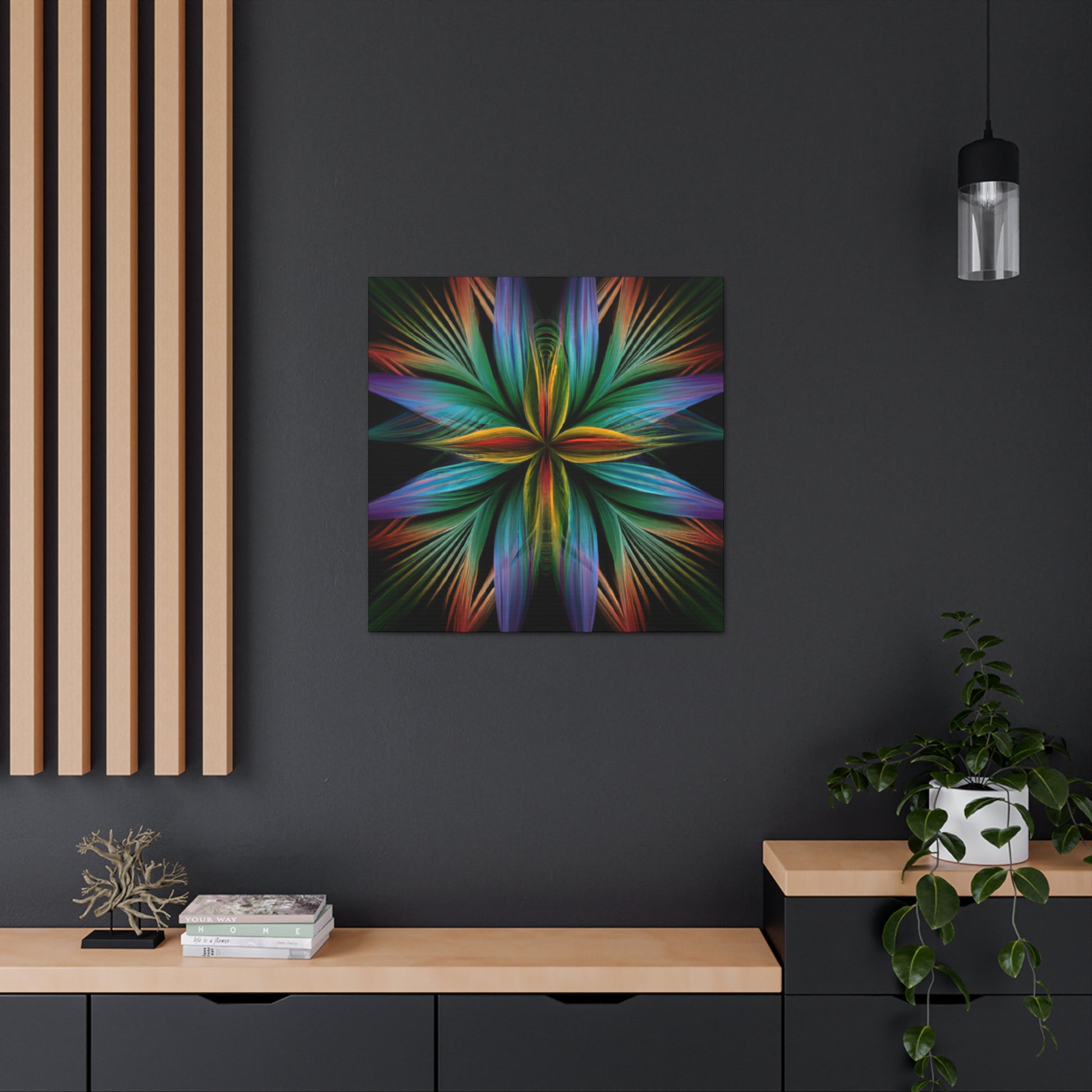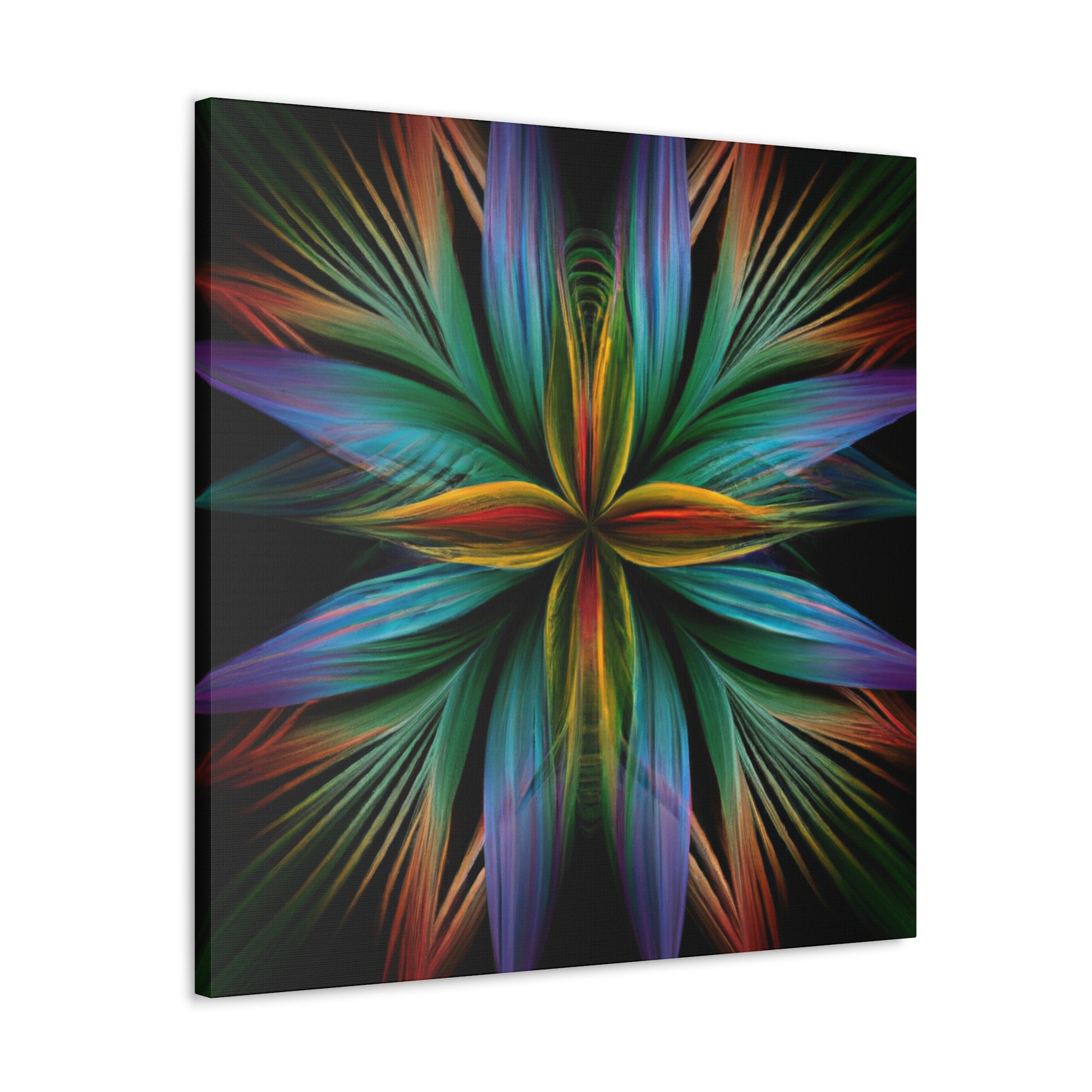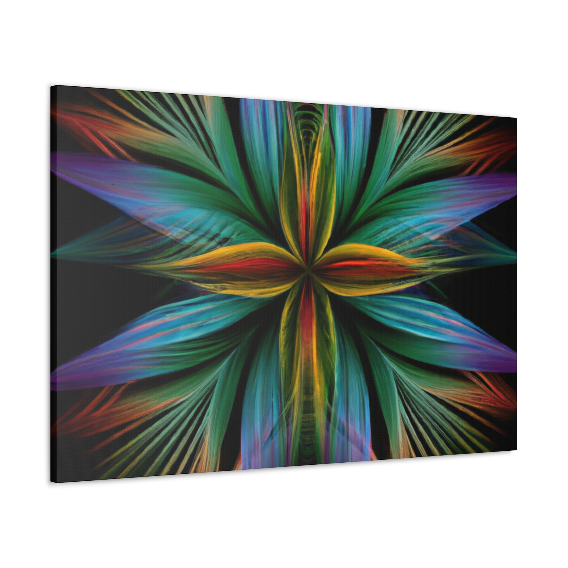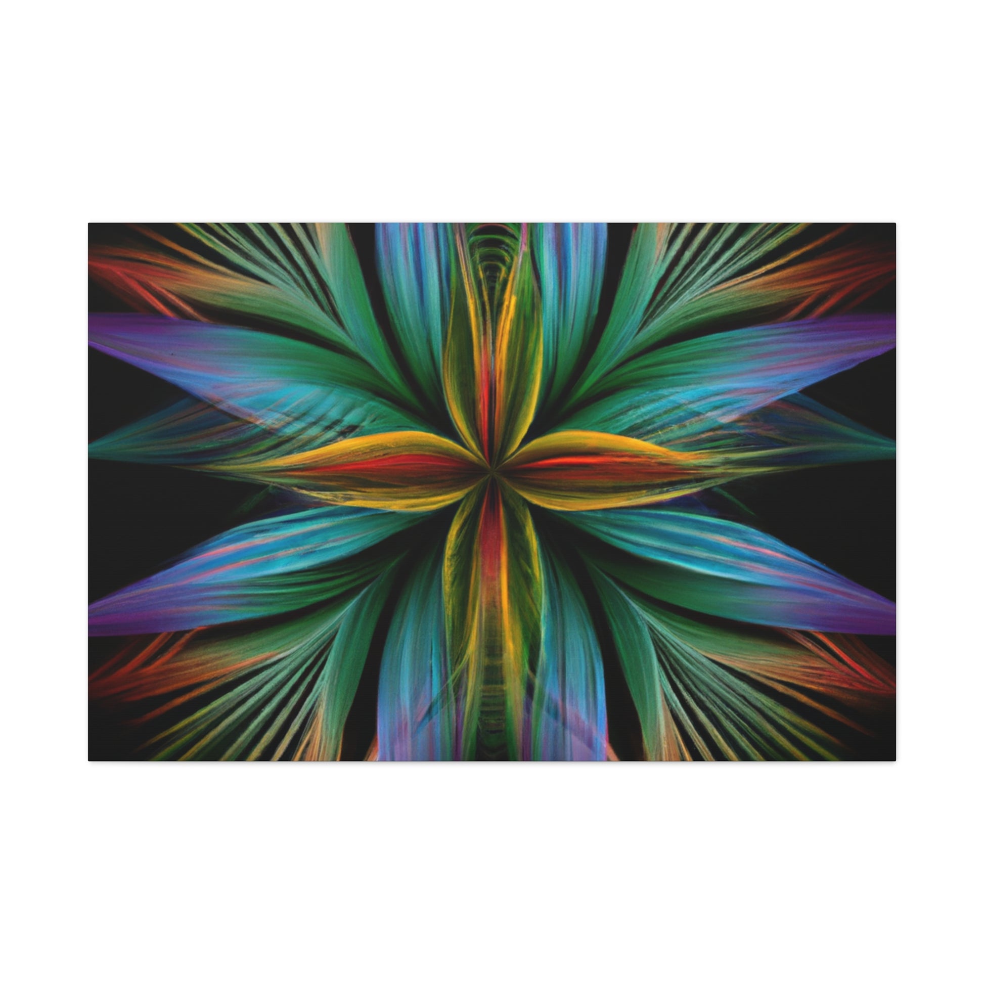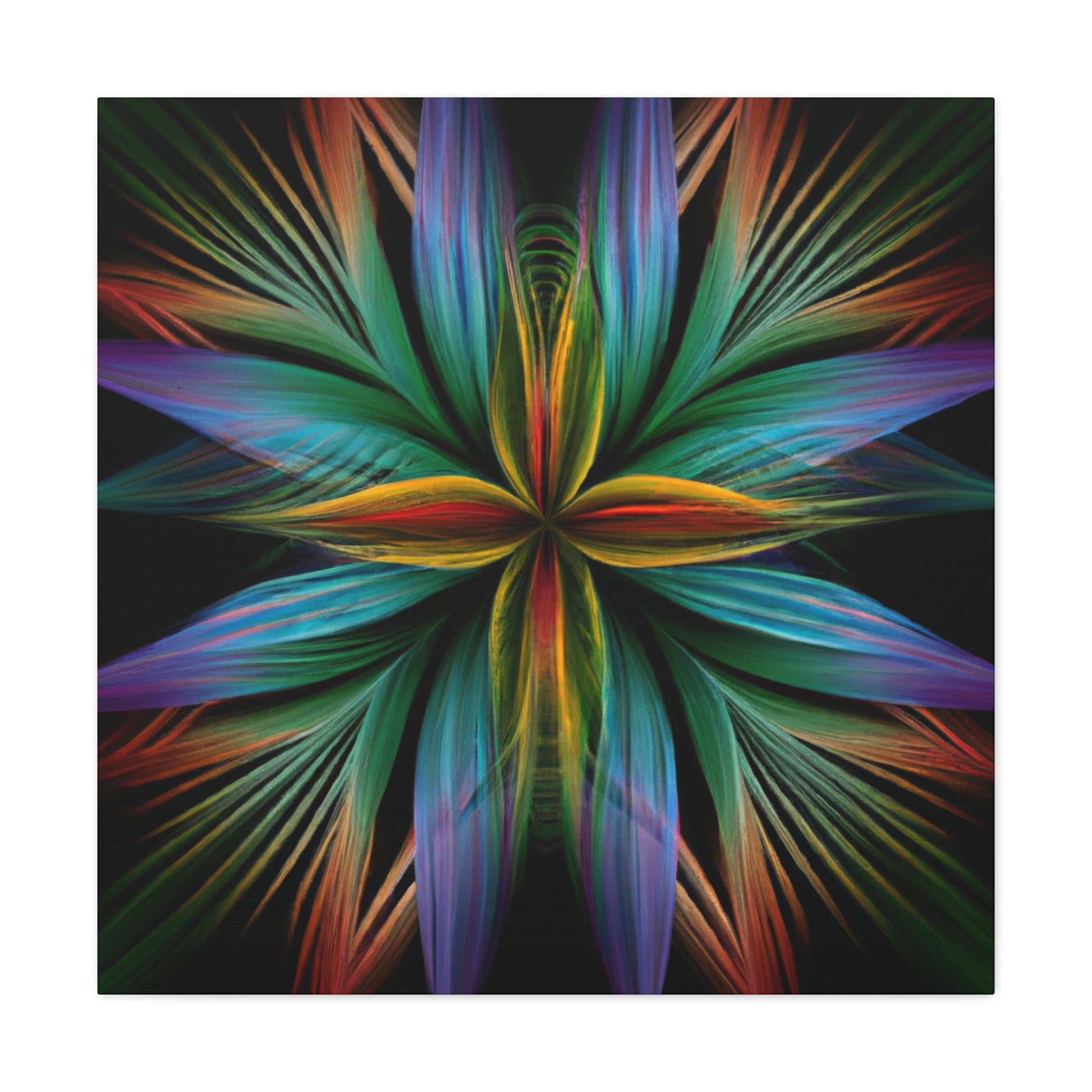 This canvas of Trippy geometric palm leaves, kaleidoscope, abstract, digital art, vibrant colors, 3D lines, and fractal, is sure to make a statement in any room! It's vibrant colors create an eye-catching visual, while abstract shapes and fractal transforms it into a piece of wall art that will always stand out! This canvas is perfect for anyone who loves a unique and daring design that will always captivate and mesmerize! #abstractart #digitalart #3Dlines #fractal #kaleidoscope #vibrantcolors #trippy #geometricpalmleaves #canvasart #muralart