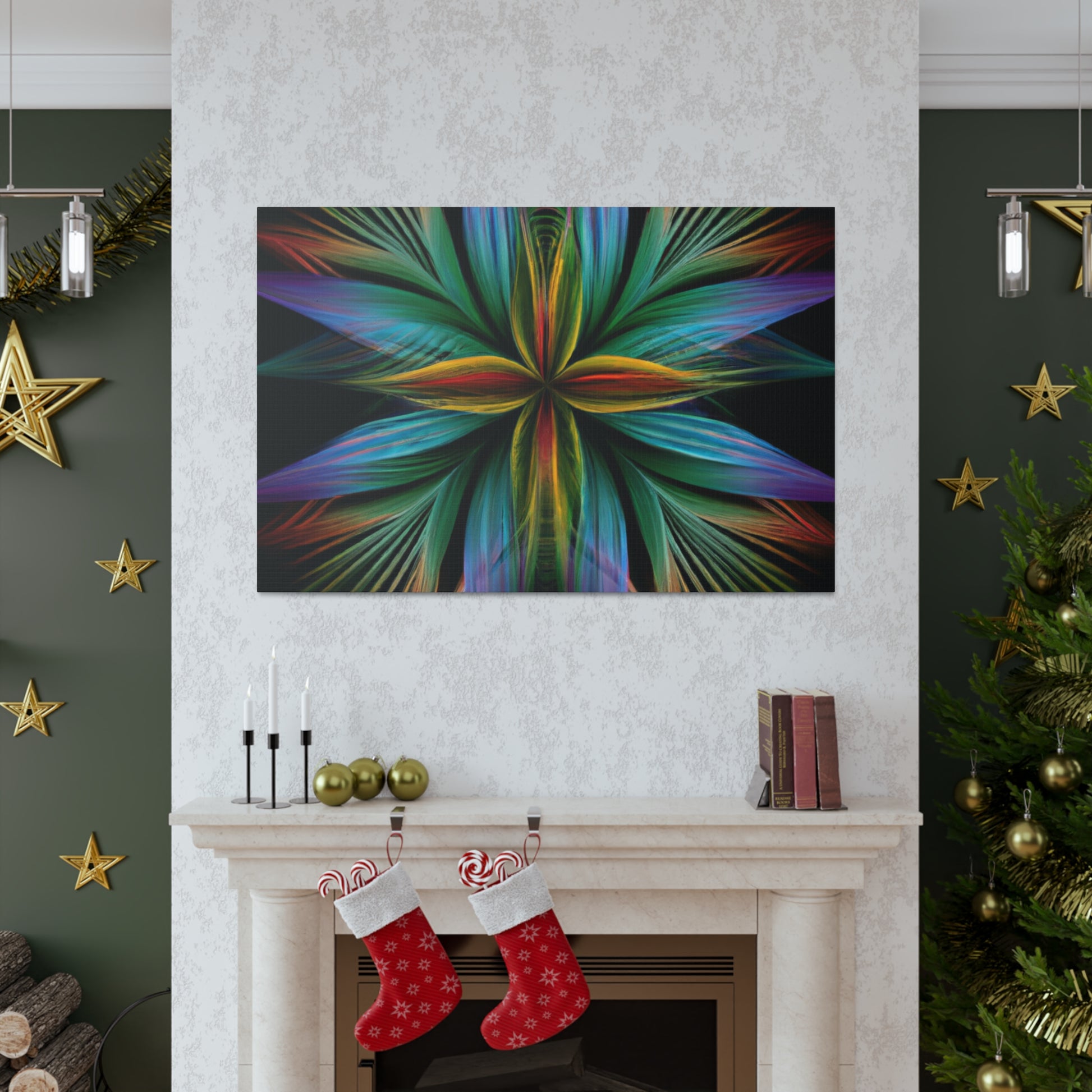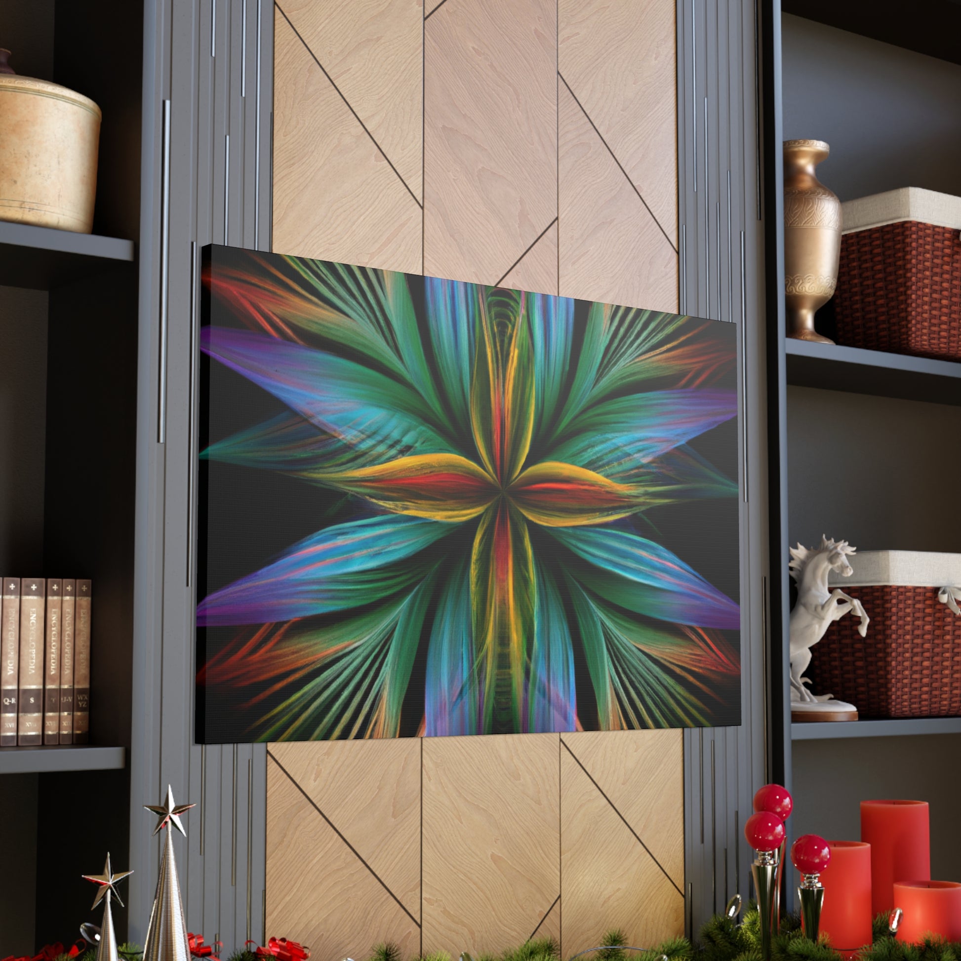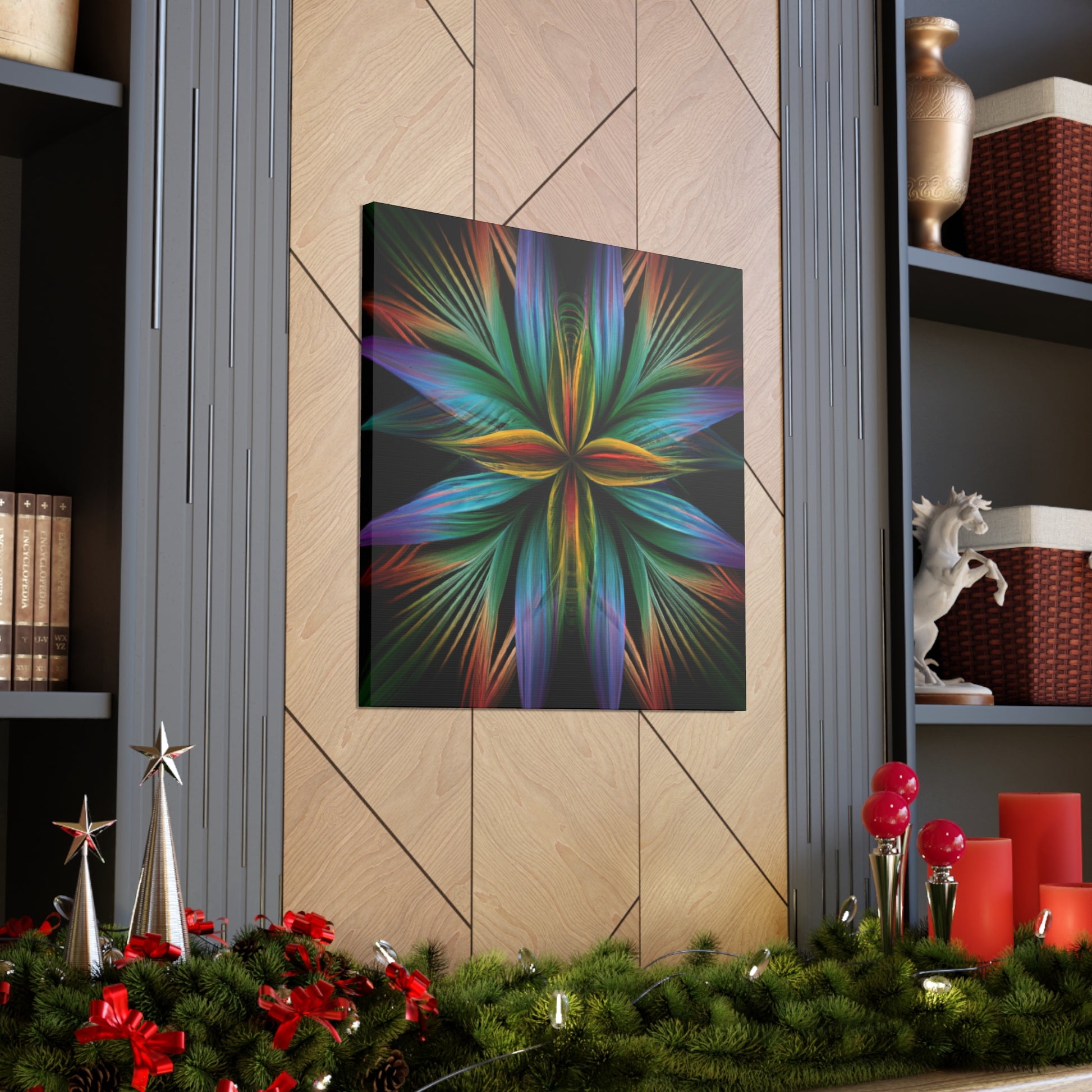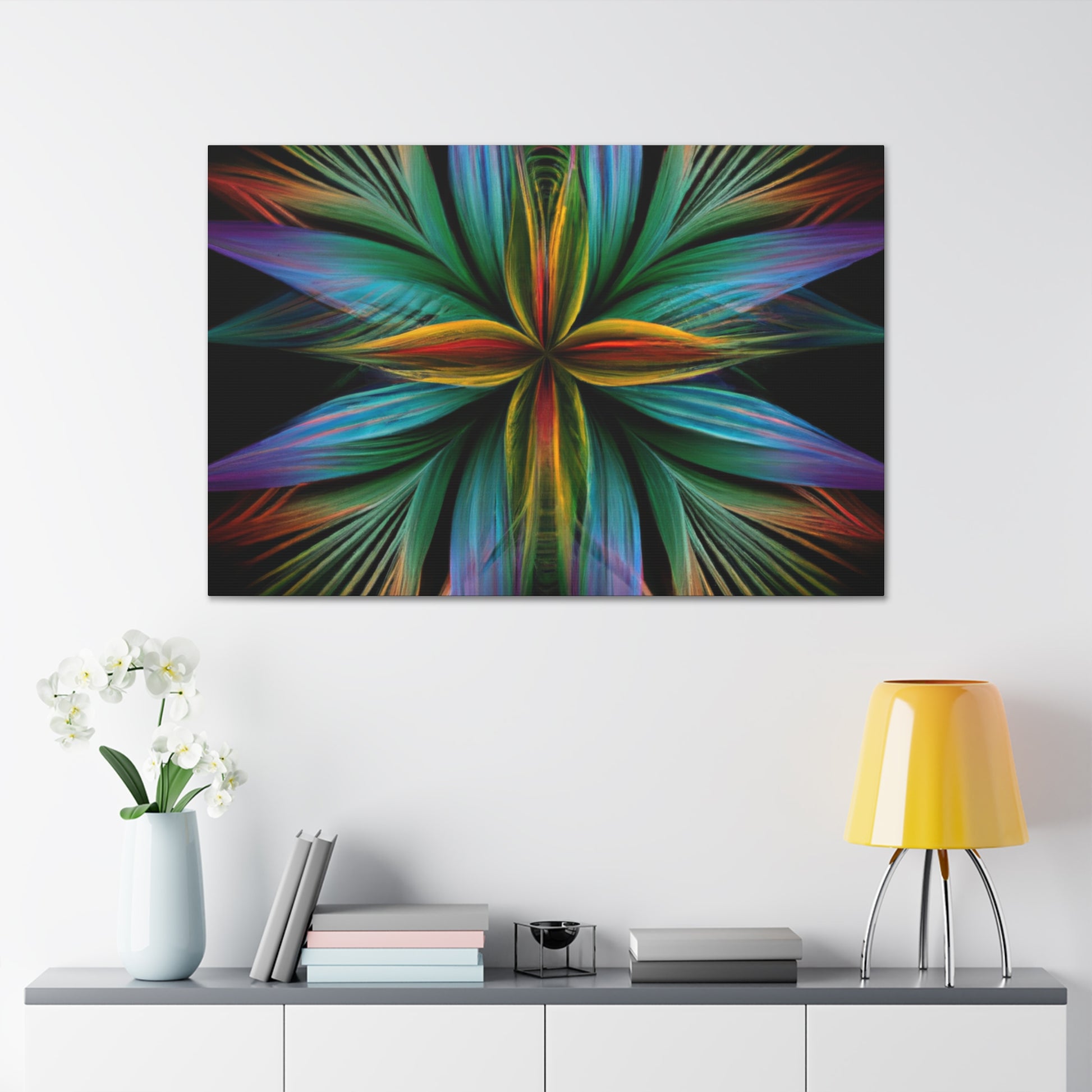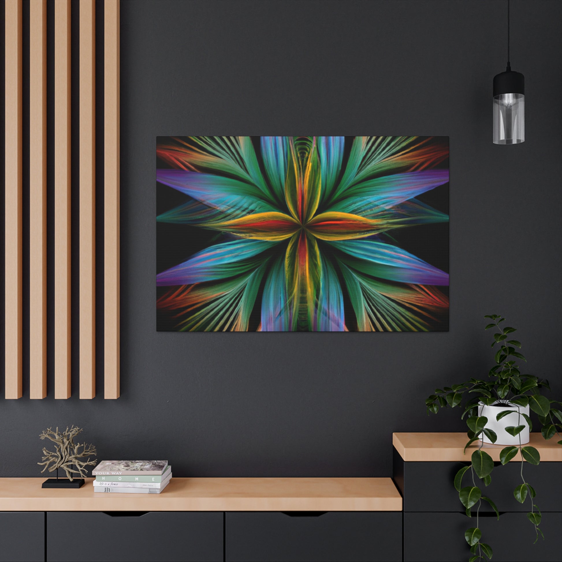 This canvas of Trippy geometric palm leaves, kaleidoscope, abstract, digital art, vibrant colors, 3D lines, and fractal, is sure to make a statement in any room! It's vibrant colors create an eye-catching visual, while abstract shapes and fractal transforms it into a piece of wall art that will always stand out! This canvas is perfect for anyone who loves a unique and daring design that will always captivate and mesmerize! #abstractart #digitalart #3Dlines #fractal #kaleidoscope #vibrantcolors #trippy #geometricpalmleaves #canvasart #muralart